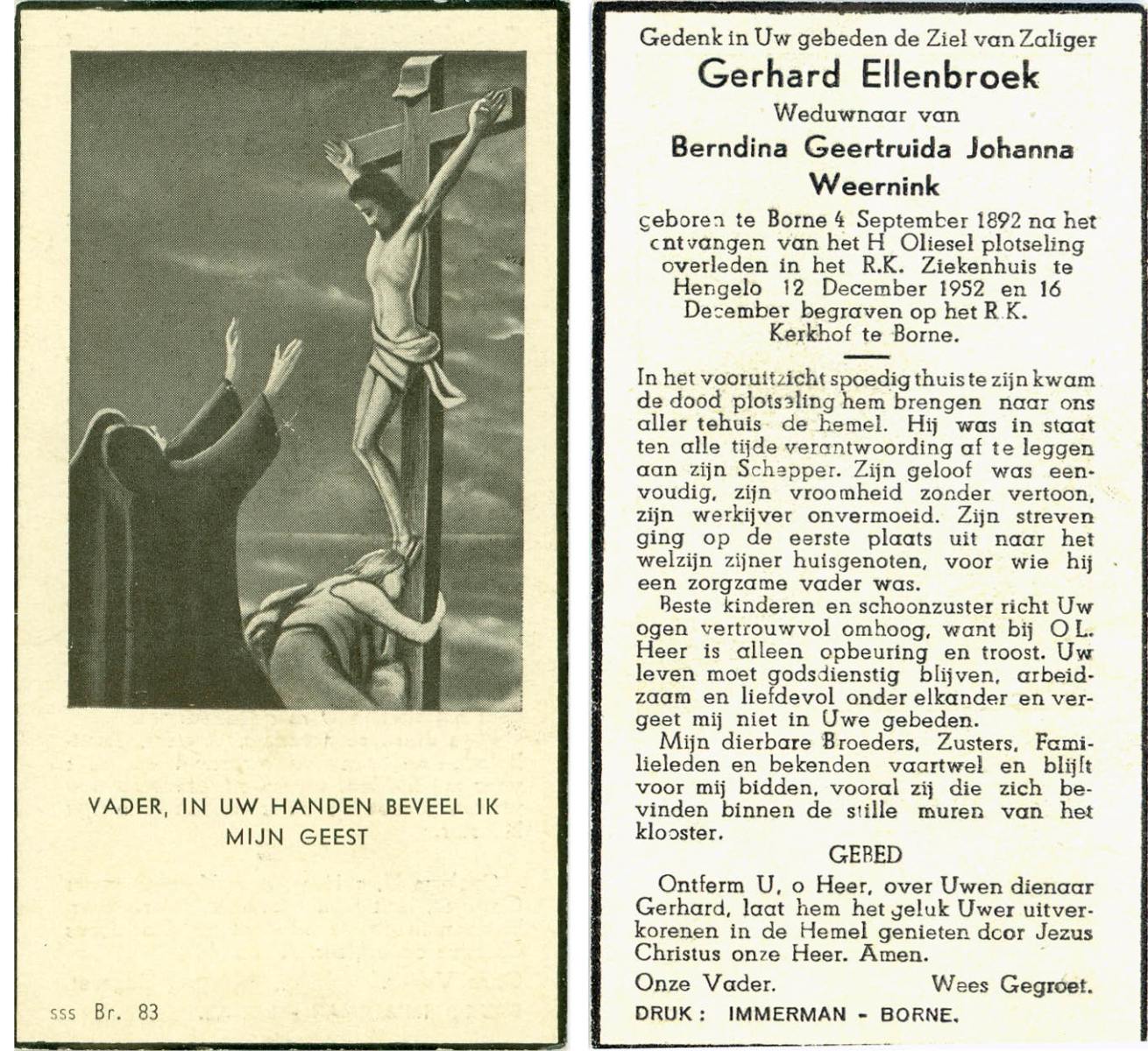 ELLENBROEK, Gerhard, geboren op 04-09-1892 te Borne, overleden op 12-12-1952 te Hengelo (Ov.) op 60-jarige leeftijd, begraven op 16-12-1952 te Borne.