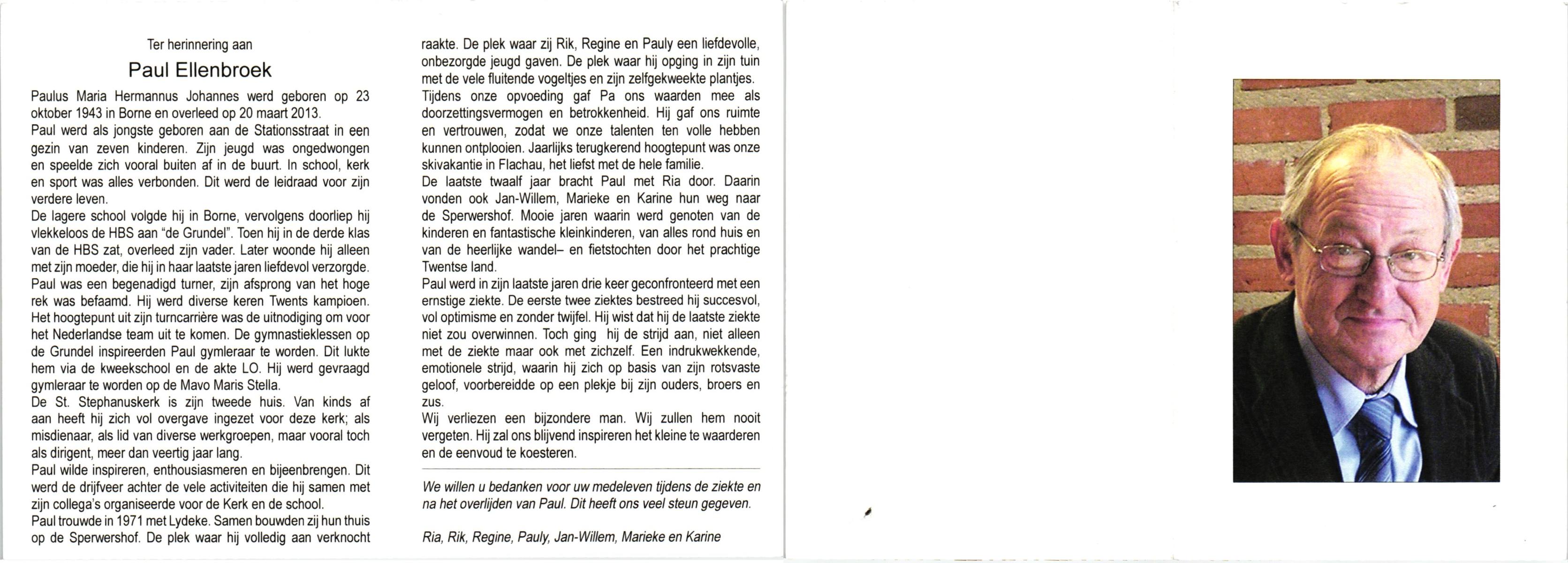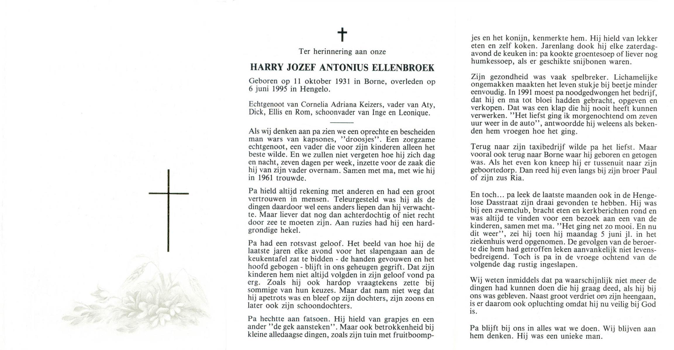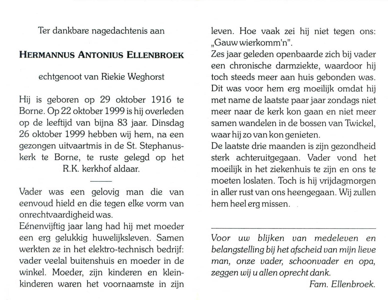 ELLENBROEK, Hermannus Antonius, geboren op 29-10-1916 te Borne, overleden op 22-10-1999 op 82-jarige leeftijd, begraven op 26-10-1999 te Borne.