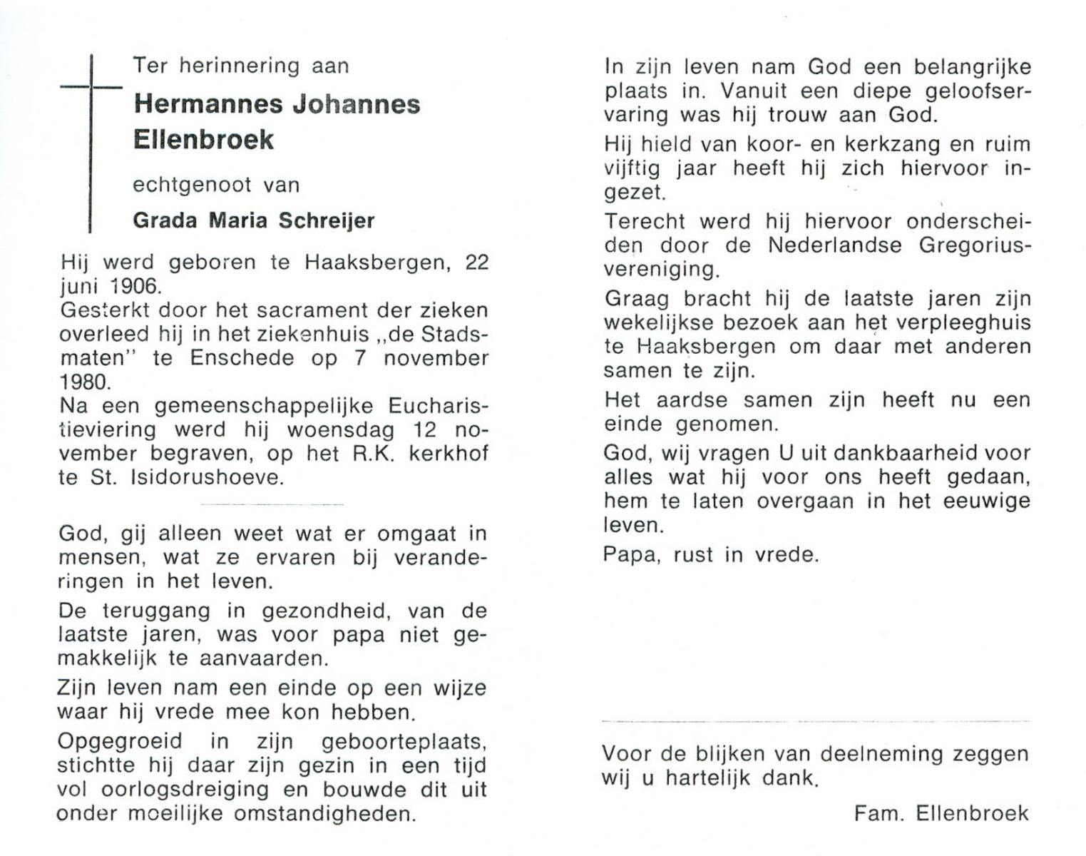 ELLENBROEK, Hermannes Johannes, geboren op 22-6-1906 te Haaksbergen, overleden op 7-11-1980 te Enschede op 74-jarige leeftijd, begraven op 12-11-1980 te St. Isidorushoeve.