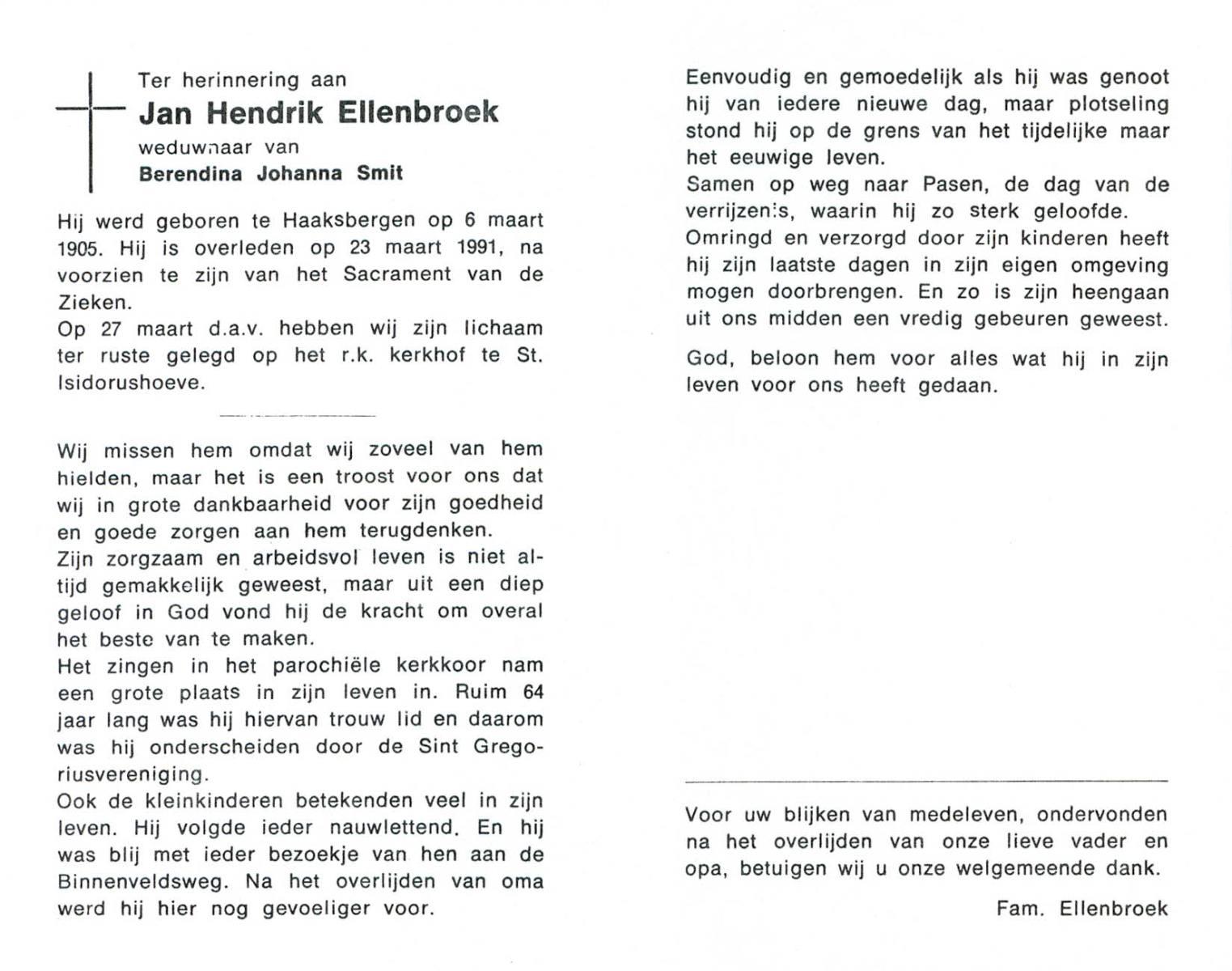 ELLENBROEK, Jan Hendrik, geboren op 6-3-1905 te Haaksbergen, overleden op 23-3-1991 op 86-jarige leeftijd, begraven op 27-3-1991 te St.Isidorushoeve.