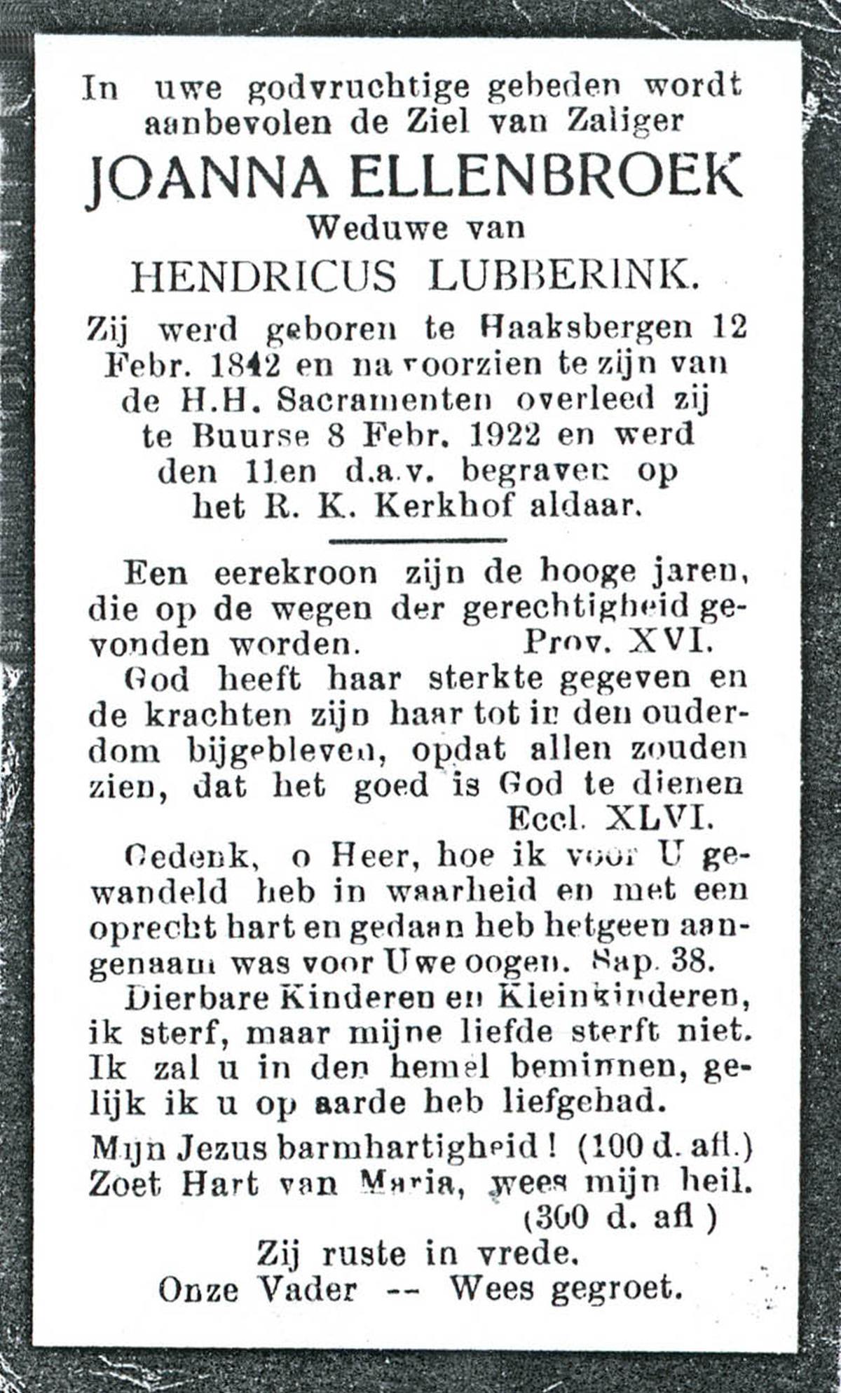 ELLENBROEK, Joanna, geboren op 12-02-1842 te Haaksbergen, overleden op 8-2-1922 te Buurse op 79-jarige leeftijd, begraven op 11-2-1922 te Buurse.