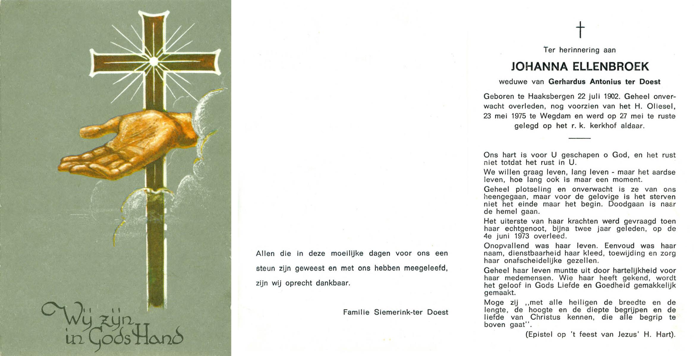 ELLENBROEK, Johanna, geboren op 22-7-1902 te Haaksbergen, overleden op 23-5-1975 te Wegdam op 72-jarige leeftijd, begraven op 27-5-1975 te Wegdam.