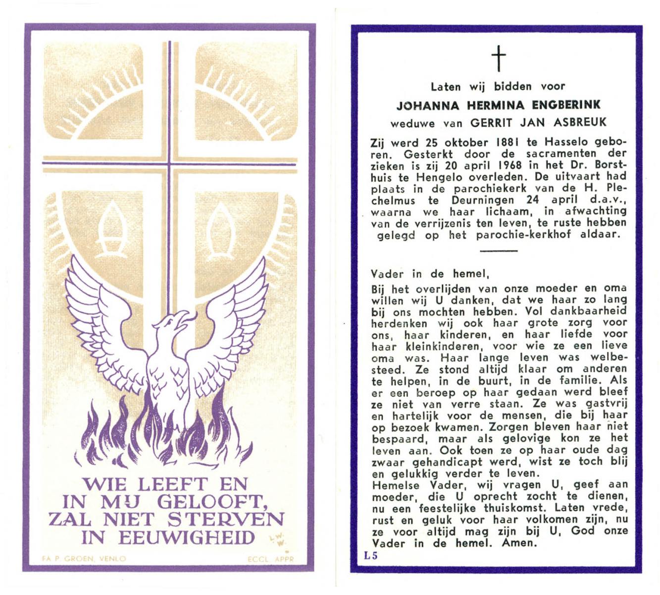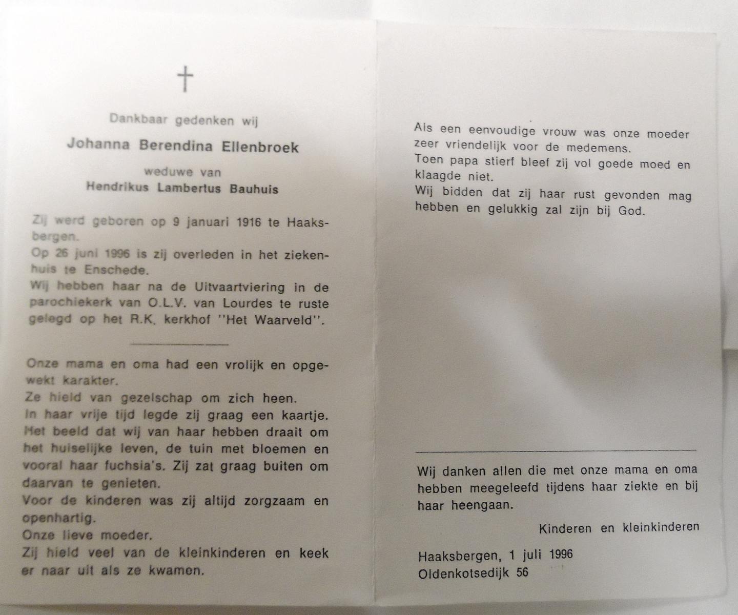 ELLENBROEK, Johanna Berendina, geboren op 9-1-1916 te Haaksbergen, overleden op 26-6-1996 te Enschede op 80-jarige leeftijd, begraven op 1-7-1996 te Haaksbergen, Het Waarveld.