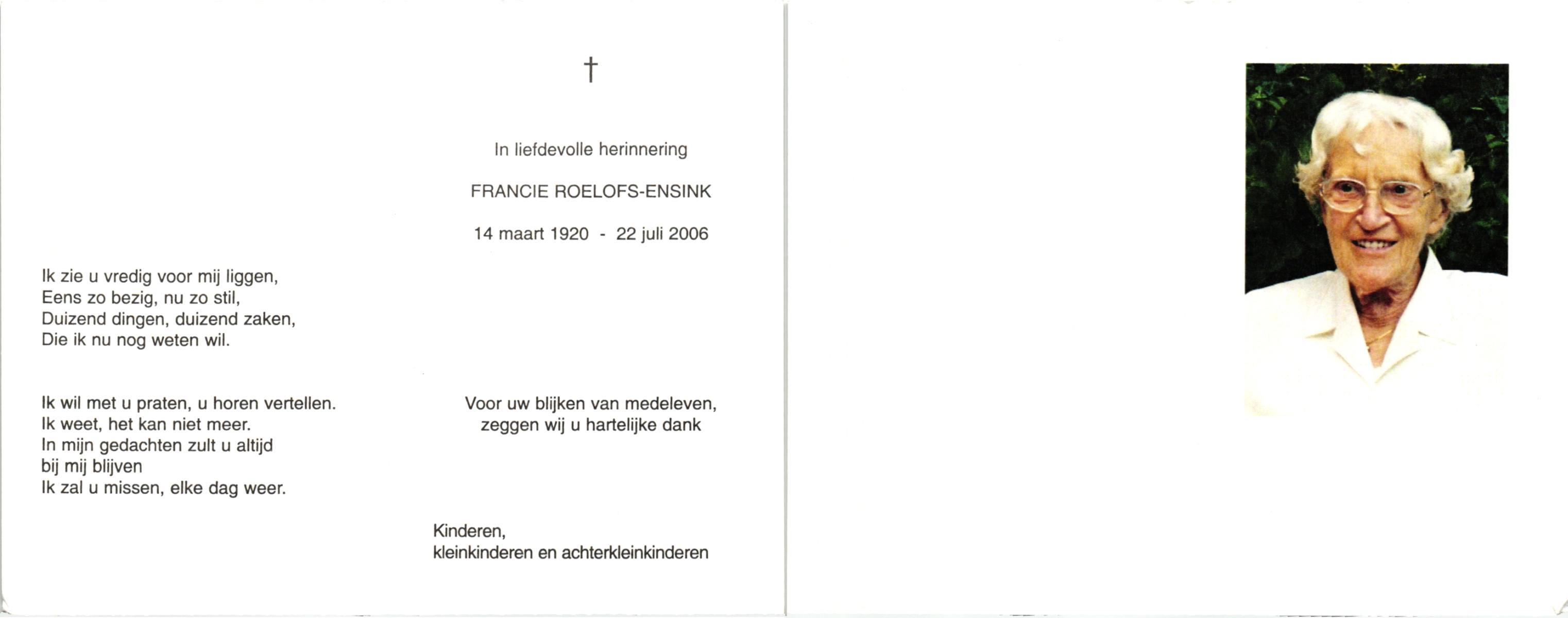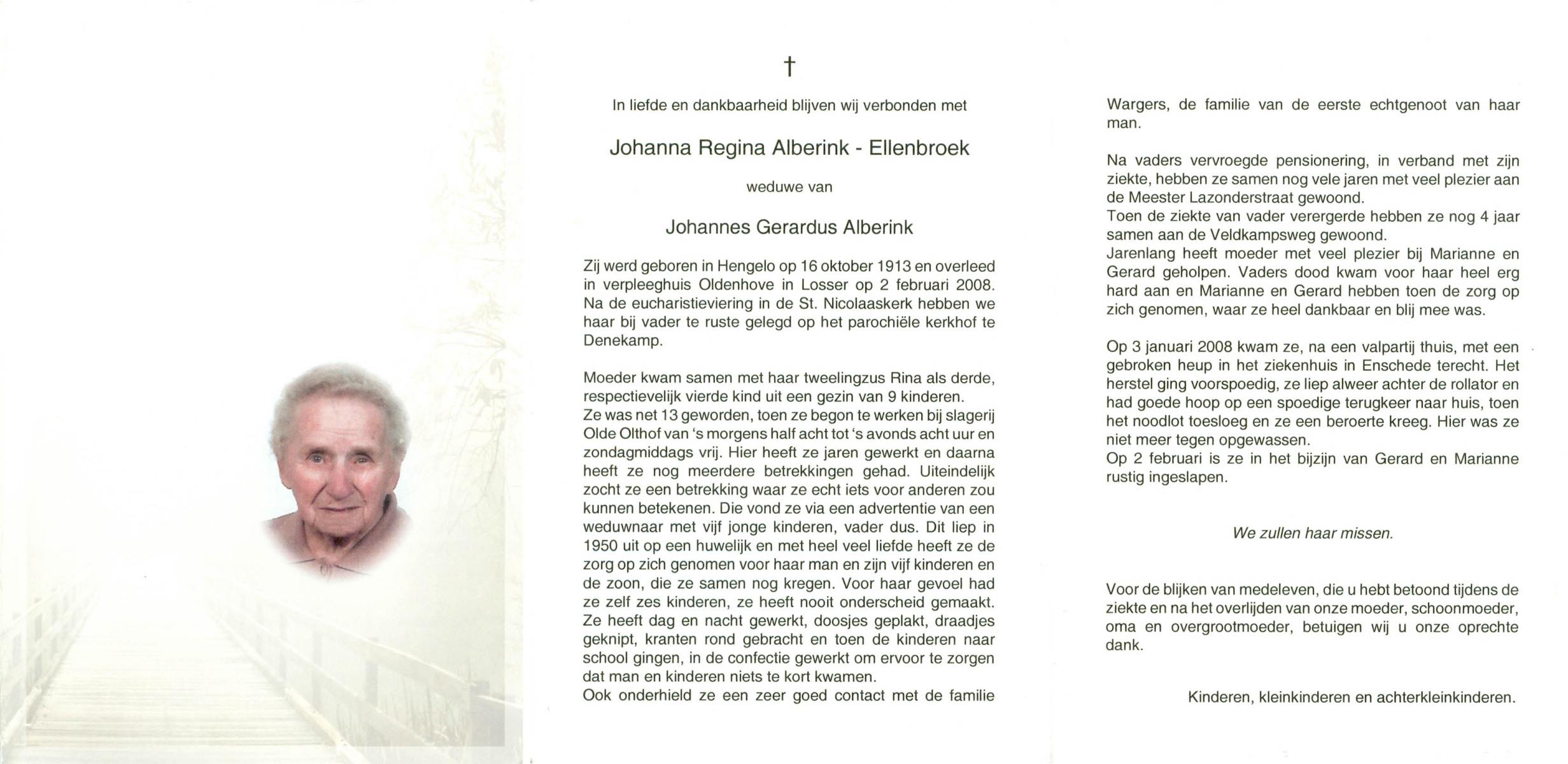 ELLENBROEK, Johanna Regina, geboren op 16-10-1913 te Hengelo (O), overleden op 2-2-2008 te Losser op 94-jarige leeftijd, begraven te Denekamp.