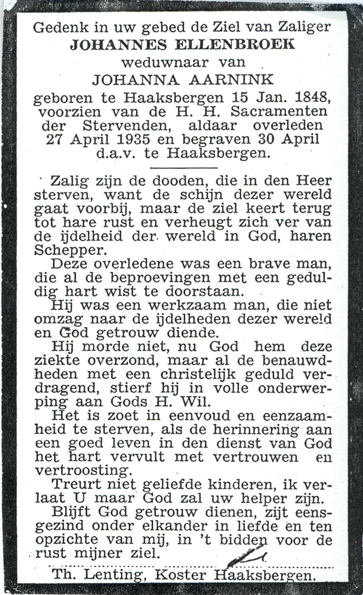 ELLENBROEK, Johannes, geboren op 15-01-1848 te Haaksbergen, overleden op 27-4-1935 te Haaksbergen op 87-jarige leeftijd, begraven op 30-4-1935 te Haaksbergen.