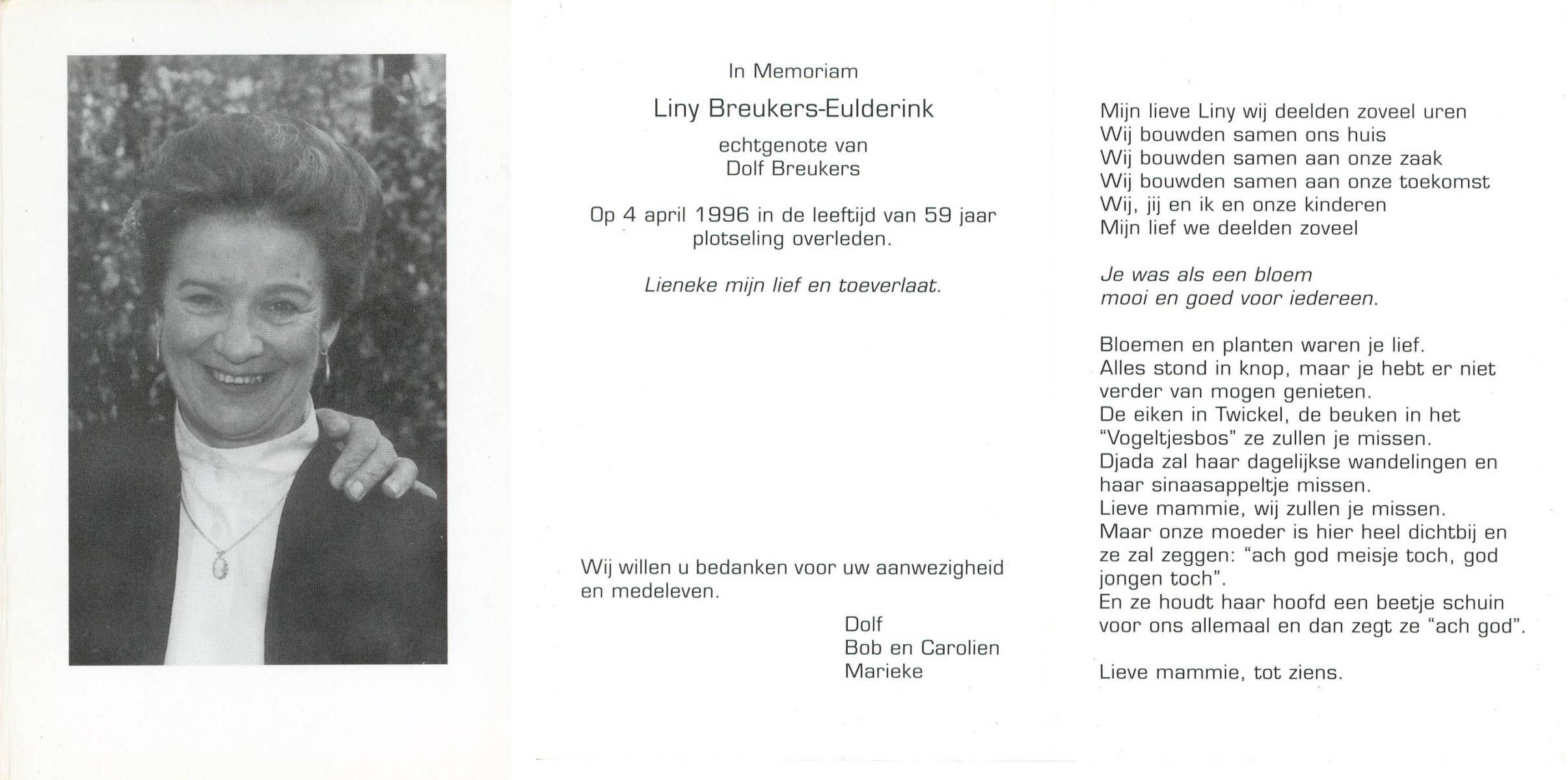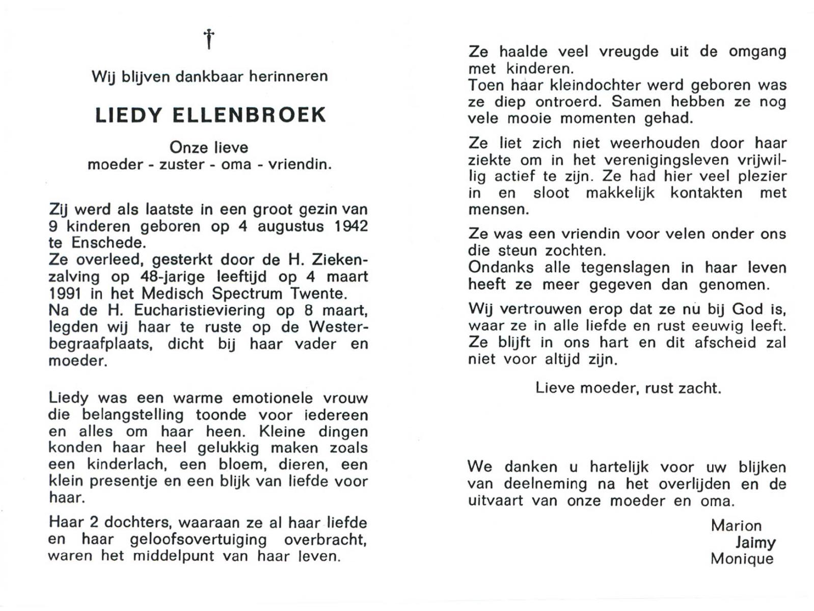 ELLENBROEK, Liedy, geboren op 4-8-1942 te Enschede, overleden op 4-3-1991 te Enschede op 48-jarige leeftijd, begraven op 8-3-1991 te Enschede.