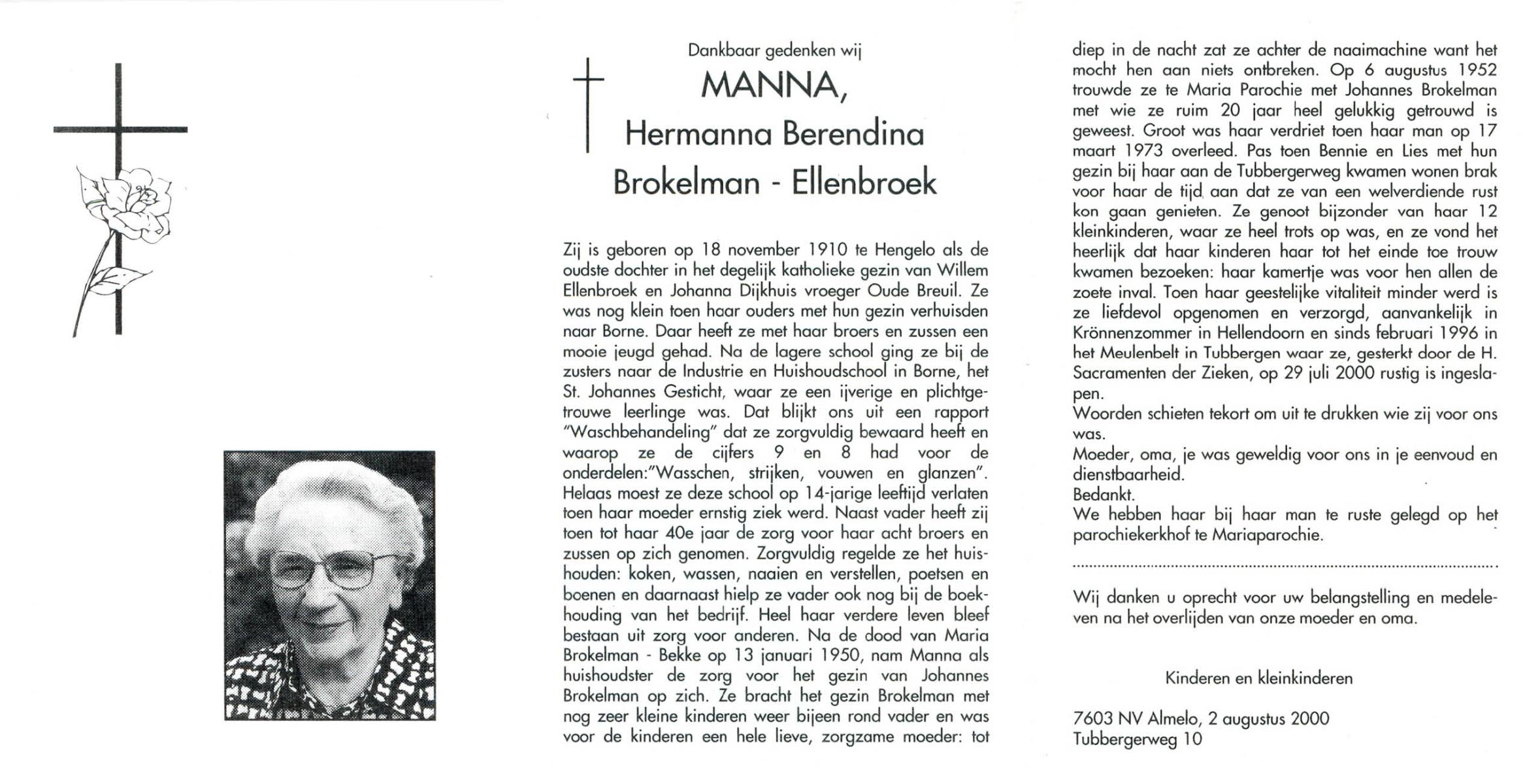 ELLENBROEK, Manna (Hermanna Berendina), geboren op 18-11-1910 te Hengelo (O), overleden op 29-7-2000 te Tubbergen op 89-jarige leeftijd, begraven op 2-8-2000 te Maria Parochie.