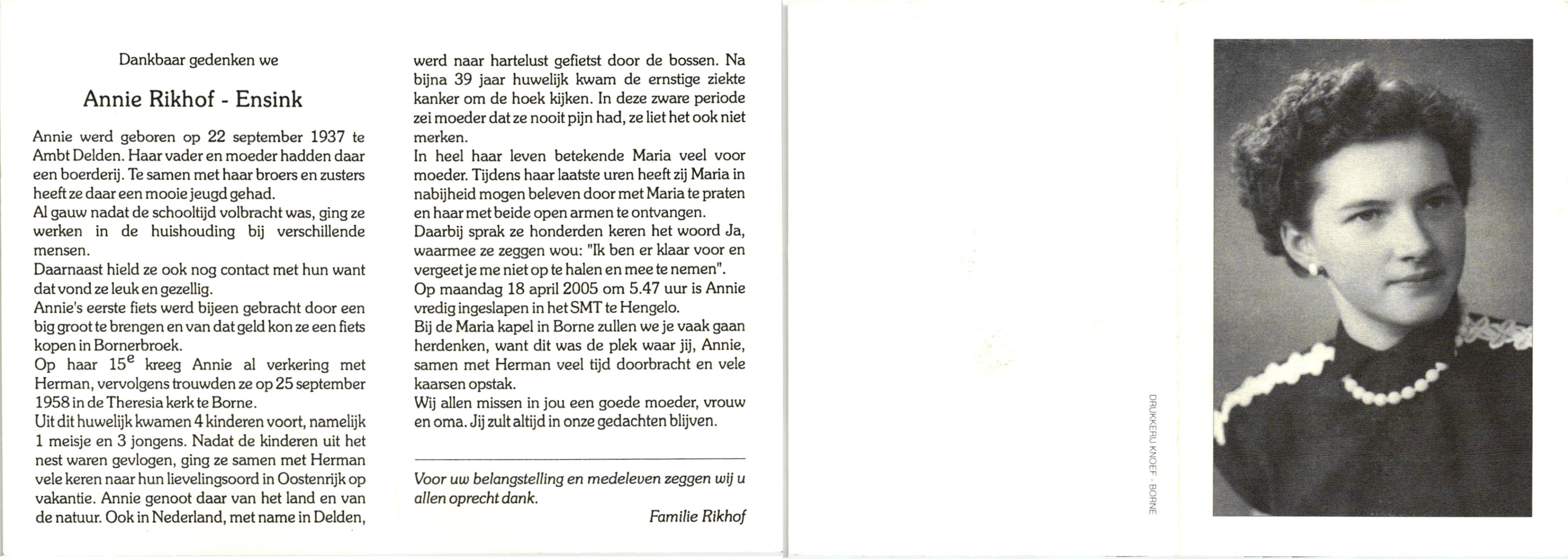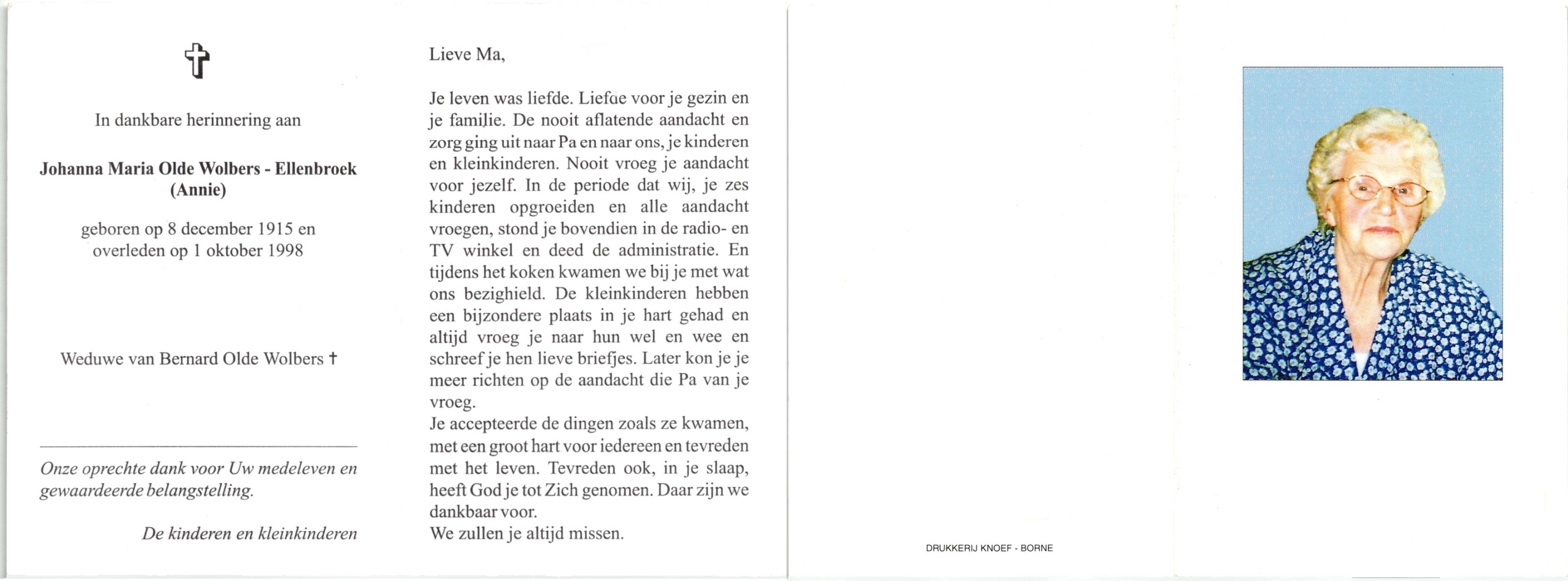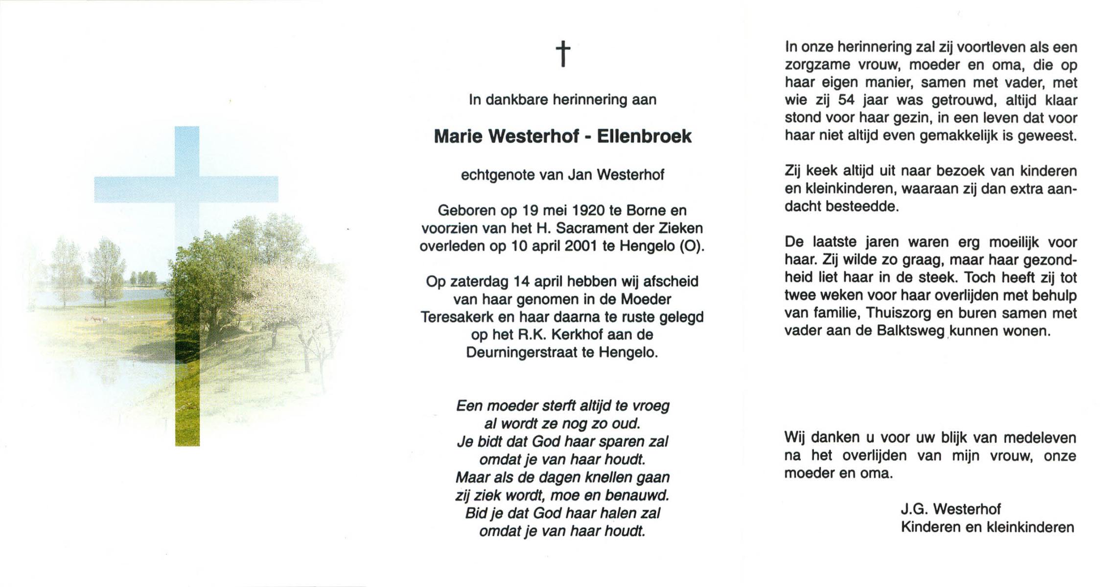 ELLENBROEK, Marie, geboren op 19-5-1920 te Borne, overleden op 10-4-2001 te Hengelo (Ov.) op 80-jarige leeftijd, begraven op 14-4-2001 te Hengelo (Ov.).