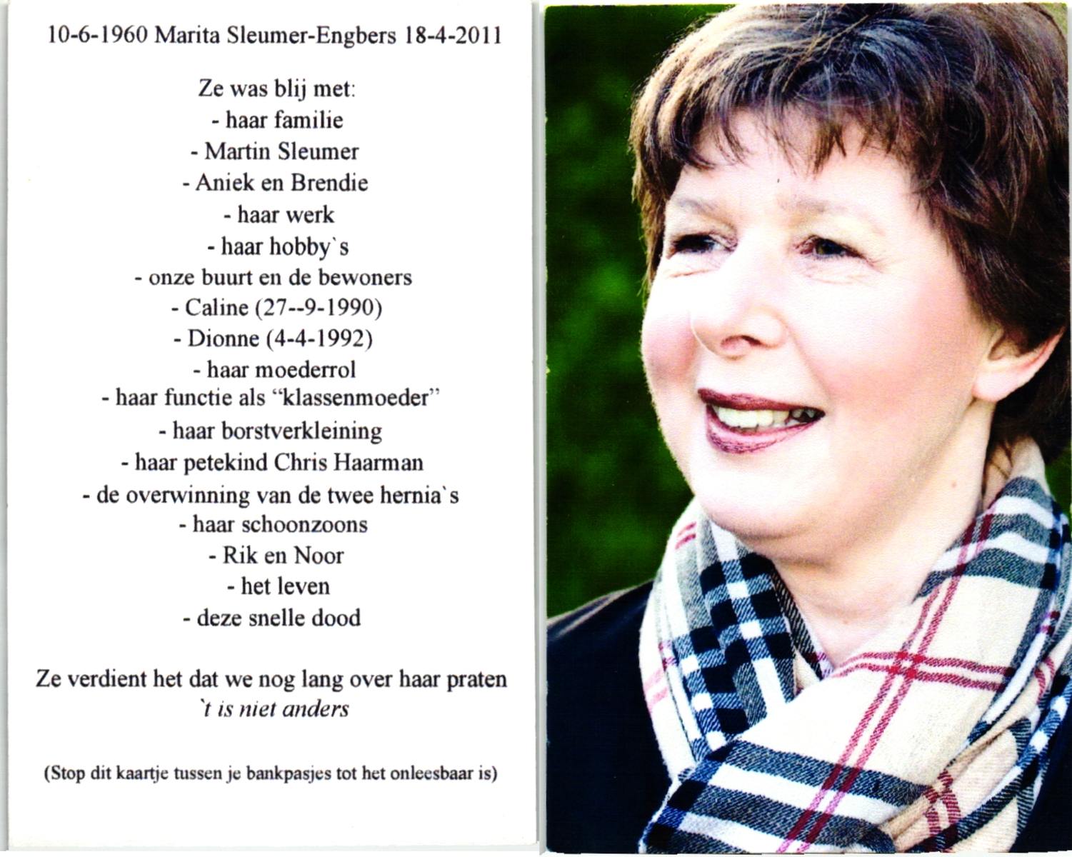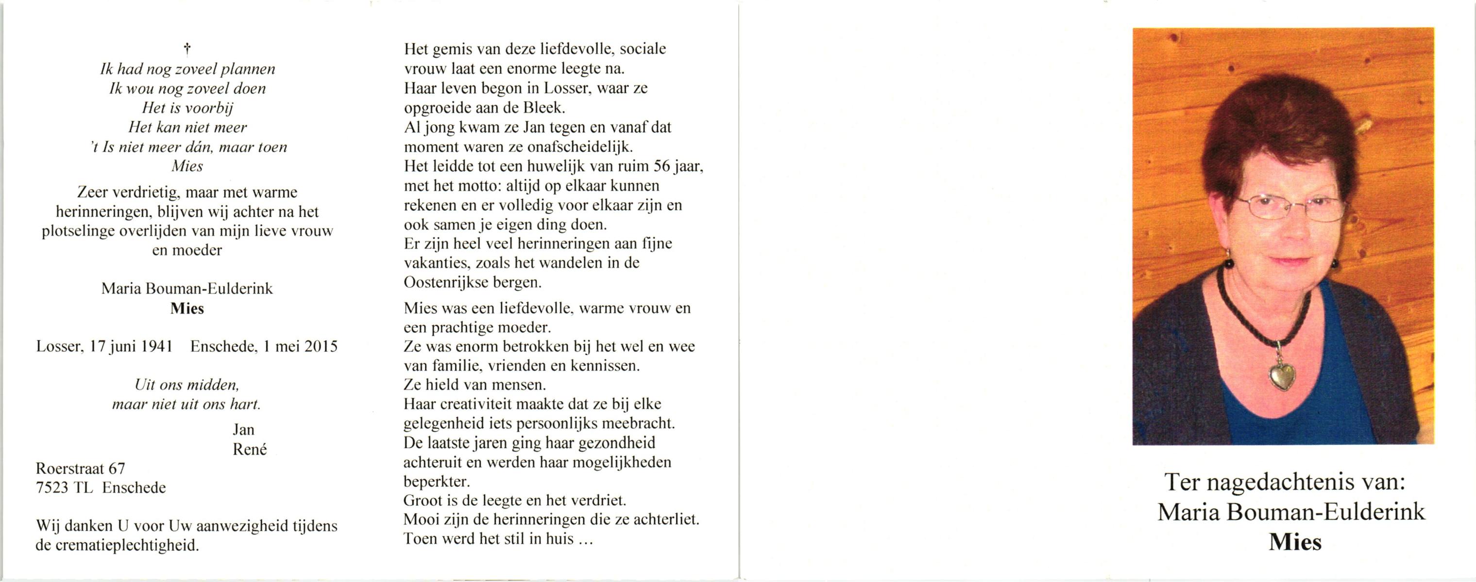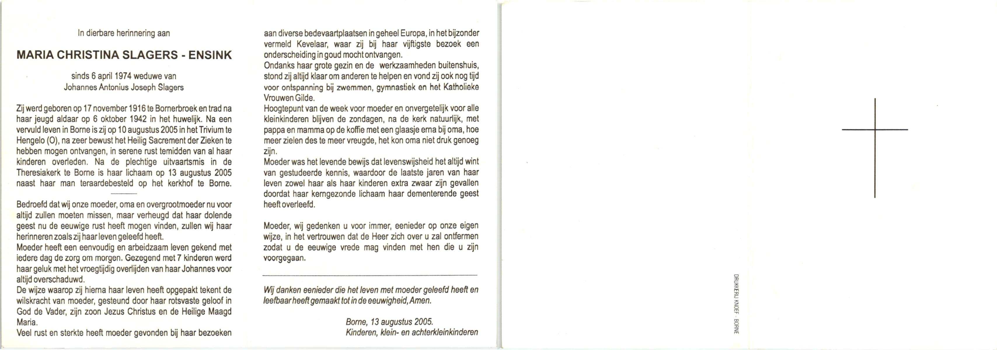 ELLENBROEK, Marie, geboren op 19-5-1920 te Borne, overleden op 10-4-2001 te Hengelo (Ov.) op 80-jarige leeftijd, begraven op 14-4-2001 te Hengelo (Ov.).
