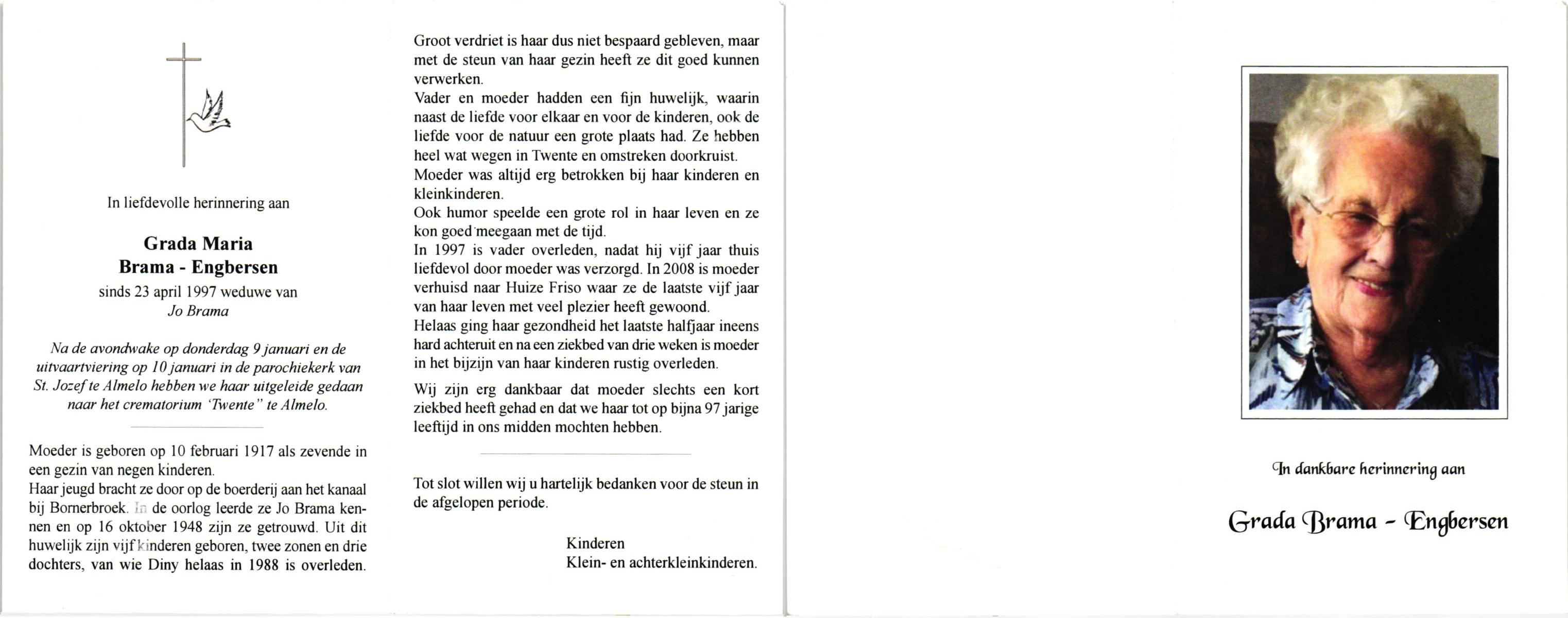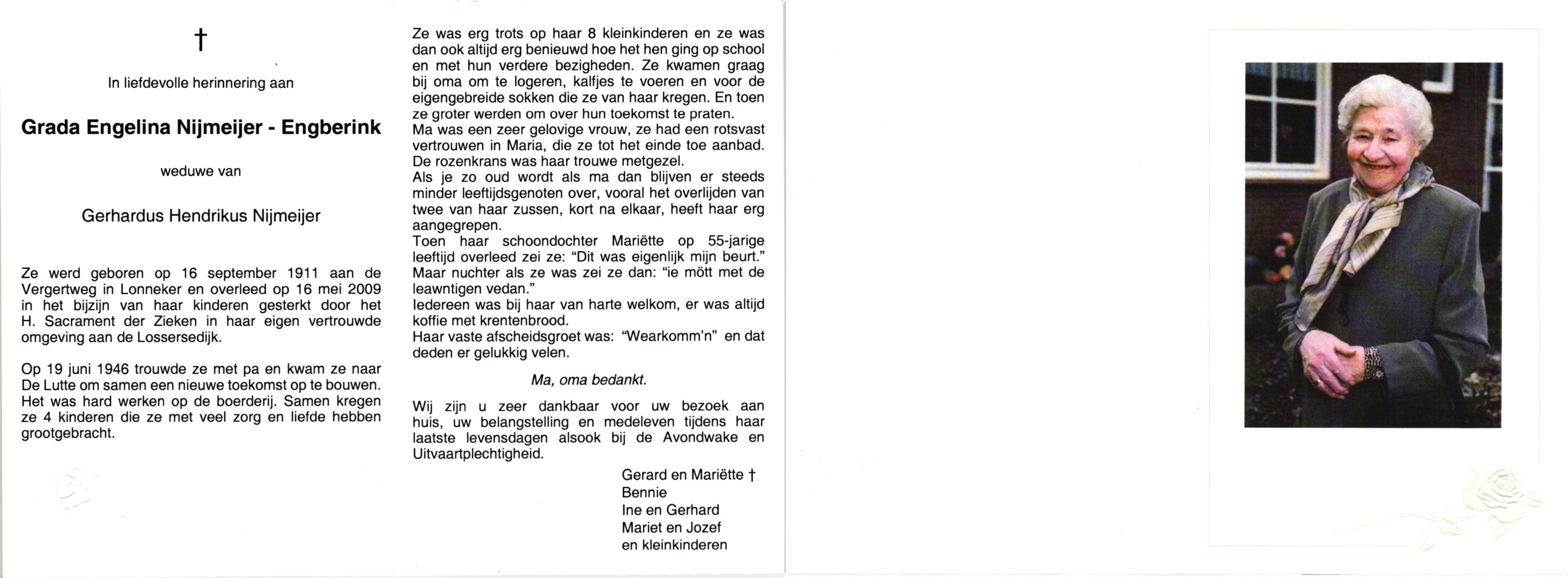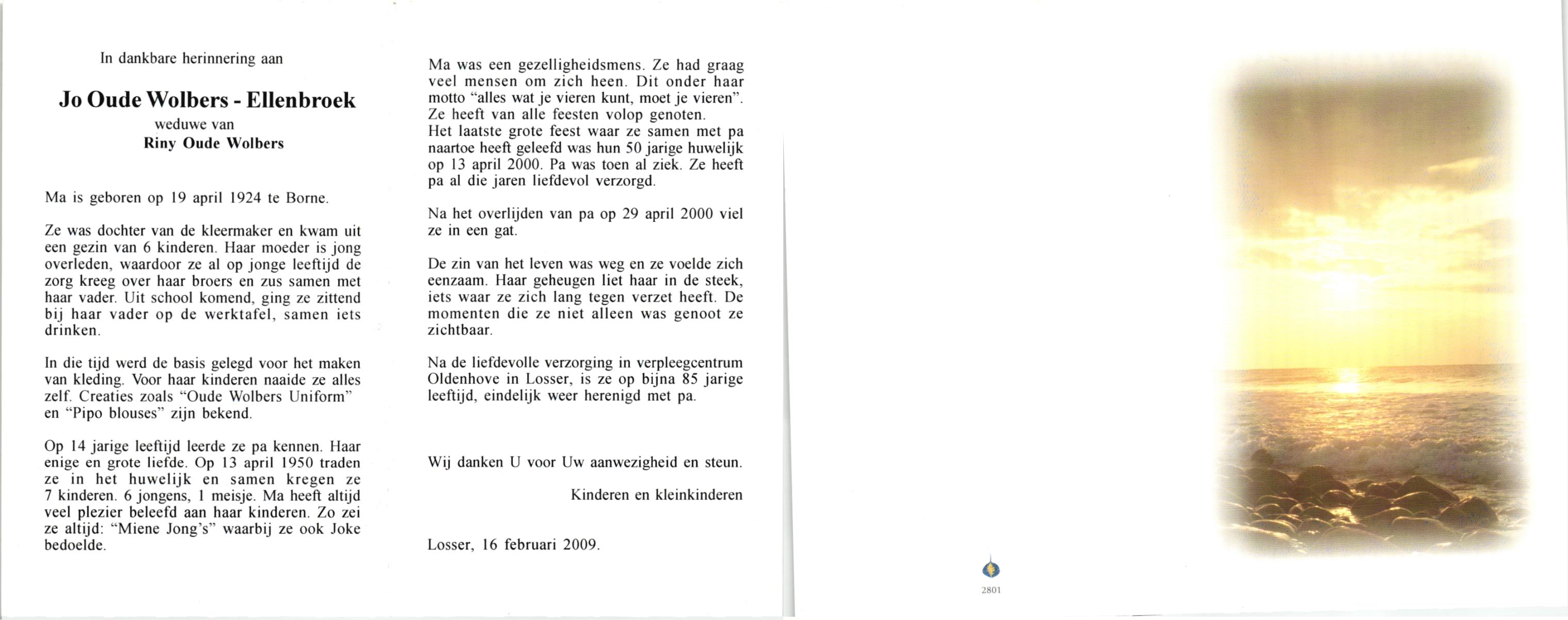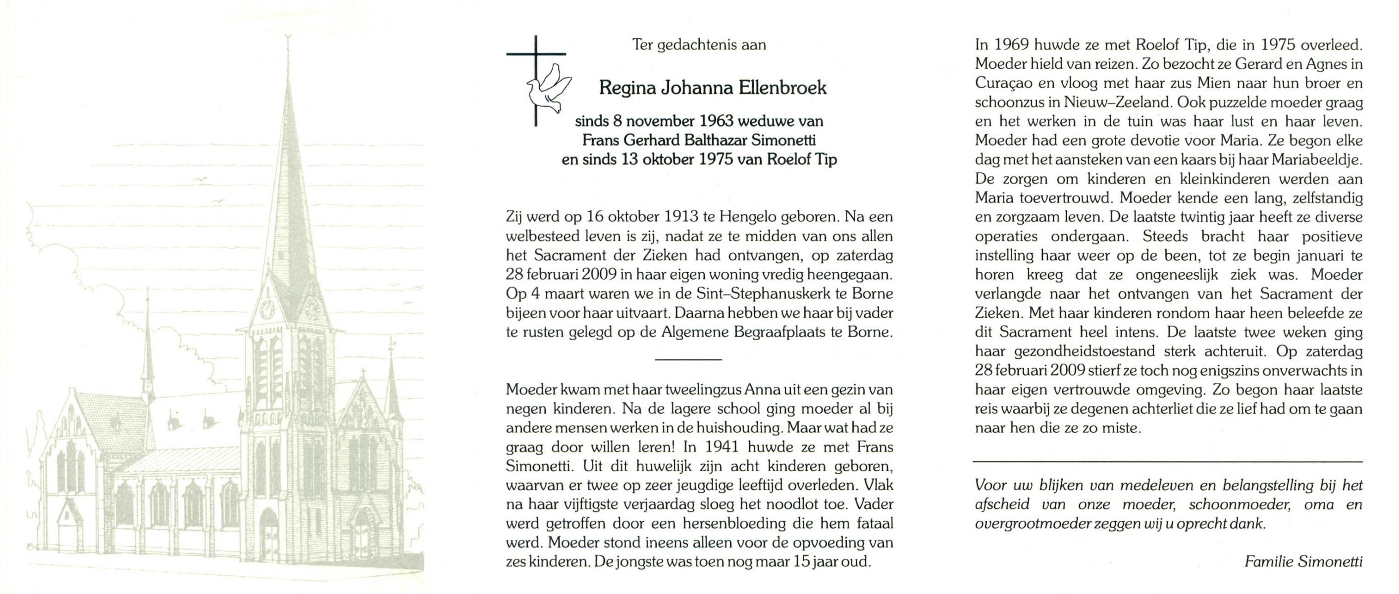 ELLENBROEK, Regina Johanna, geboren op 16-10-1913 te Hengelo (O), overleden op 28-2-2009 te Borne op 95-jarige leeftijd, begraven op 4-3-2009 te Borne.