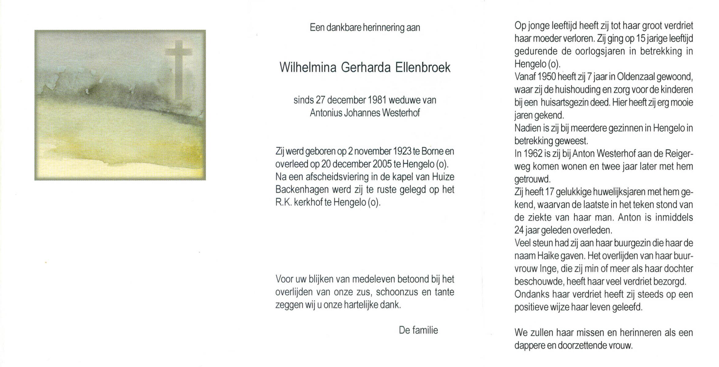 ELLENBROEK, Wilhelmina Gerharda, geboren op 2-11-1923 te Borne, overleden op 20-12-2005 te Hengelo (Ov.) op 82-jarige leeftijd, begraven te Hengelo (Ov.) R.K.Kerkhof.