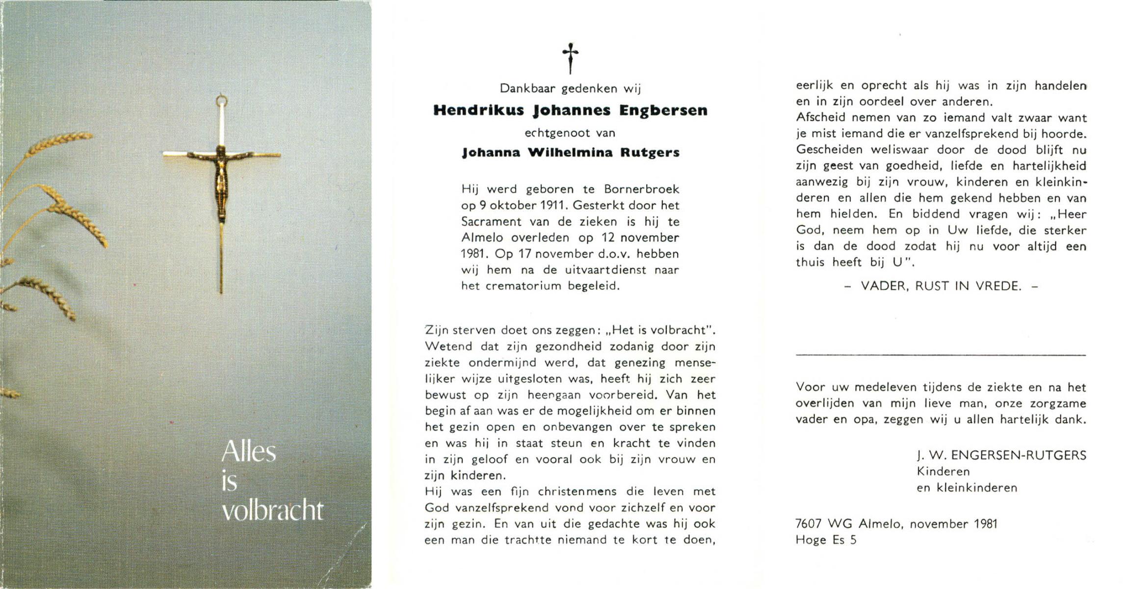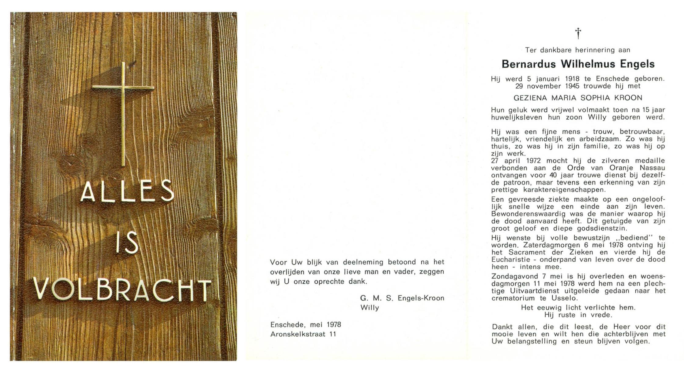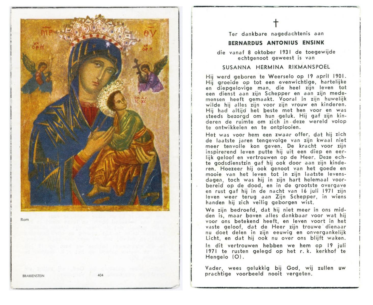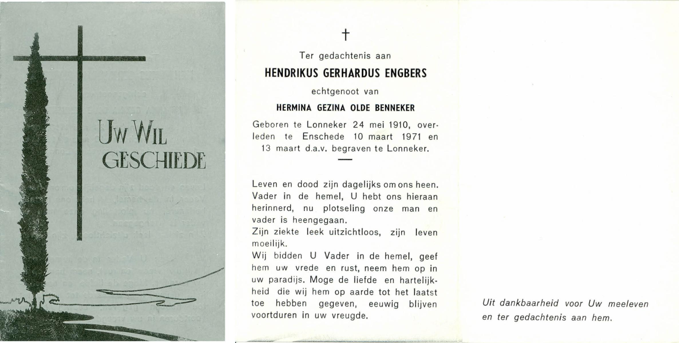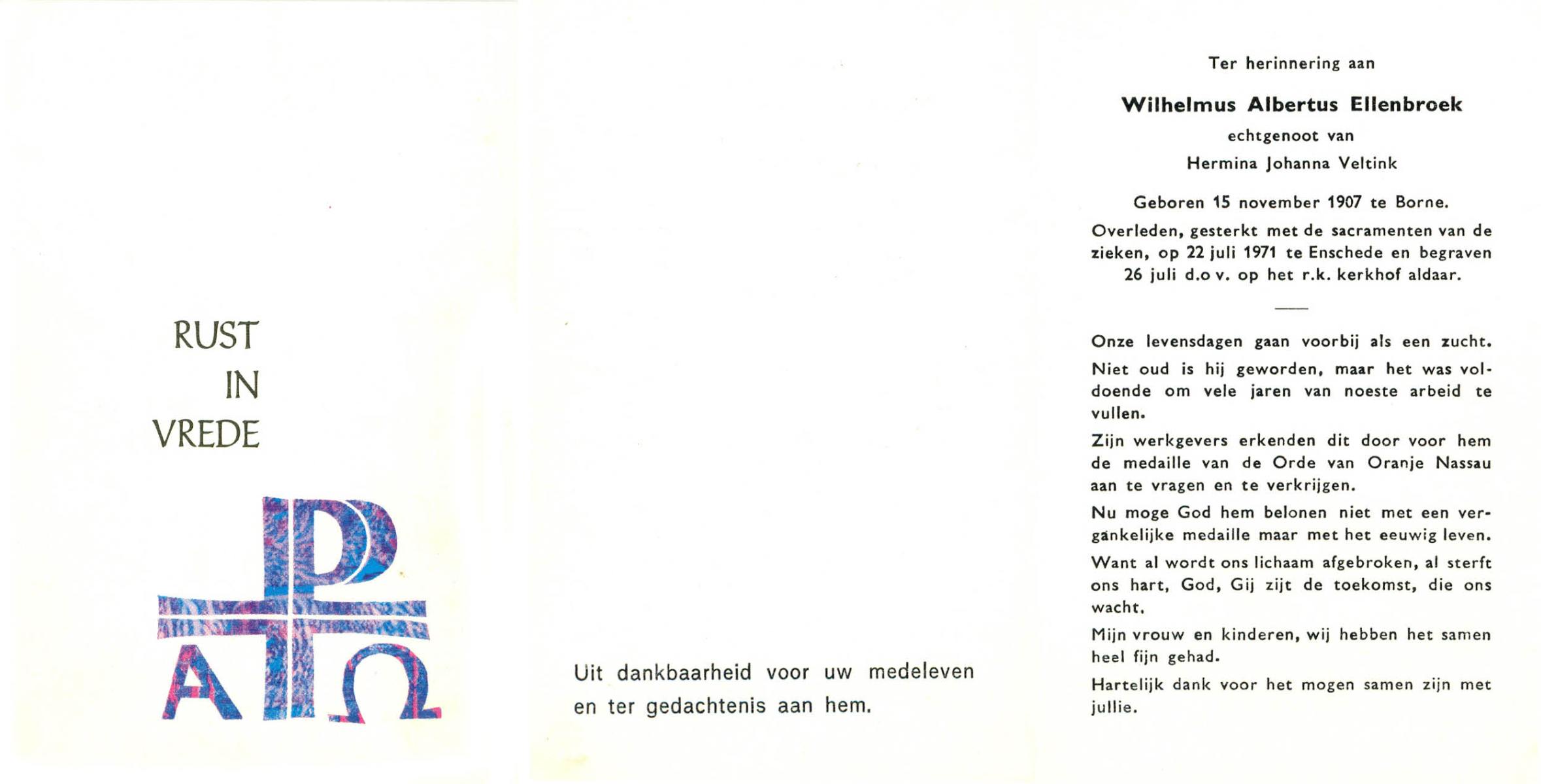 ELLENBROEK, Wilhelmus Albertus, geboren op 15-11-1907 te Borne, overleden op 22-7-1971 te Enschede op 63-jarige leeftijd, begraven op 26-7-1971 te Enschede.