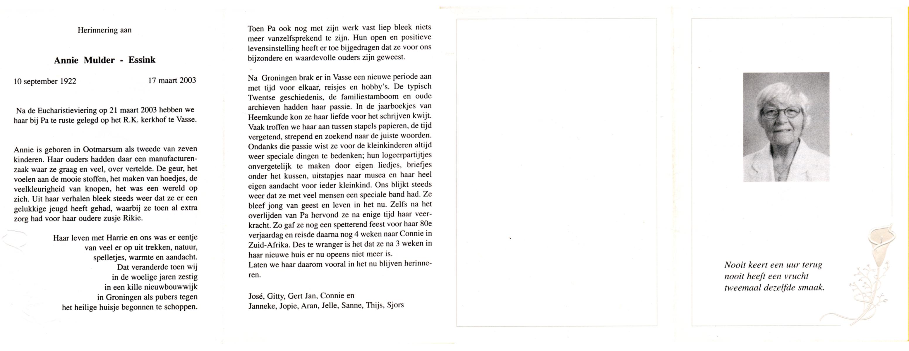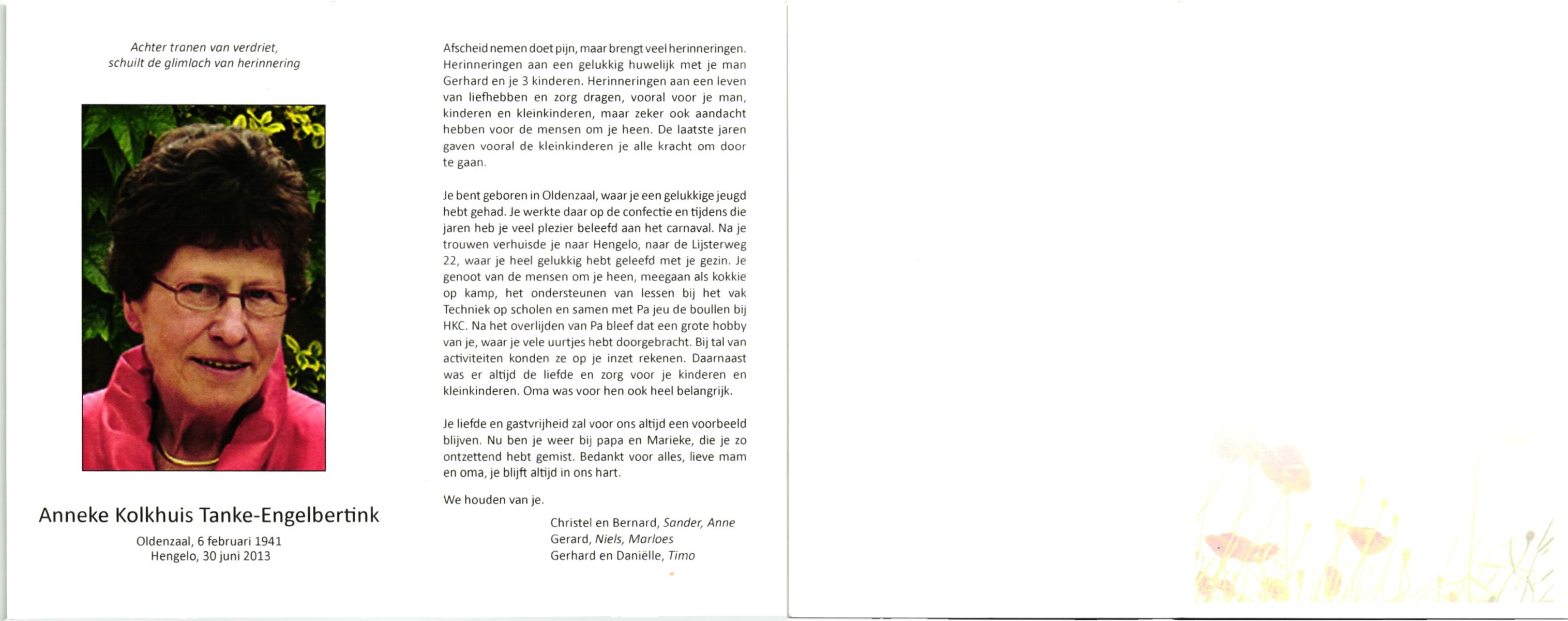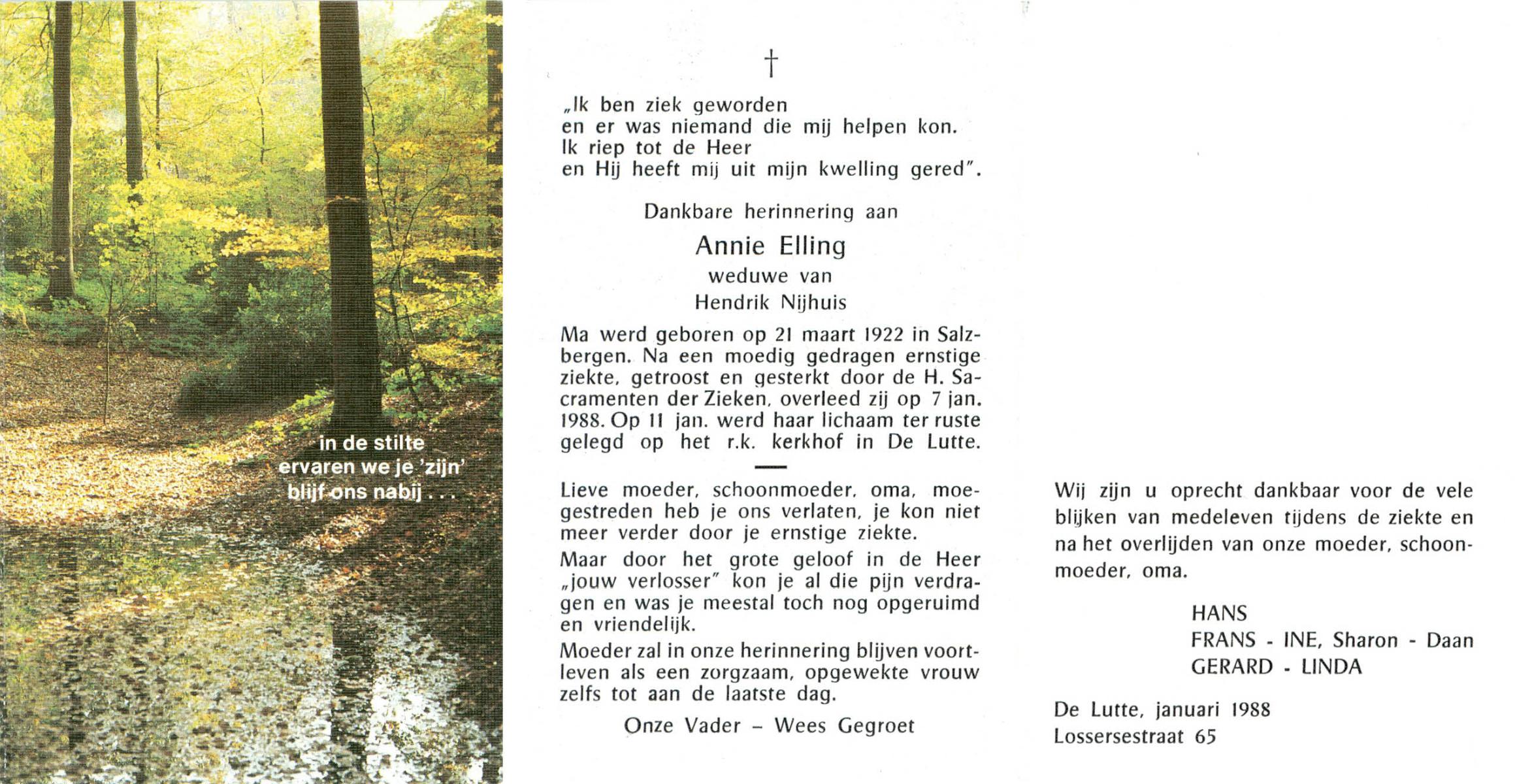 ELLING, Annie, geboren op 21-3-1922 te Salzbergen (Dld), overleden op 7-1-1988 te De Lutte op 65-jarige leeftijd, begraven op 11-1-1988 te De Lutte.