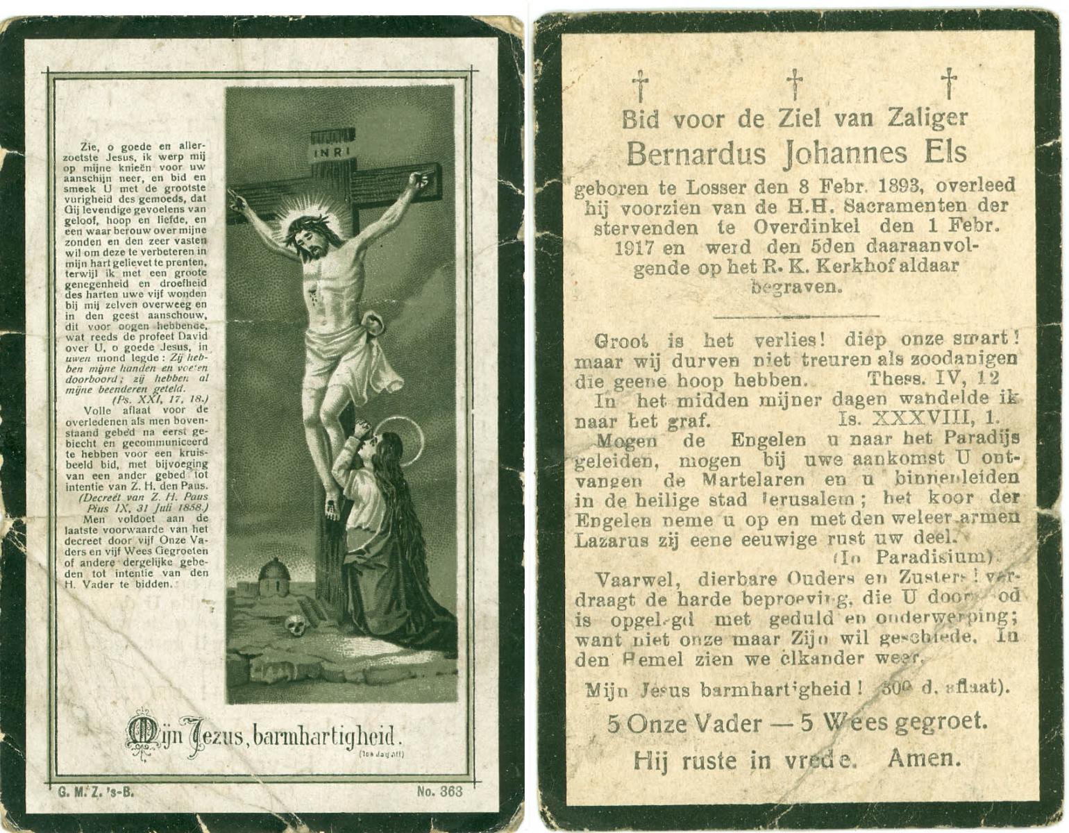 ELS, Bernardus Johannes, geboren op 08-02-1893 te Losser, overleden op 1-2-1917 te Overdinkel op 23-jarige leeftijd, begraven op 5-2-1917 te Overdinkel.