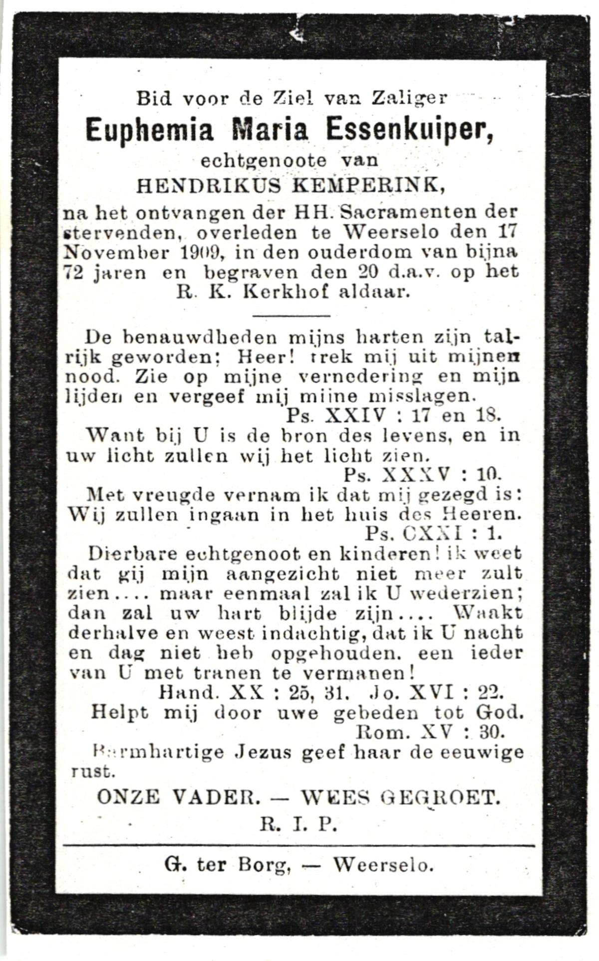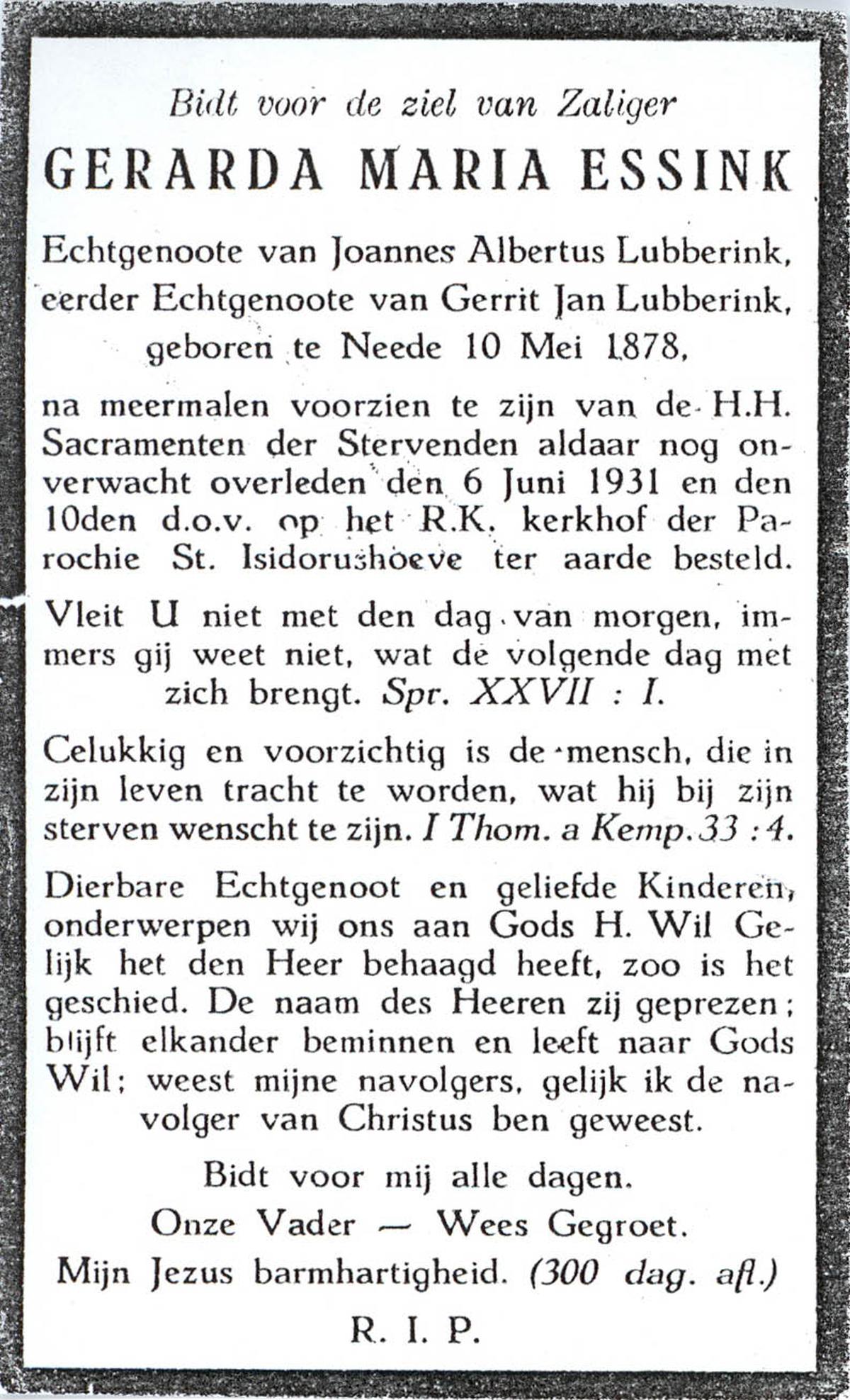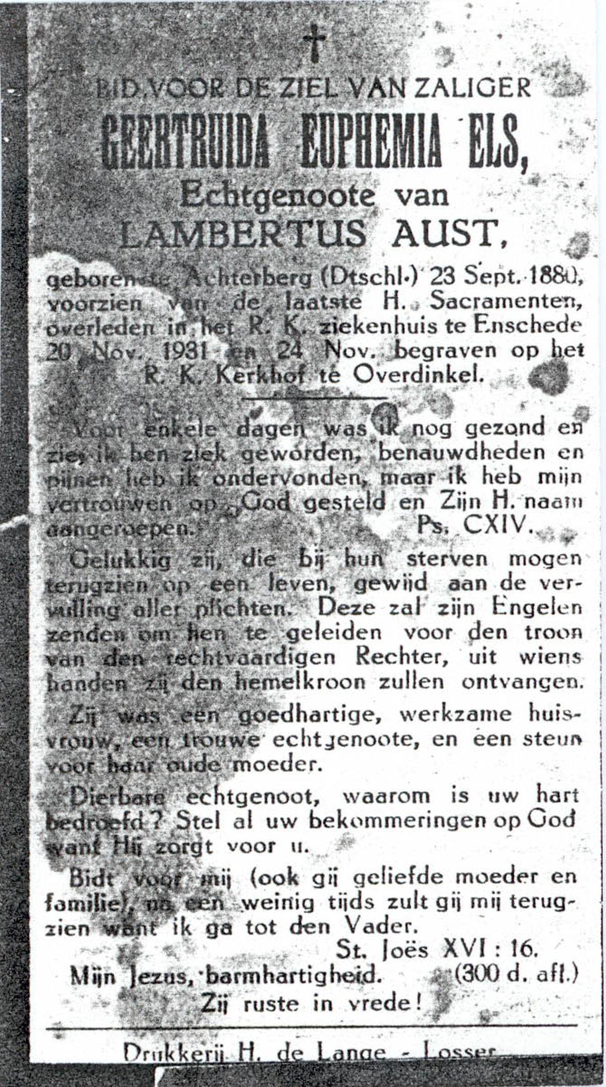ELS, Geertruida Euphemia, geboren op 23-09-1880 te Achterberg, Dld, overleden op 20-11-1931 te Enschede op 51-jarige leeftijd, begraven op 24-11-1931 te Overdinkel.