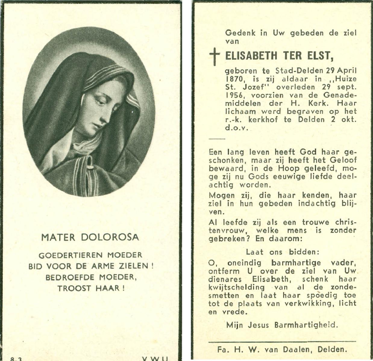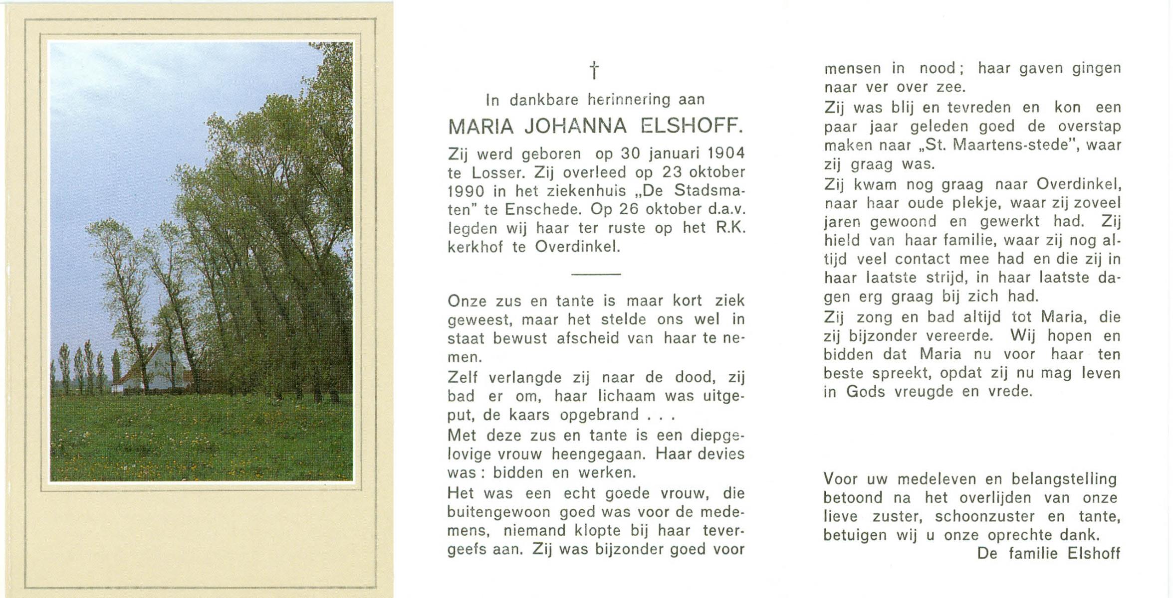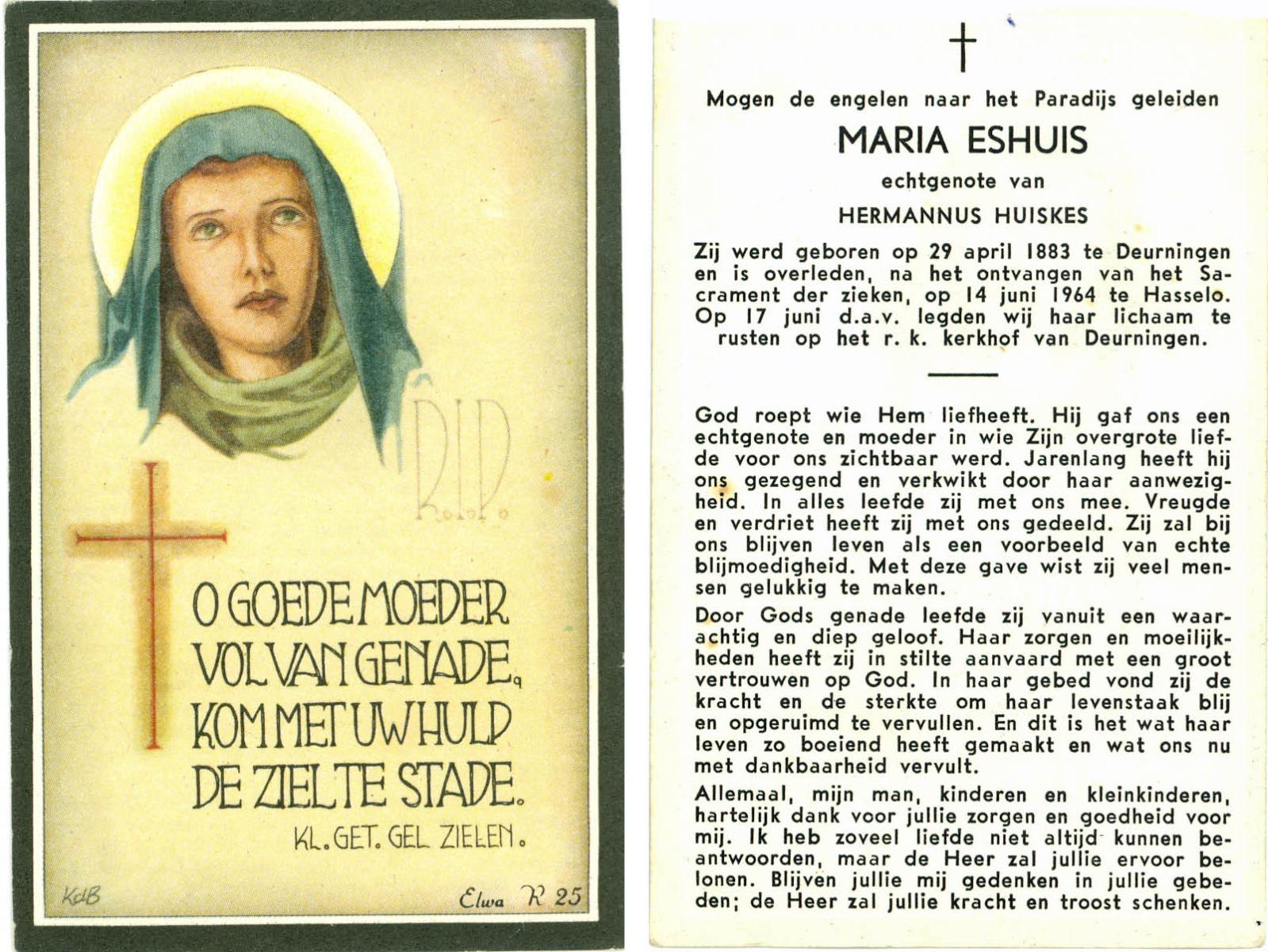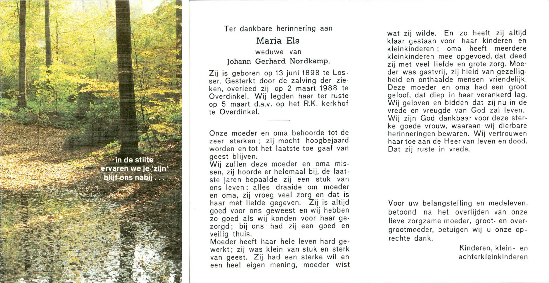 ELS, Maria, geboren op 13-06-1898 te Losser, overleden op 2-3-1988 te Overdinkel op 89-jarige leeftijd, begraven op 5-3-1988 te Overdinkel R.K.kerkhof.