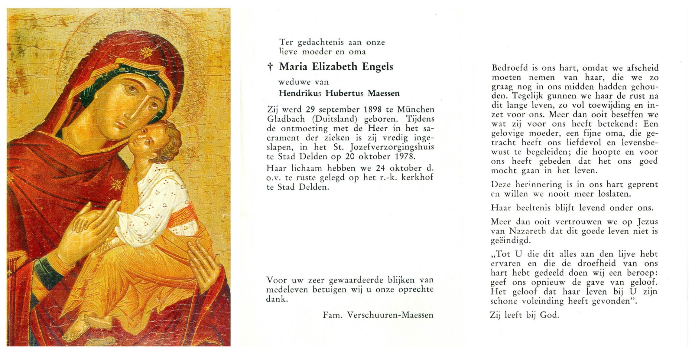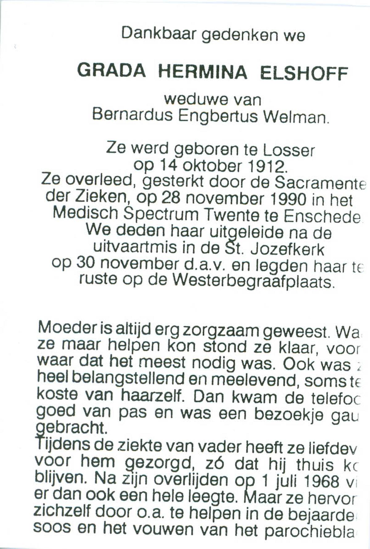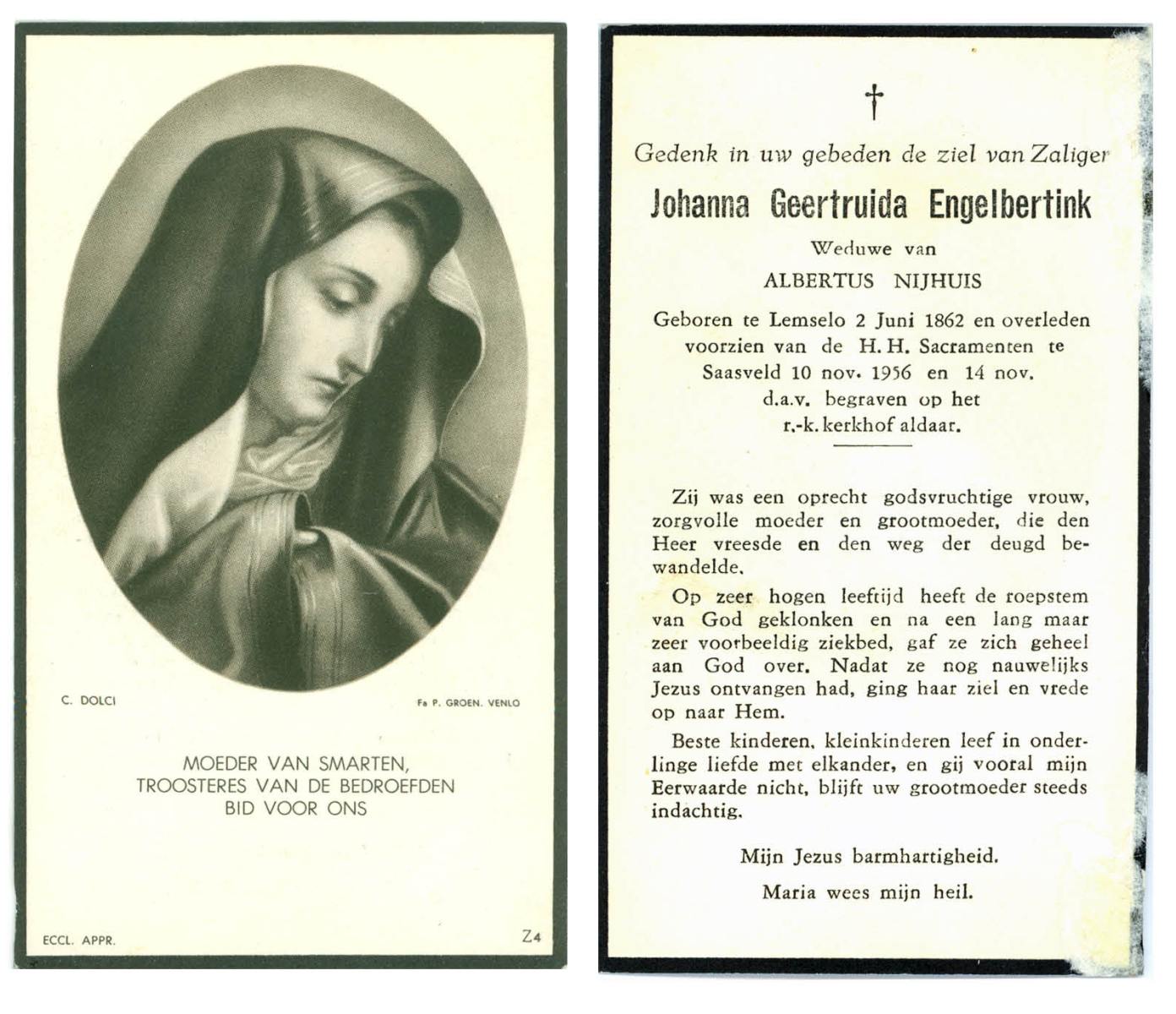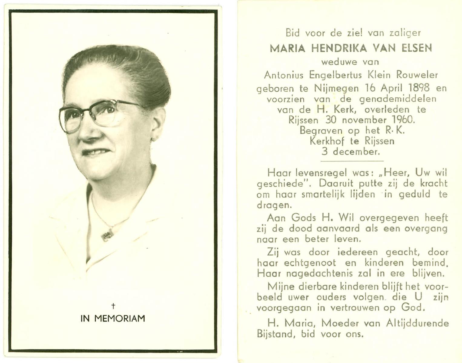 ELS, Maria, geboren op 13-06-1898 te Losser, overleden op 2-3-1988 te Overdinkel op 89-jarige leeftijd, begraven op 5-3-1988 te Overdinkel R.K.kerkhof.