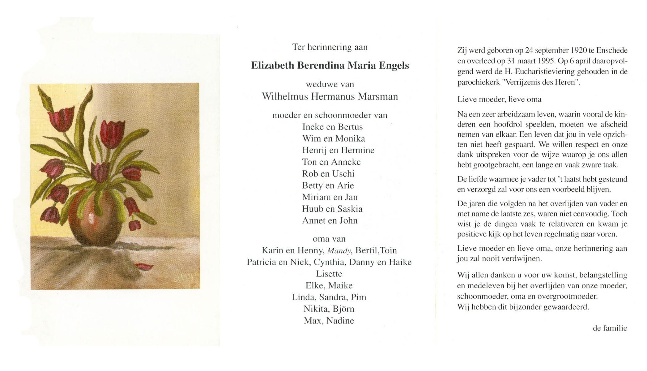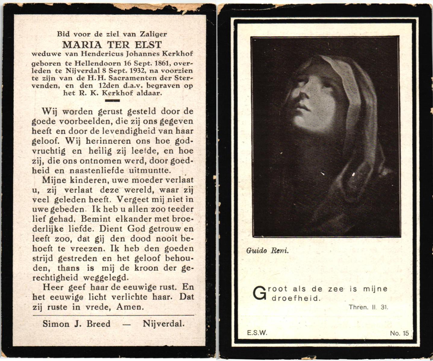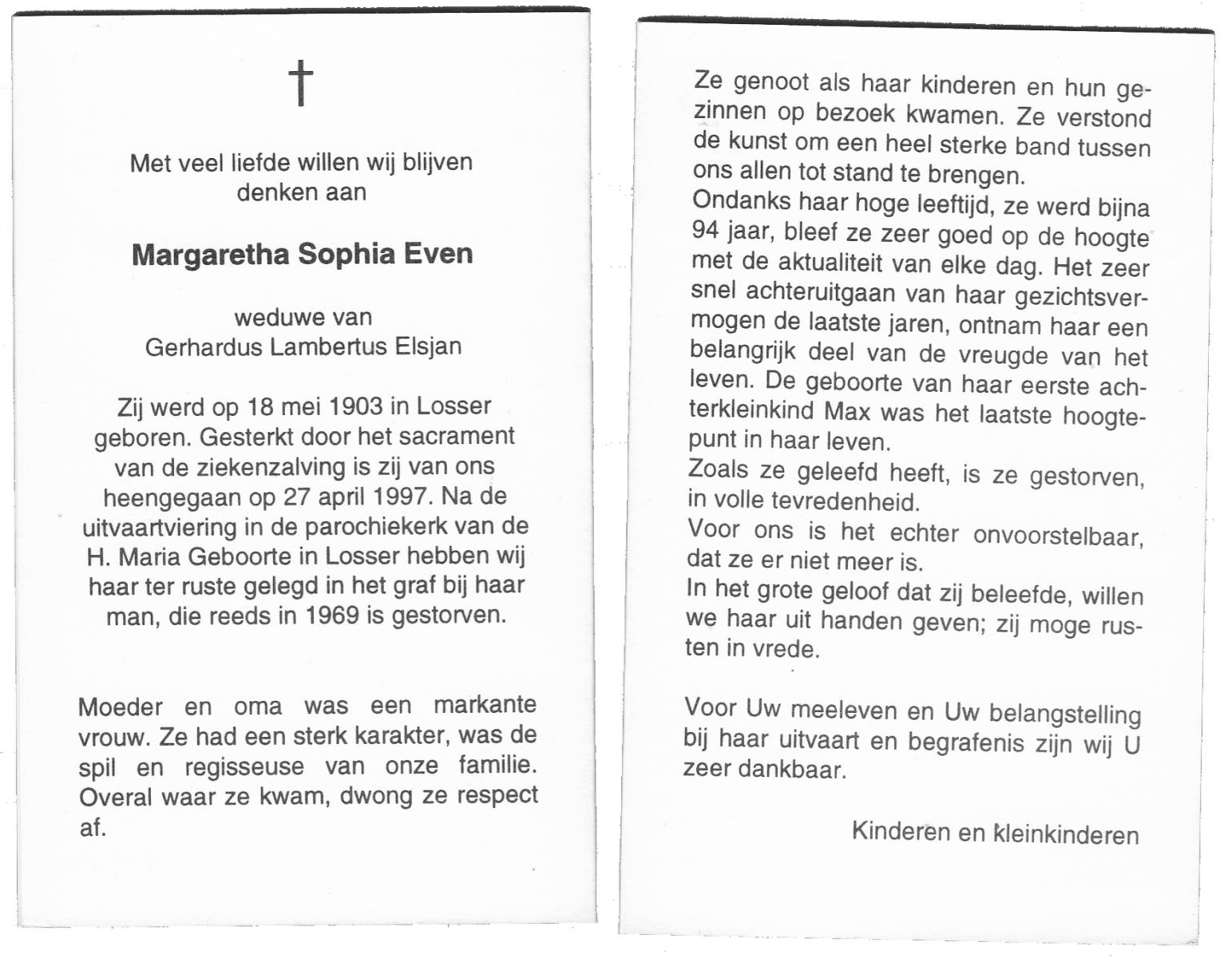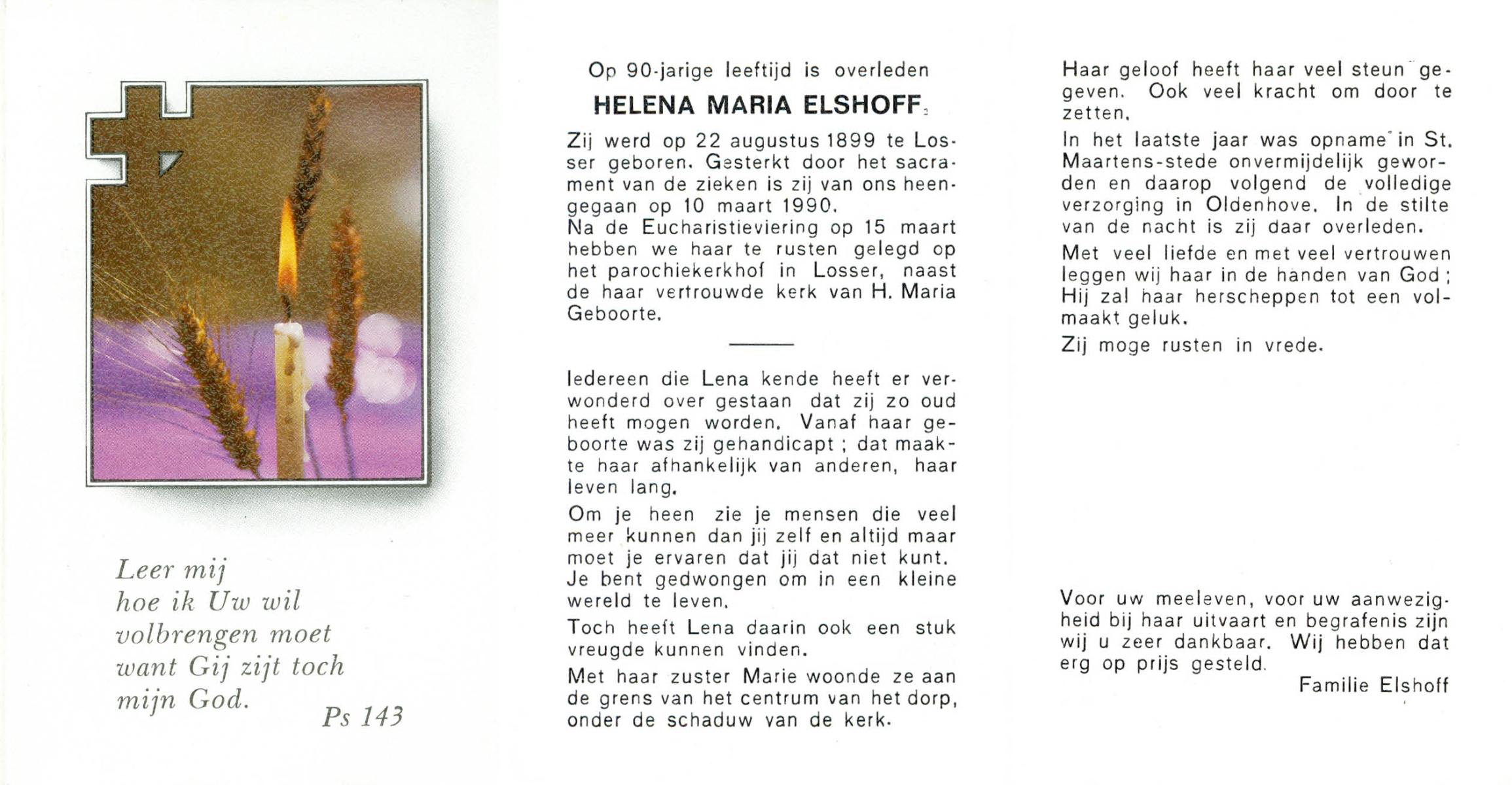 ELS, Maria, geboren op 13-06-1898 te Losser, overleden op 2-3-1988 te Overdinkel op 89-jarige leeftijd, begraven op 5-3-1988 te Overdinkel R.K.kerkhof.