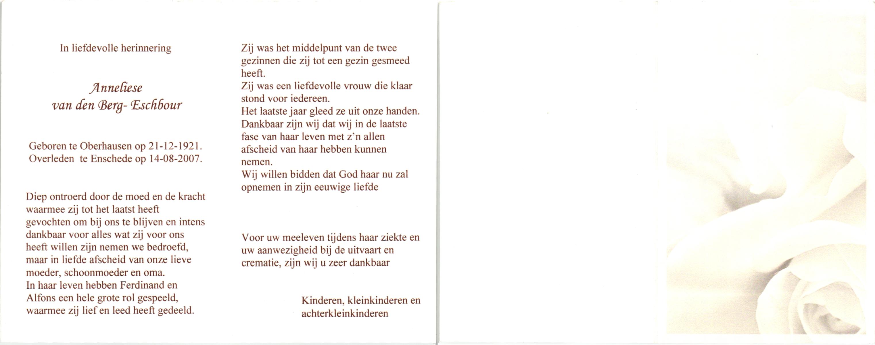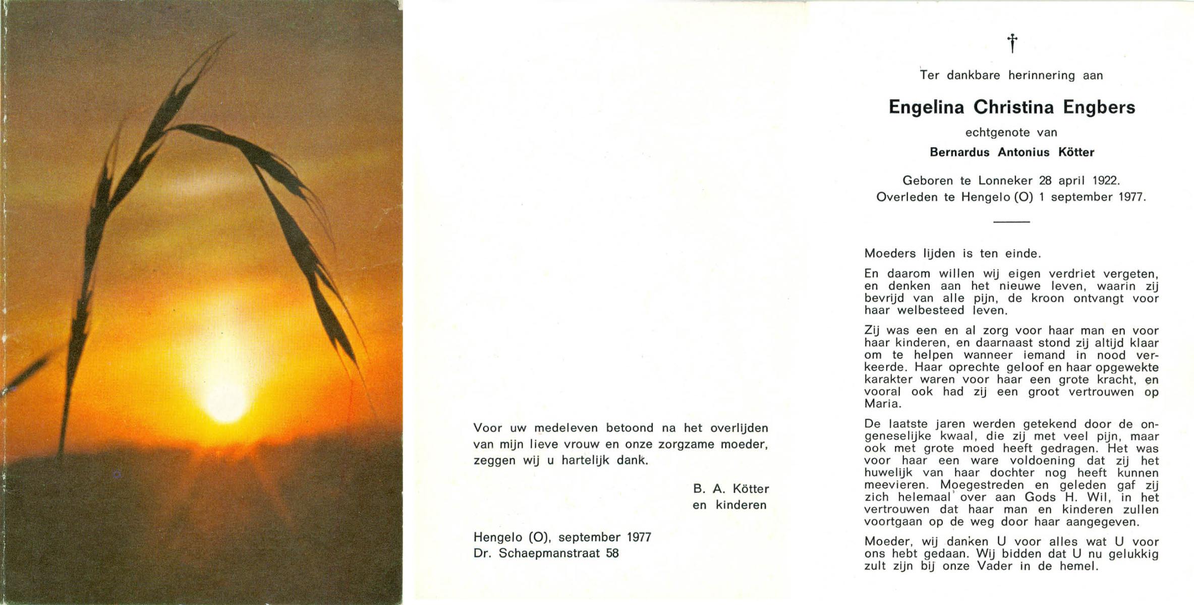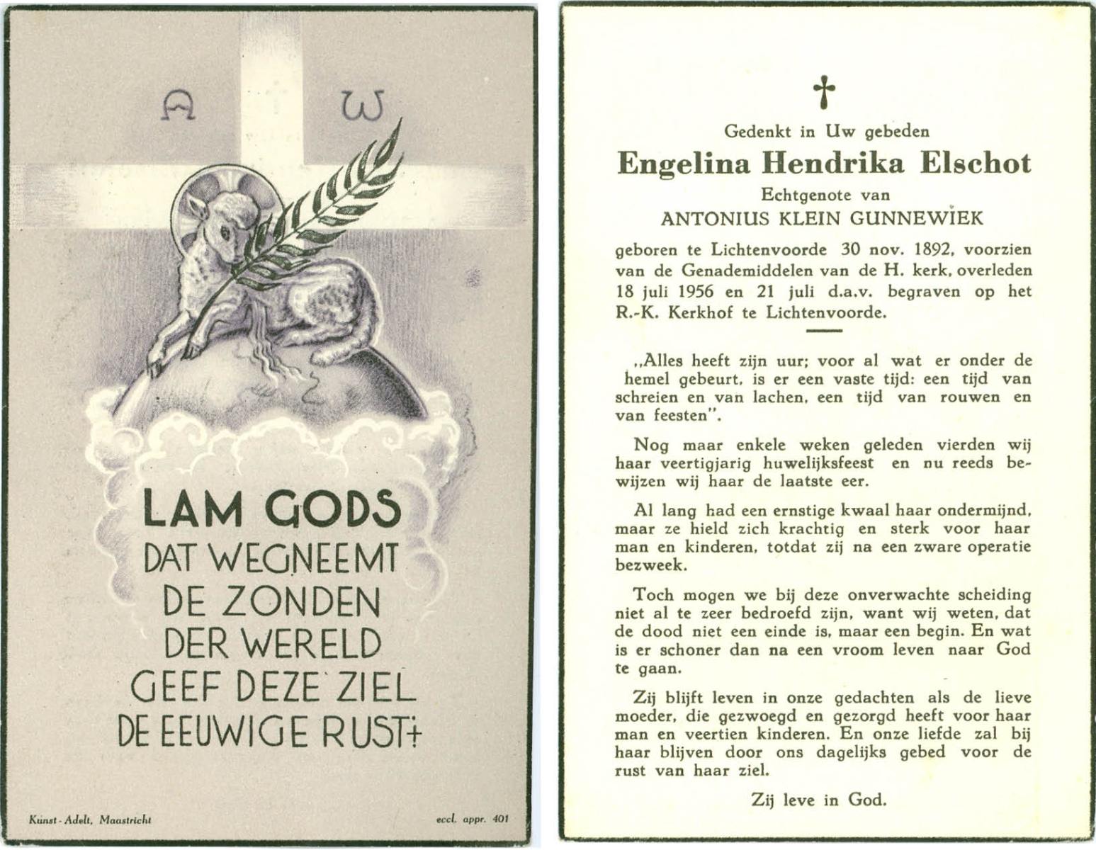 ELSCHOT, Engelina Hendrika, geboren op 30-11-1892 te Lichtenvoorde, overleden op 18-7-1956 op 63-jarige leeftijd, begraven op 21-7-1956 te Lichtenvoorde.