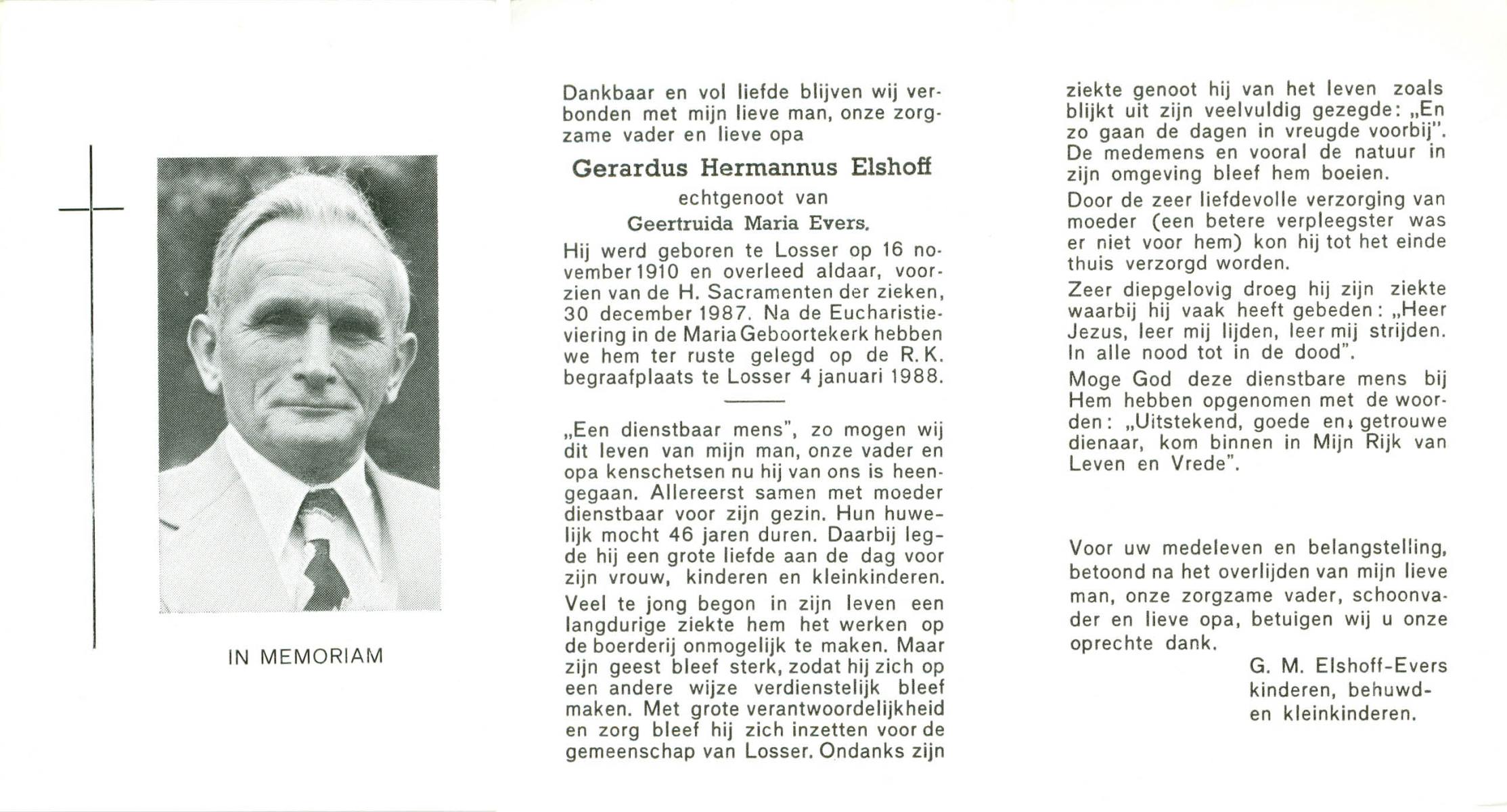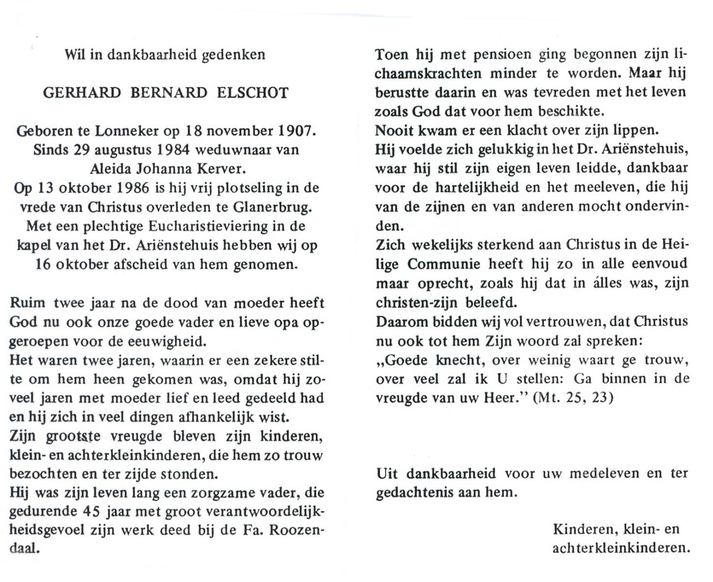 ELSCHOT, Gerhard Bernard, geboren op 18-11-1907 te Lonneker, overleden op 13-10-1986 te Glanerbrug op 78-jarige leeftijd, begraven op 16-10-1986 te Glanerbrug.
