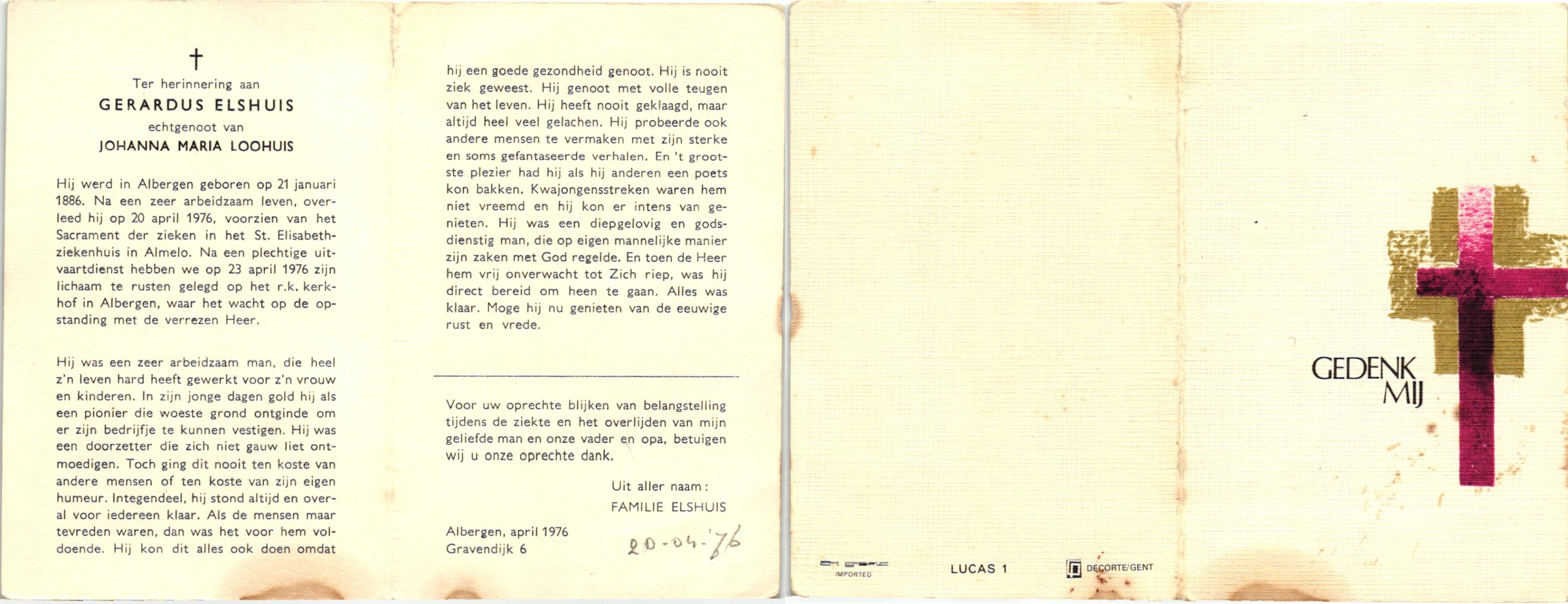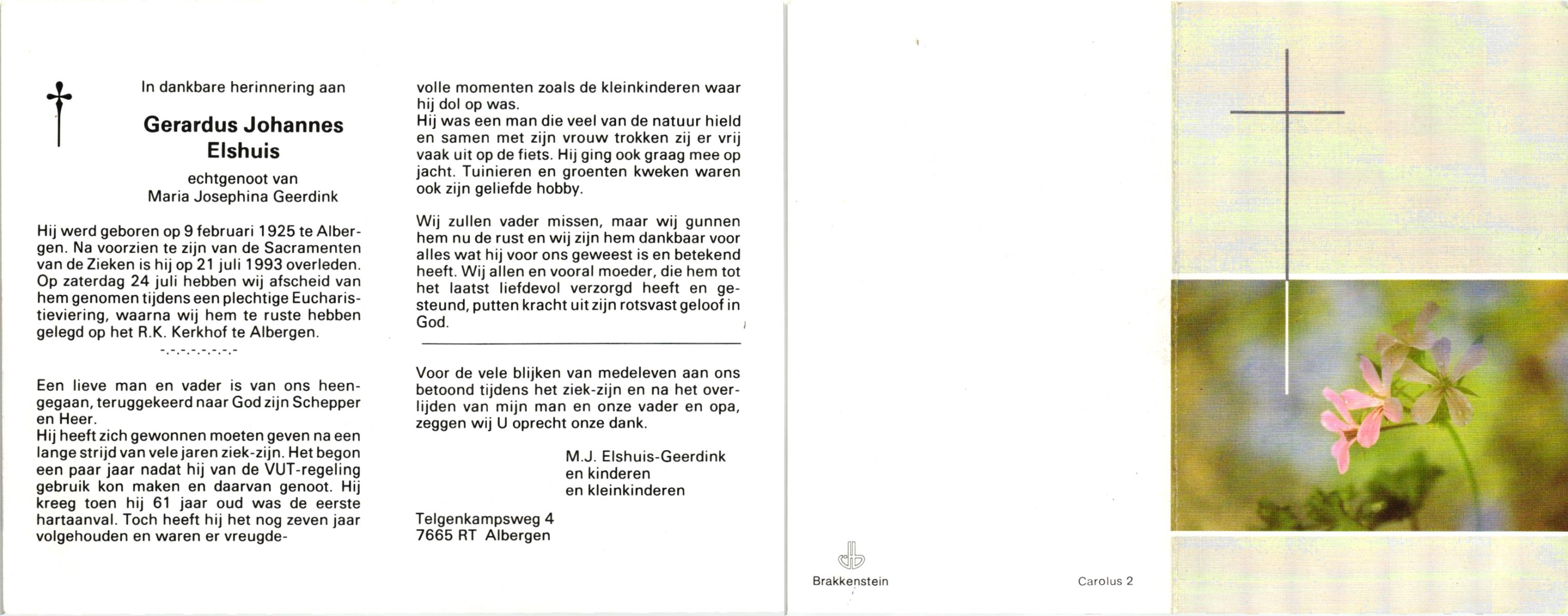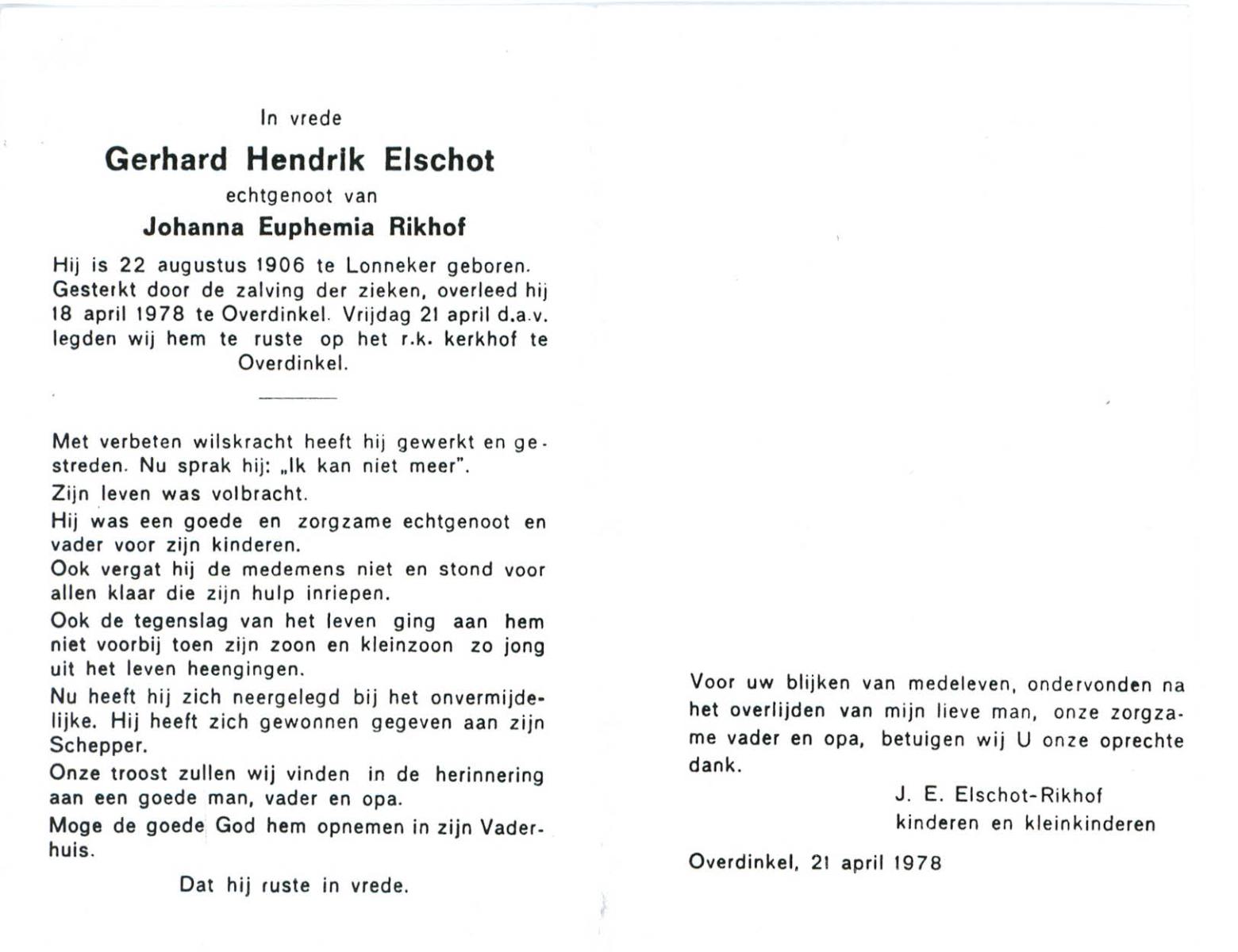 ELSCHOT, Gerhard Hendrik, geboren op 22-8-1906 te Lonneker, overleden op 18-4-1978 te Overdinkel op 71-jarige leeftijd, begraven op 21-4-1978 te Overdinkel.