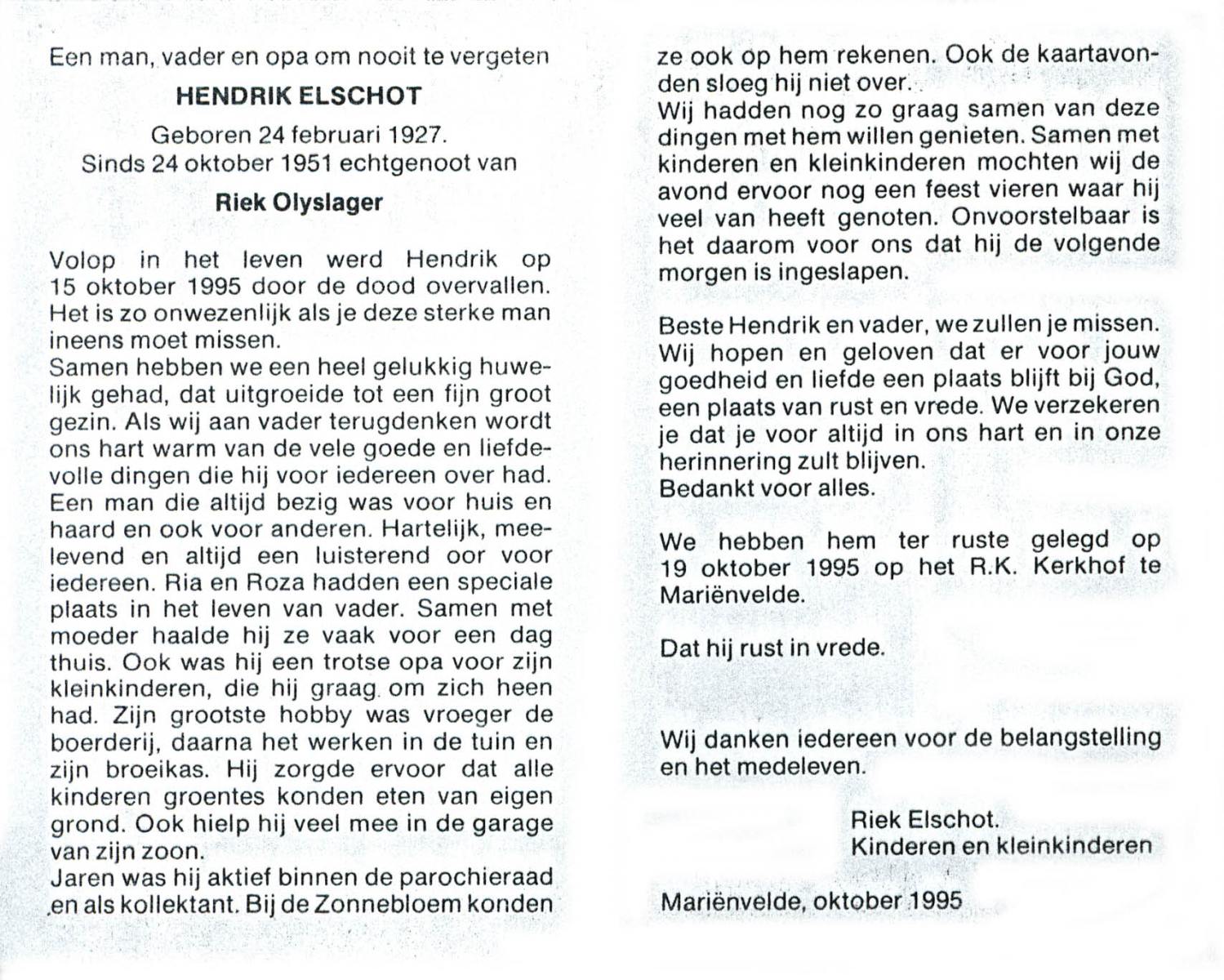 ELSCHOT, Hendrik, geboren op 24-2-1927, overleden op 15-10-1995 op 68-jarige leeftijd, begraven op 19-10-1995 te Marienvelde.