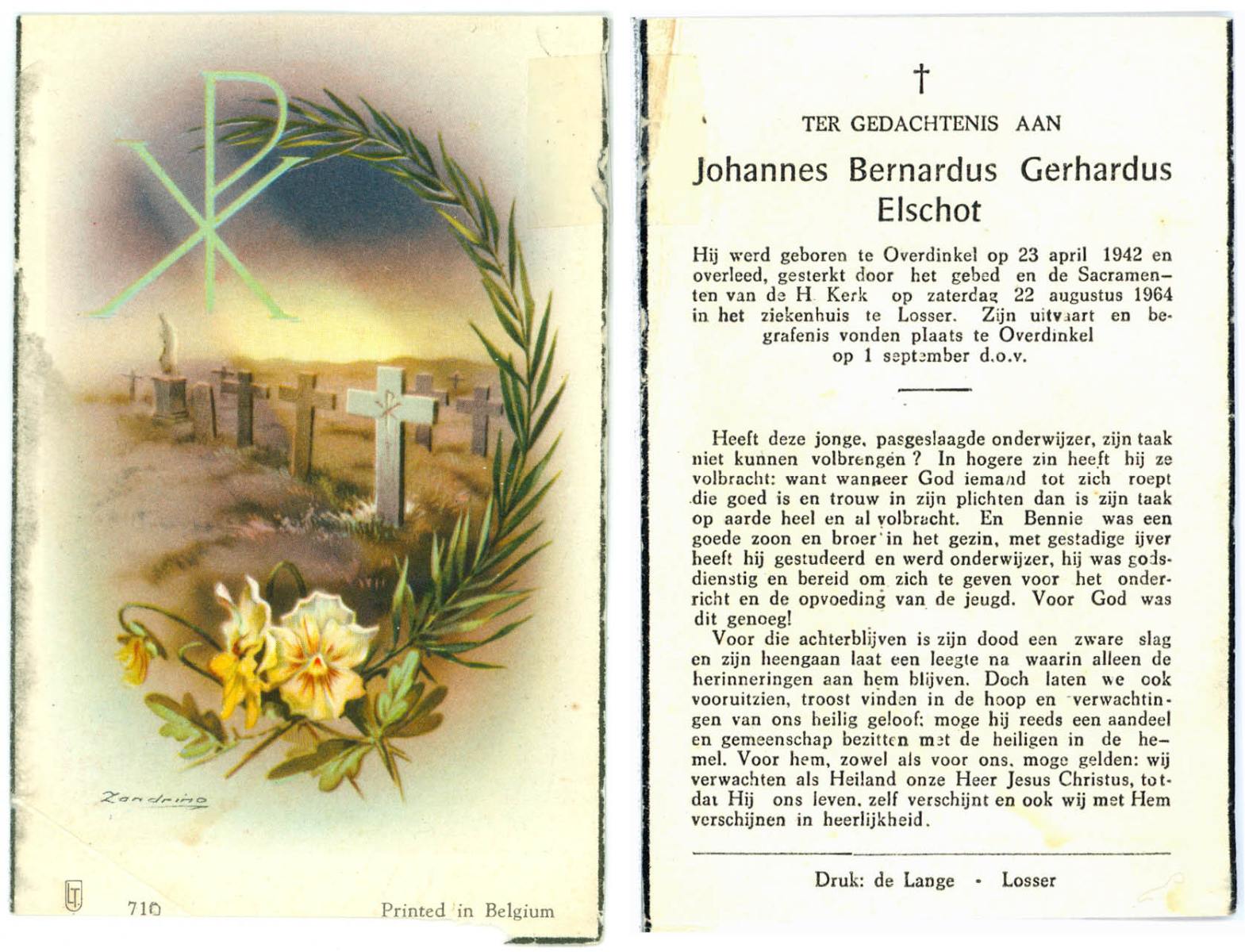 ELSCHOT, Johannes Bernardus Gerhardus, geboren op 23-4-1942 te Overdinkel, overleden op 22-8-1964 te Losser op 22-jarige leeftijd, begraven op 1-9-1964 te Overdinkel.