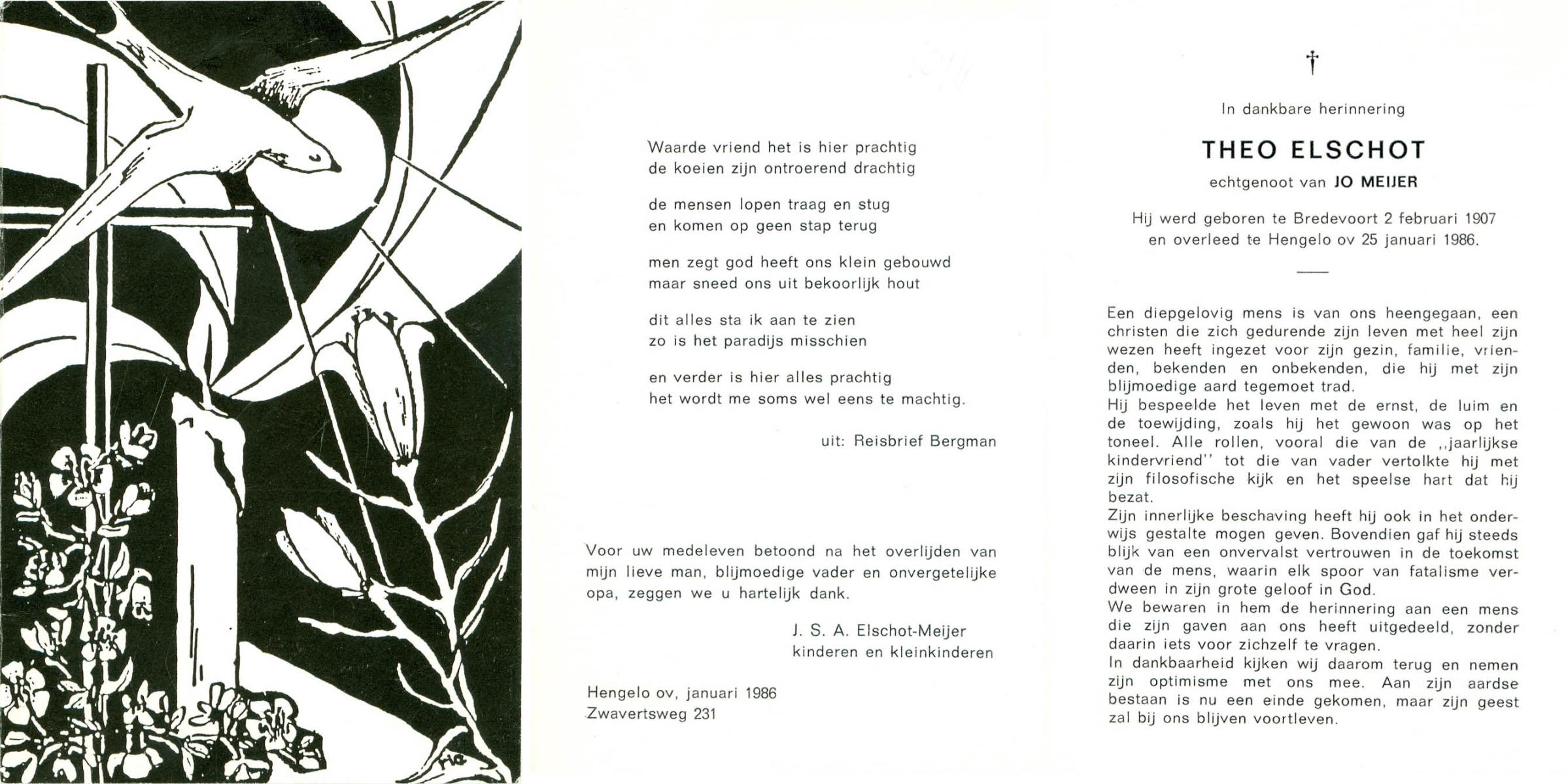 ELSCHOT, Theo, geboren op 2-2-1907 te Bredevoort, overleden op 25-1-1966 te Hengelo (Ov.) op 58-jarige leeftijd.