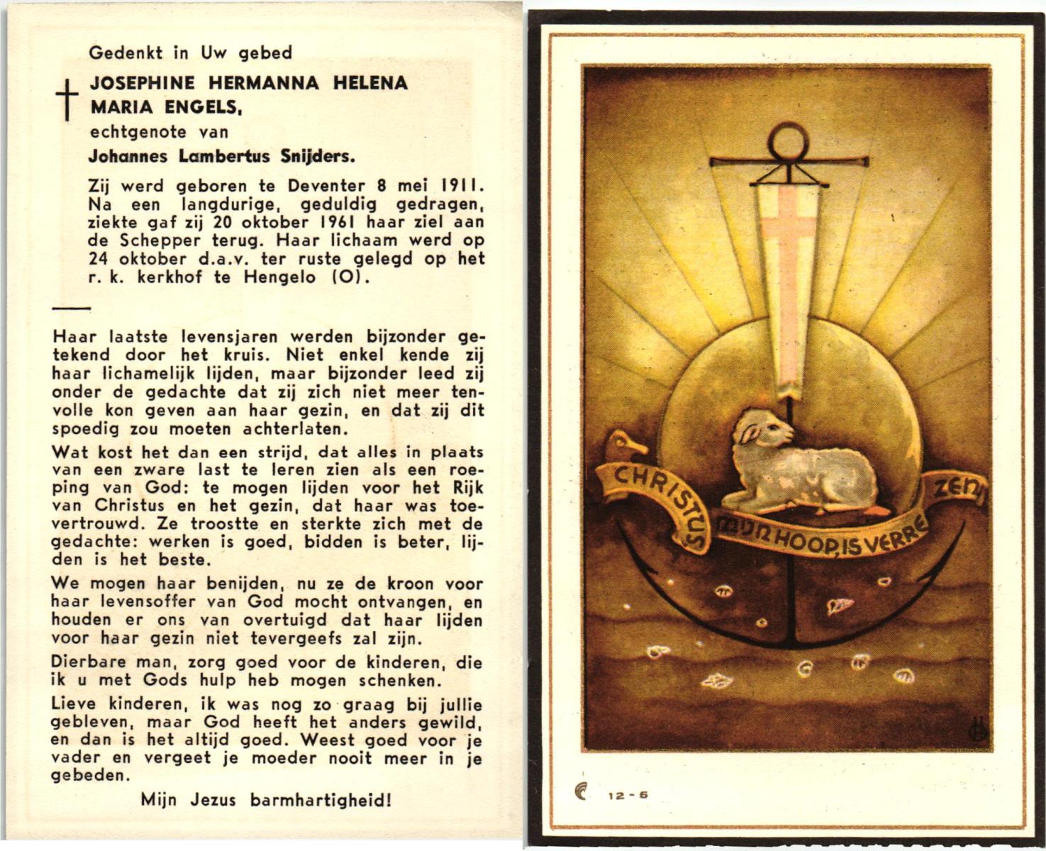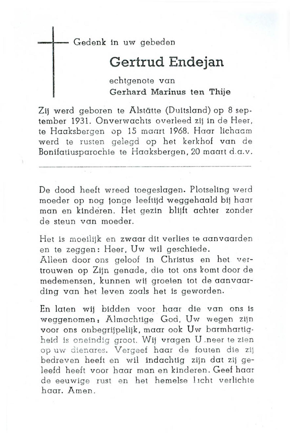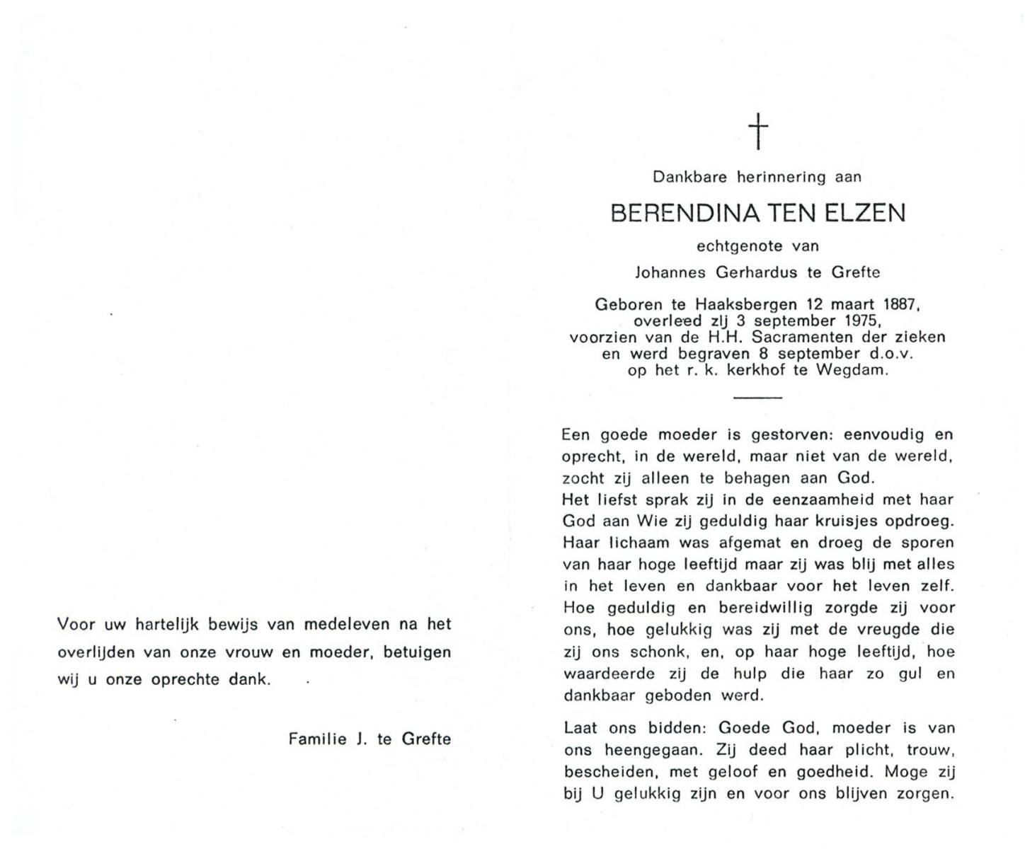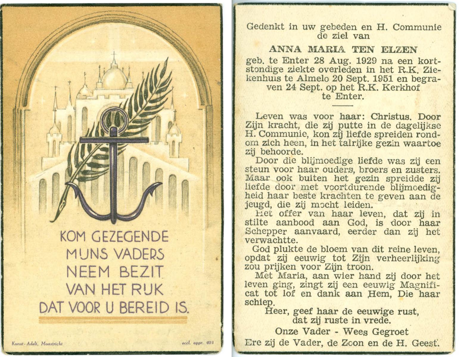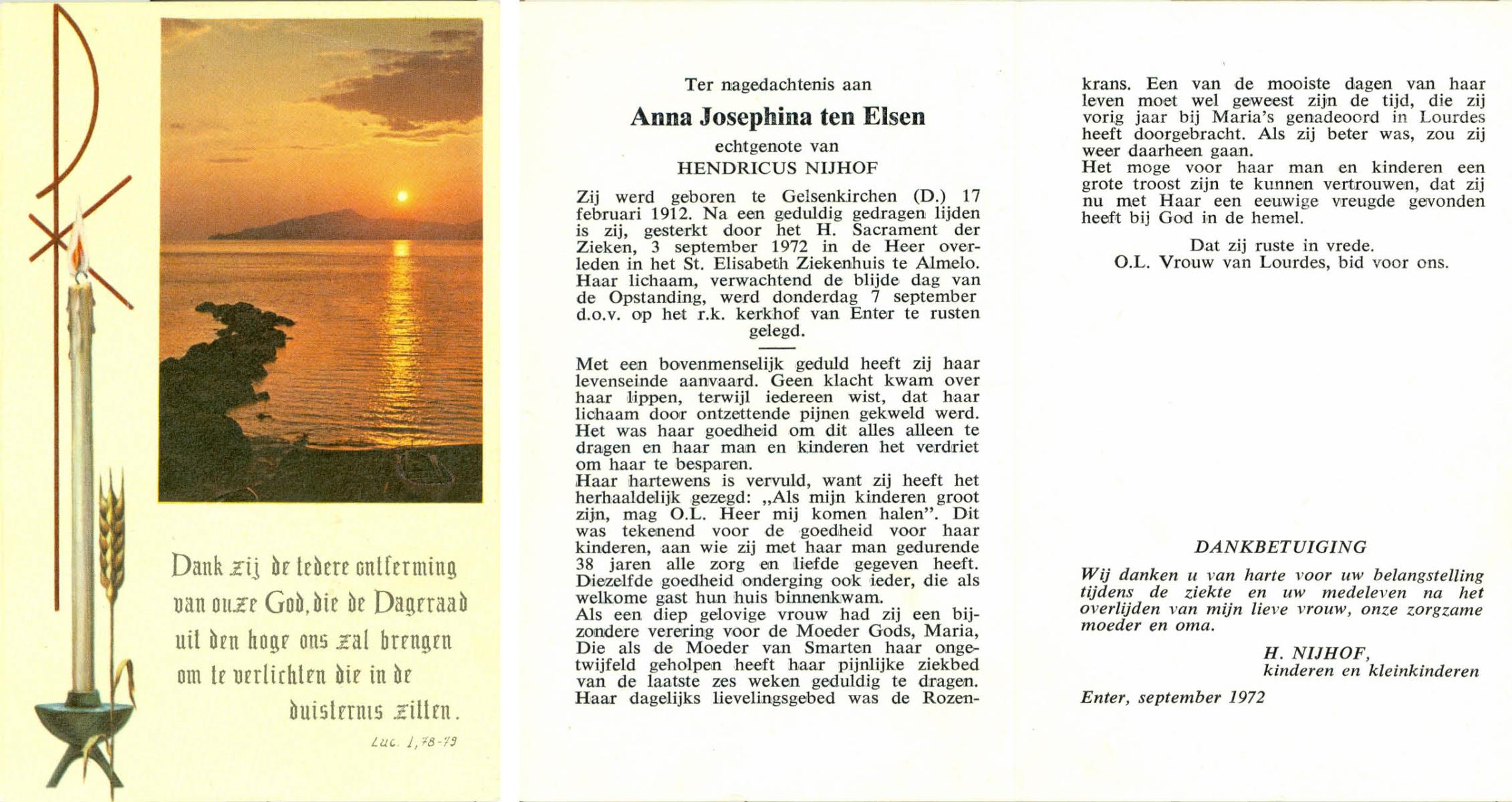 ELSEN, ten, Anna Josephina, geboren op 17-2-1912 te Gelsenkirchen (Dld.), overleden op 3-9-1972 te Almelo op 60-jarige leeftijd, begraven op 7-9-1972 te Wierden, Enter.