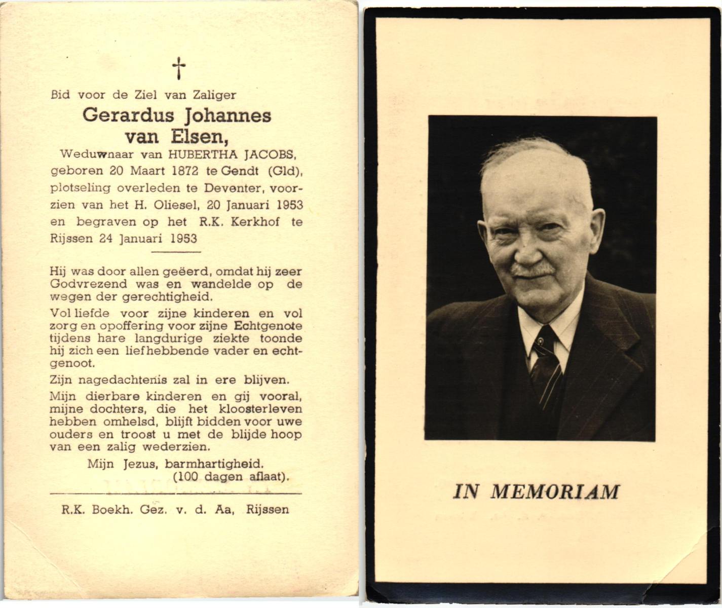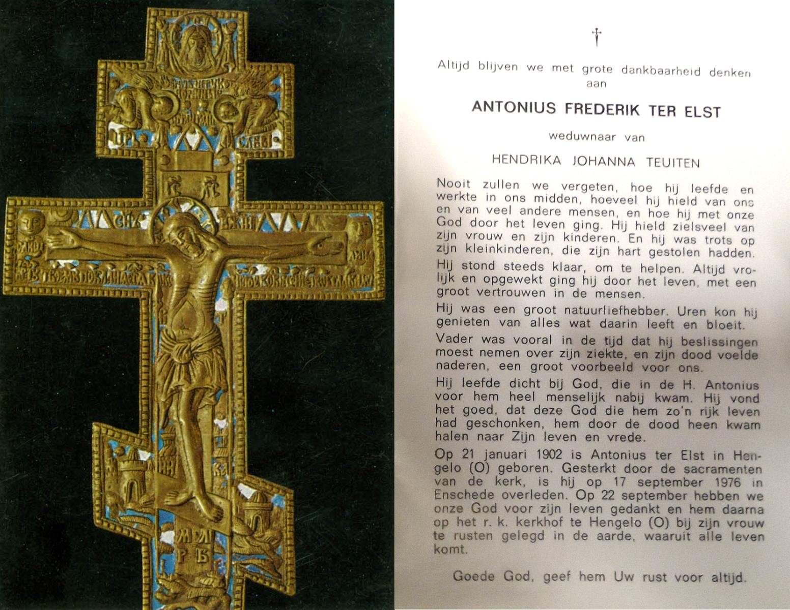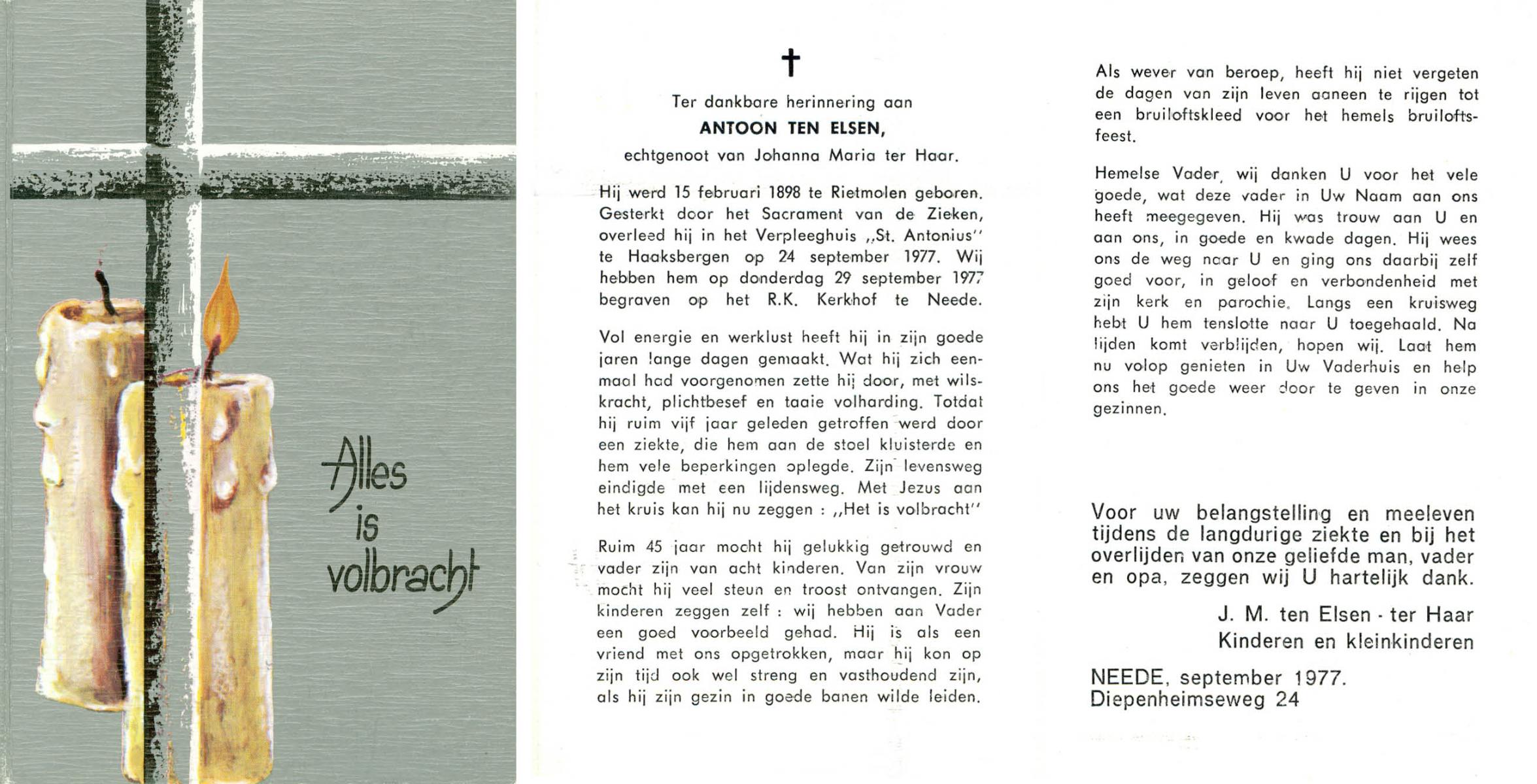 ELSEN, ten, Antoon, geboren op 15-02-1898 te Rietmolen, overleden op 24-9-1977 te Haaksbergen op 79-jarige leeftijd, begraven op 29-9-1977 te Neede.