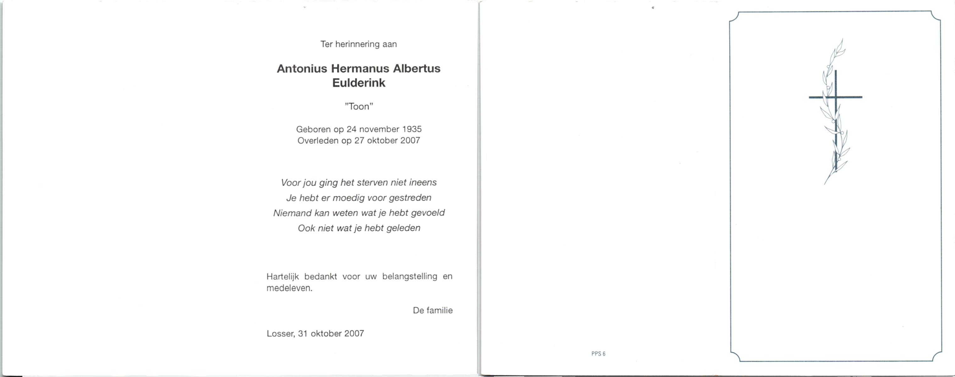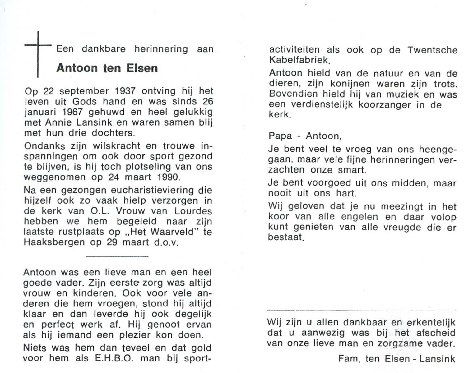 ELSEN, ten, Antoon, geboren op 22-9-1937, overleden op 24-3-1990 op 52-jarige leeftijd, begraven op 29-3-1990 te Haaksbergen.