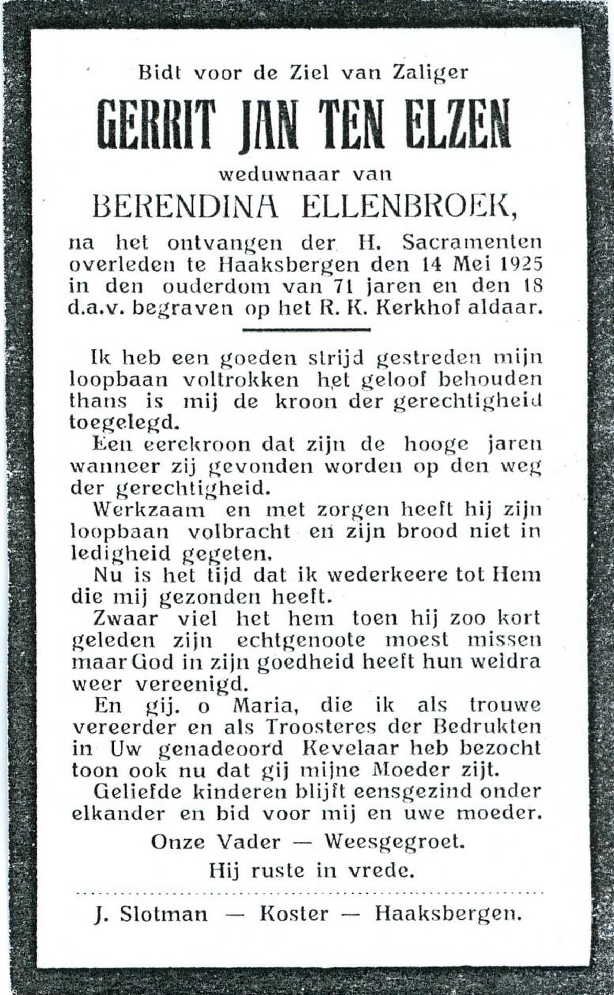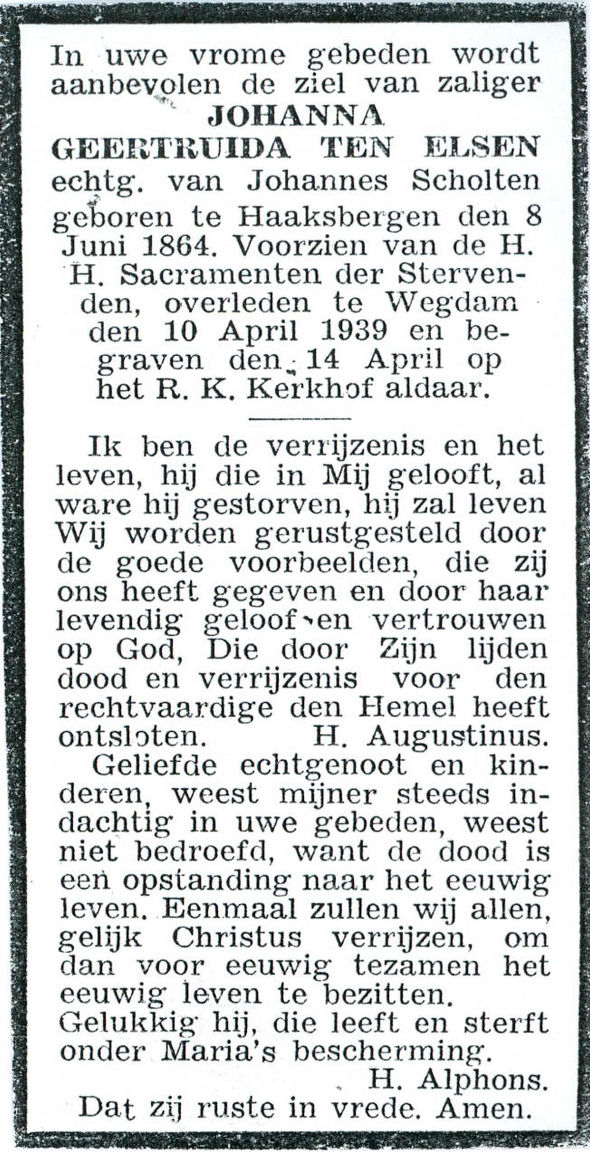 ELSEN, ten, Johanna Geertruida, geboren op 08-06-1864 te Haaksbergen, overleden op 10-4-1939 te Wegdam op 74-jarige leeftijd, begraven op 14-4-1939 te Wegdam.