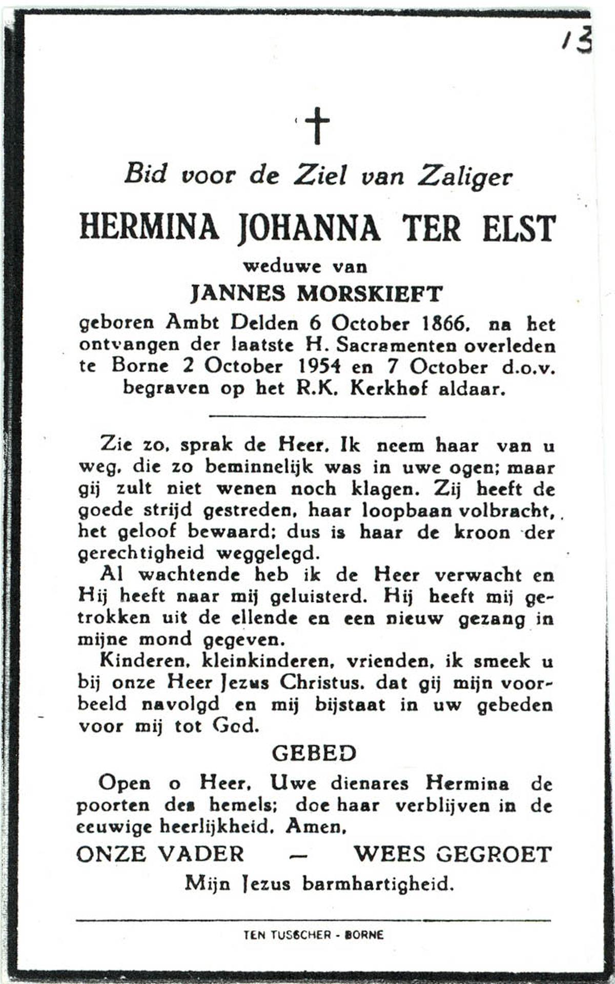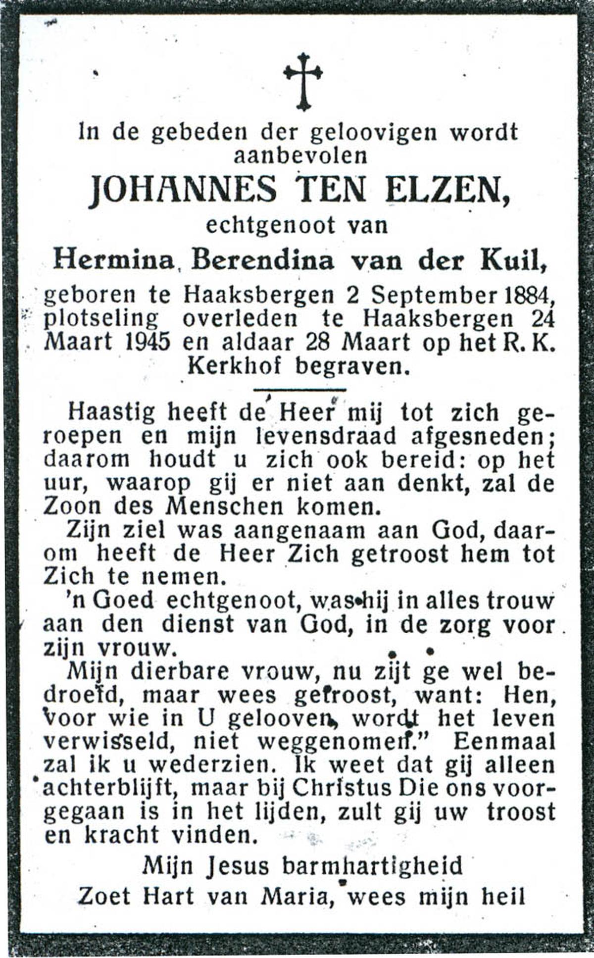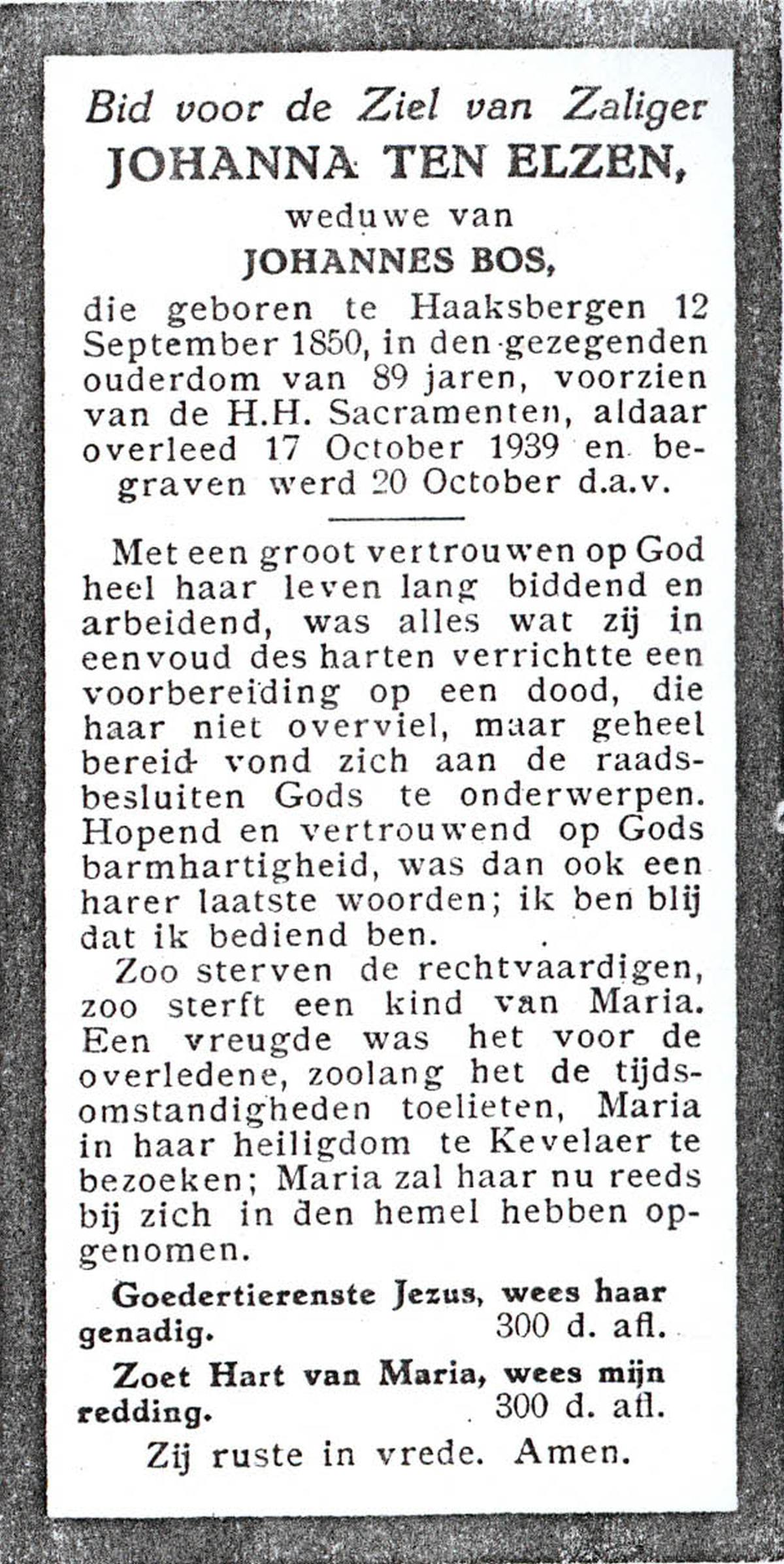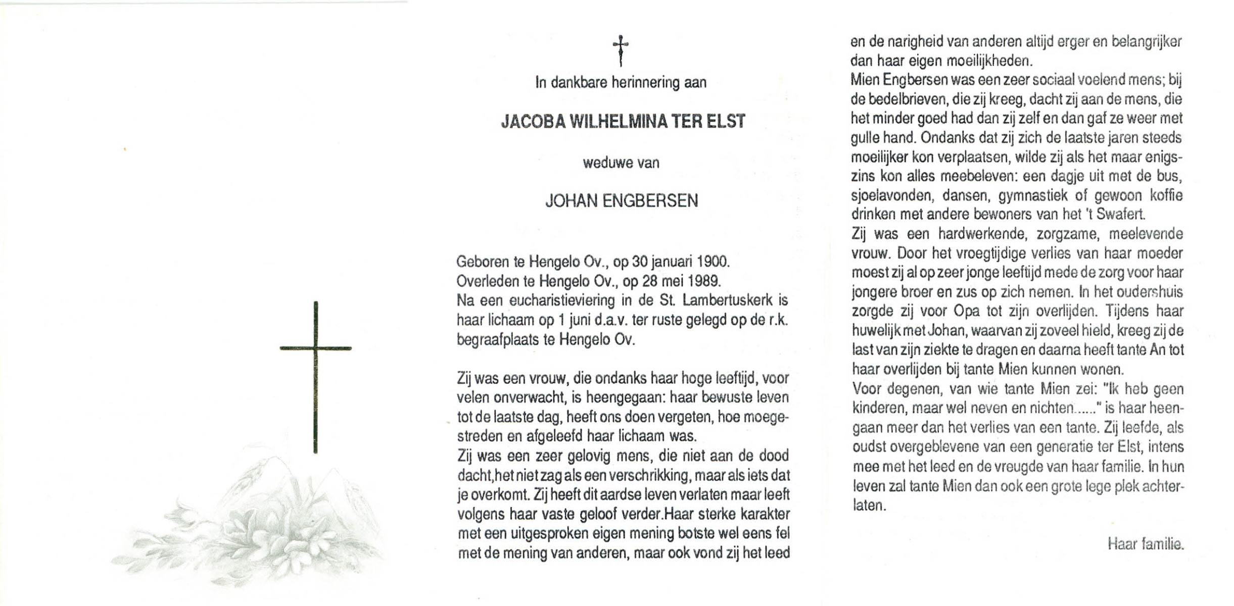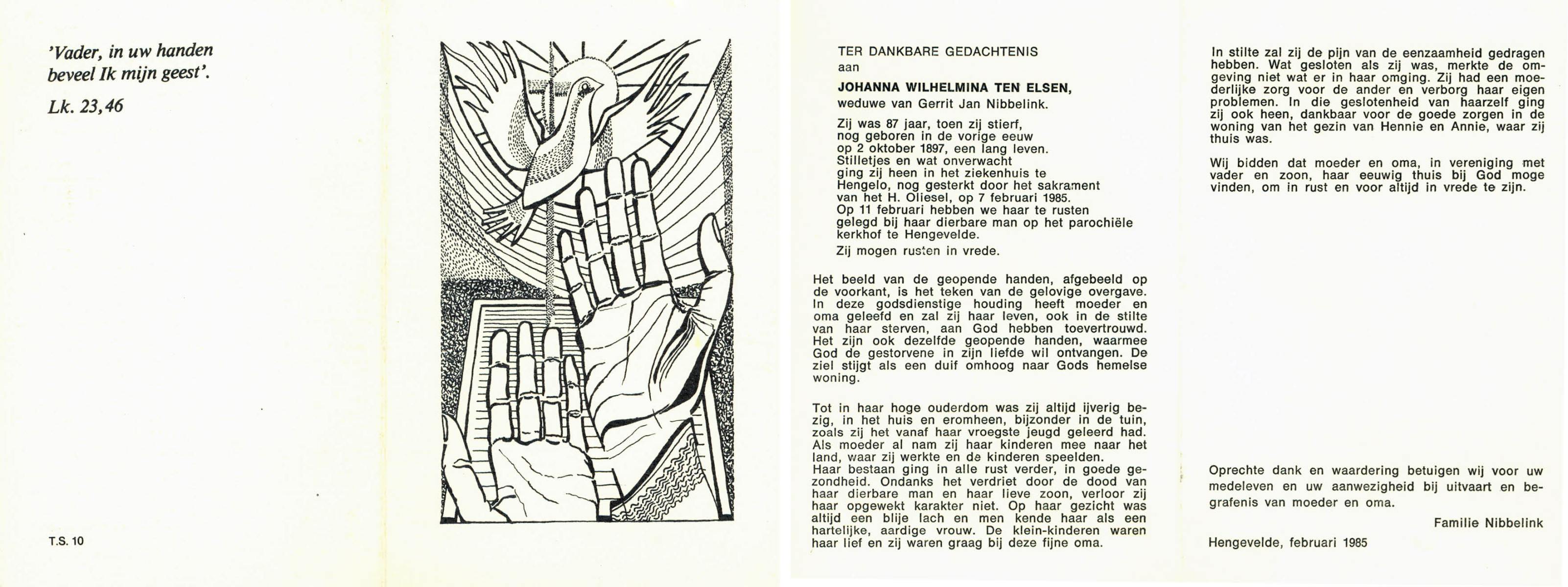 ELSEN, ten, Johanna Wilhelmina, geboren op 02-10-1897, overleden op 7-2-1985 te Hengelo (Ov.) op 87-jarige leeftijd, begraven op 11-2-1985 te Hengevelde.