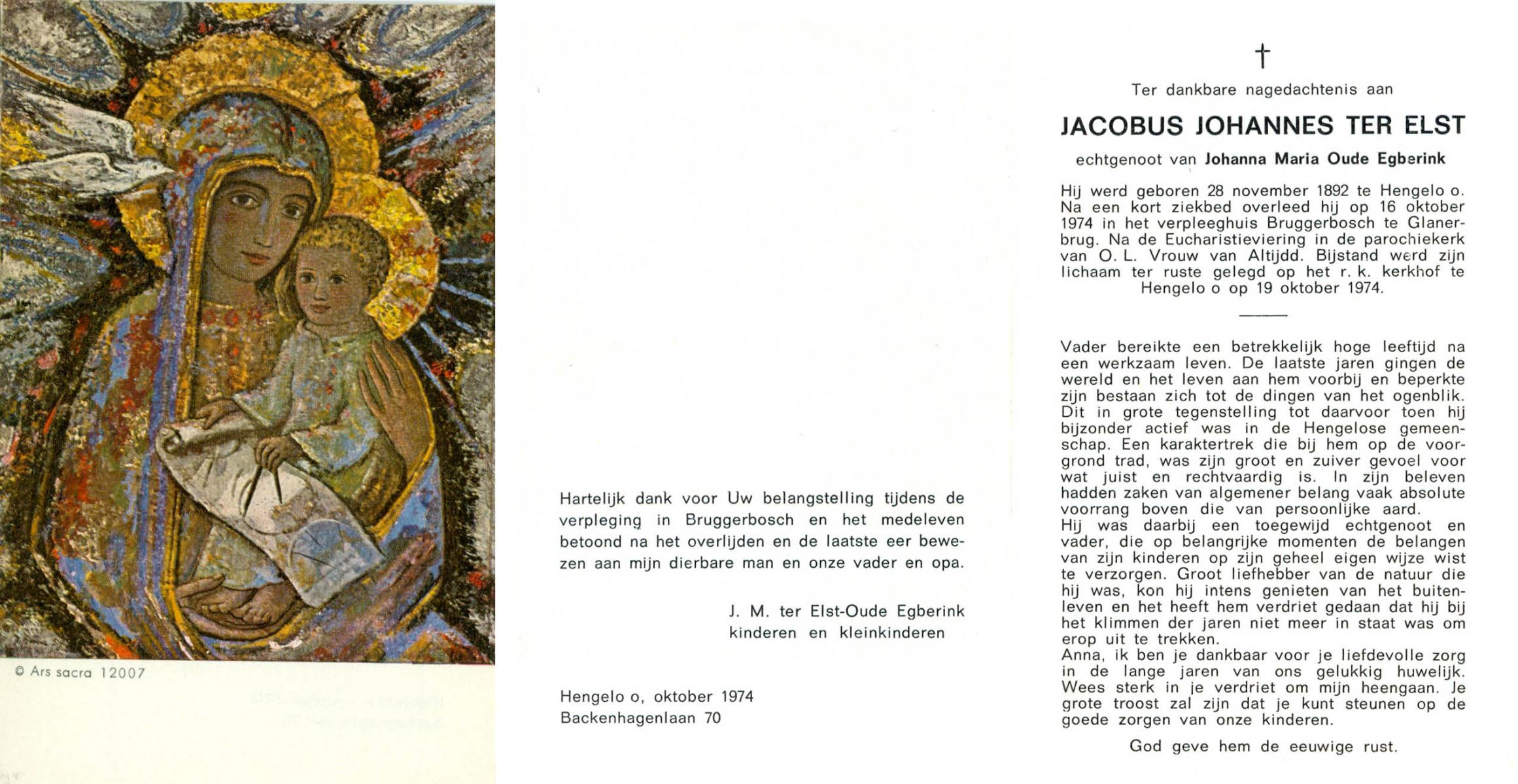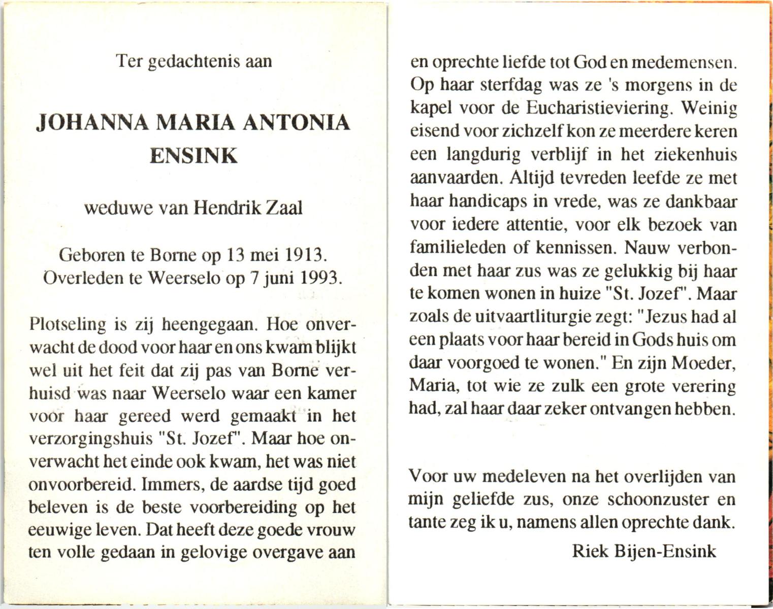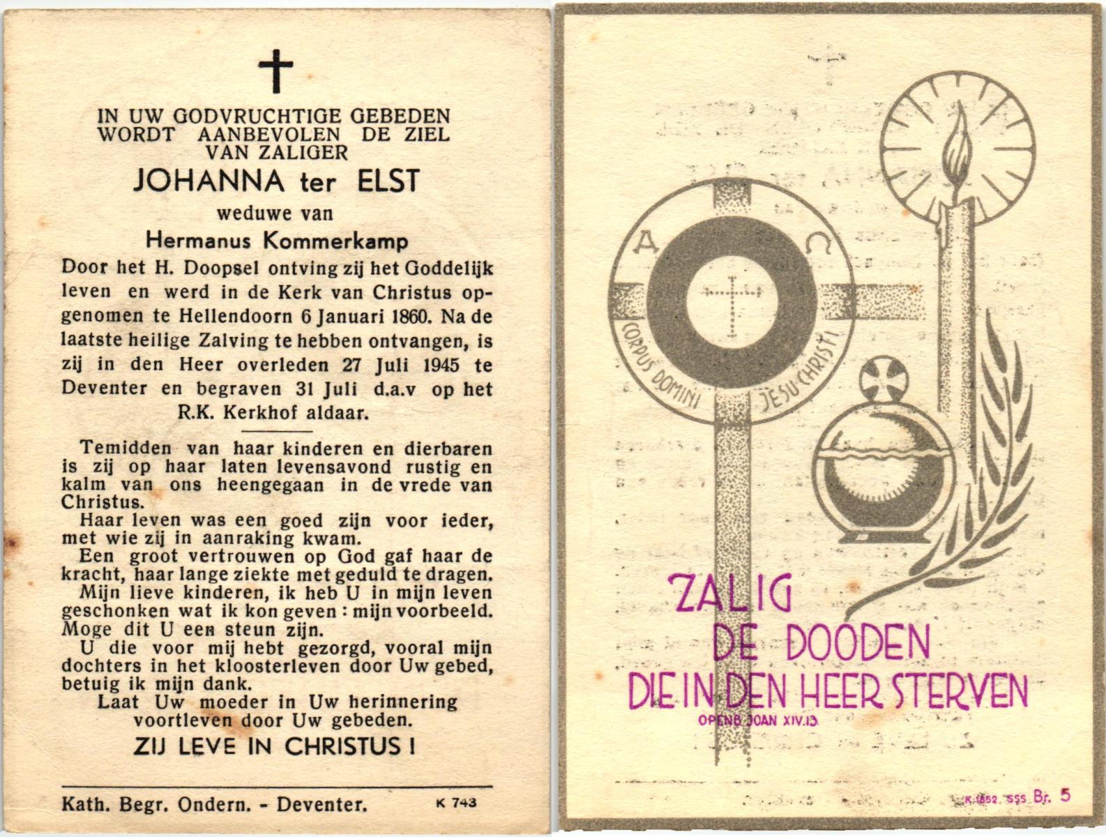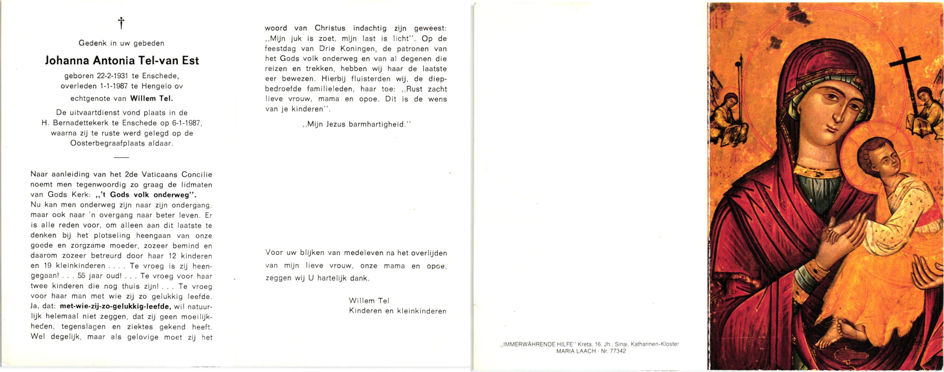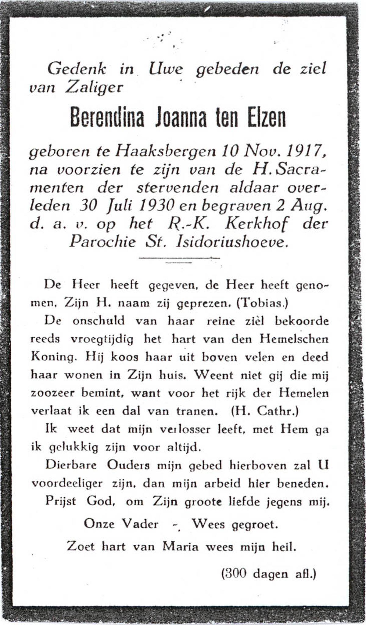 ELSEN, ten, Johanna Wilhelmina, geboren op 02-10-1897, overleden op 7-2-1985 te Hengelo (Ov.) op 87-jarige leeftijd, begraven op 11-2-1985 te Hengevelde.