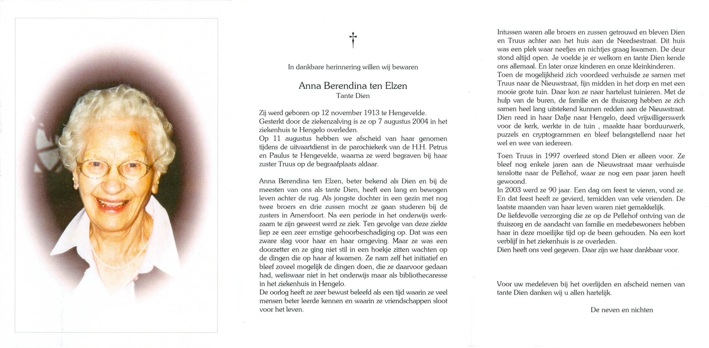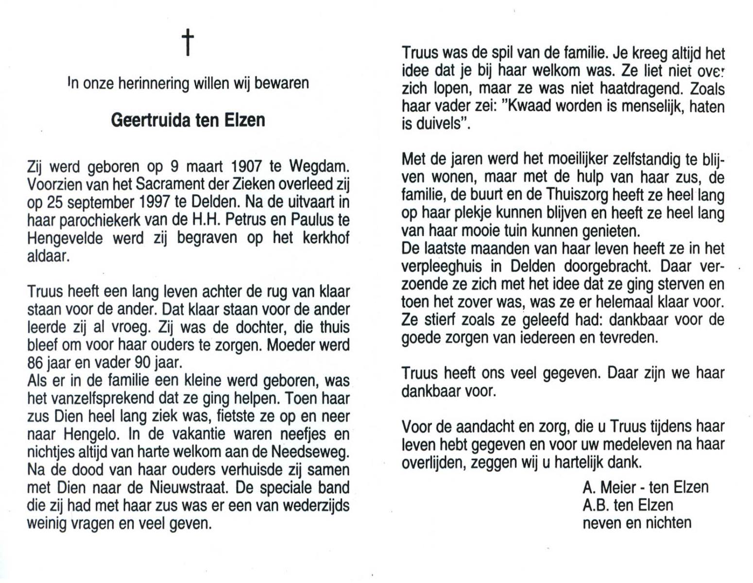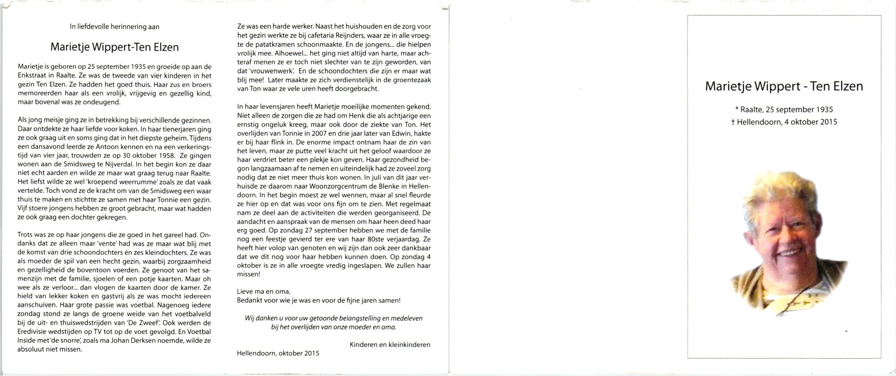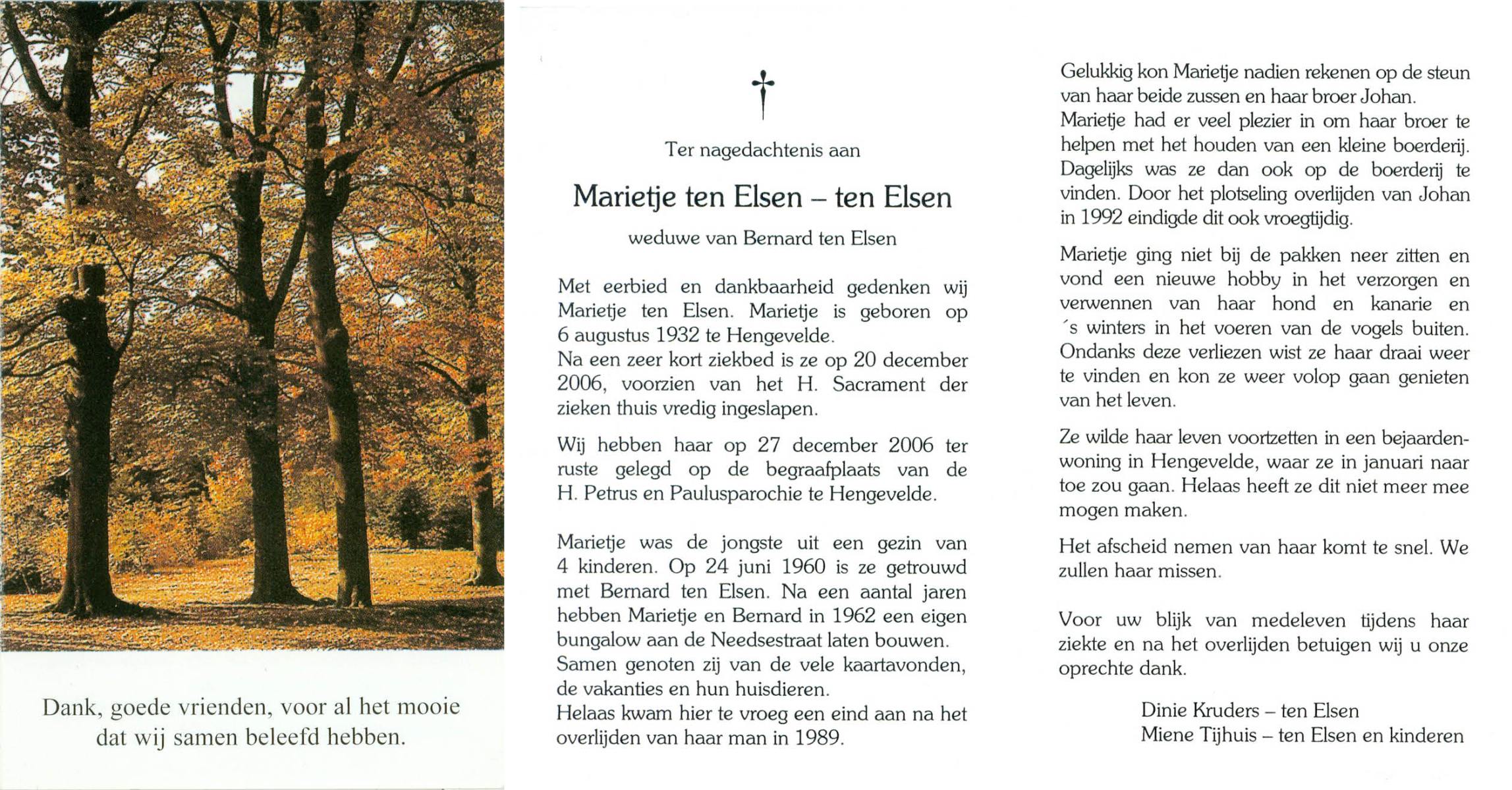 ELSEN, ten, Marietje, geboren op 6-8-1932 te Hengevelde, overleden op 20-12-2006 te Hengevelde op 74-jarige leeftijd, begraven op 27-12-2006 te Hengevelde.