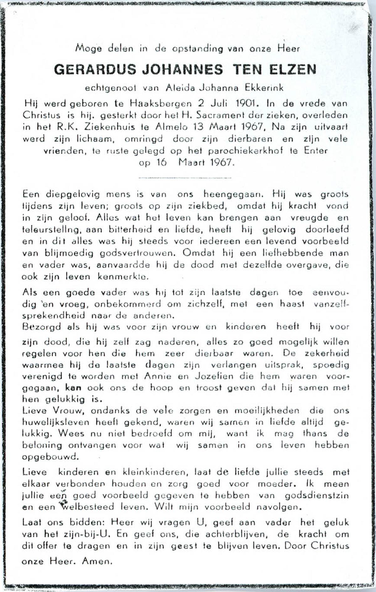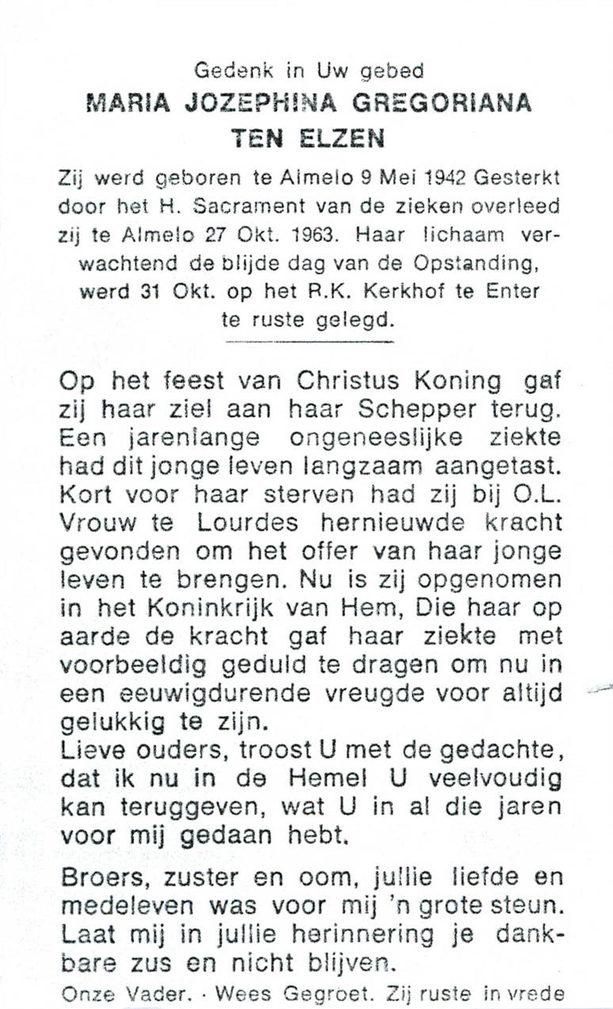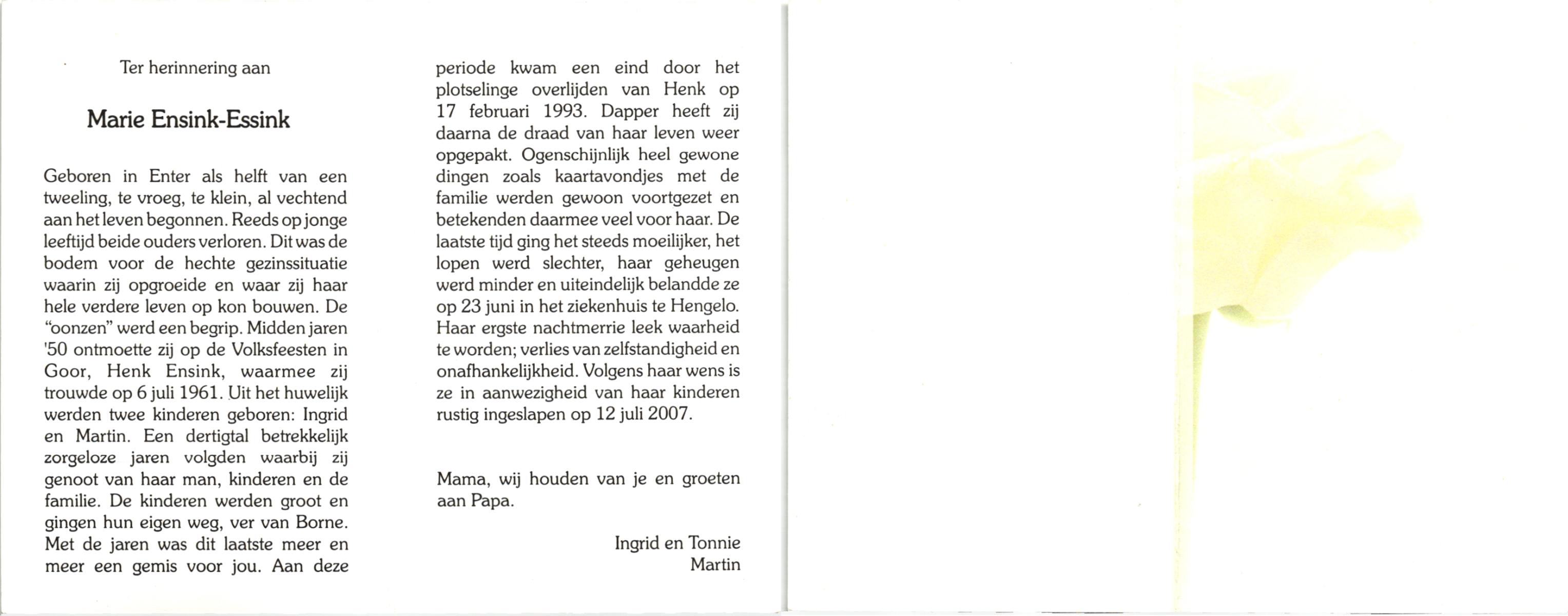 ELSEN, ten, Marietje, geboren op 6-8-1932 te Hengevelde, overleden op 20-12-2006 te Hengevelde op 74-jarige leeftijd, begraven op 27-12-2006 te Hengevelde.