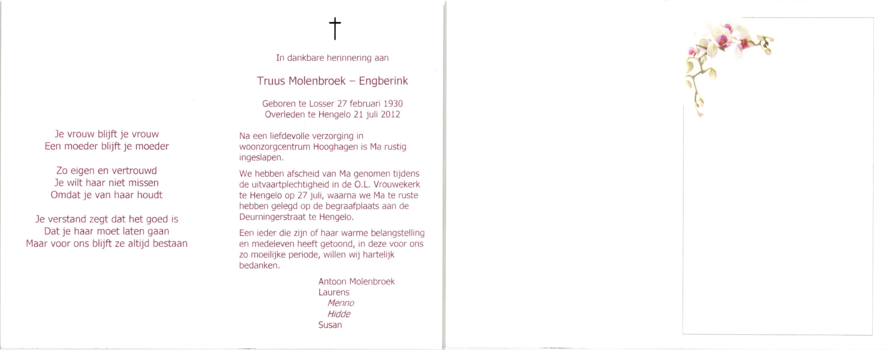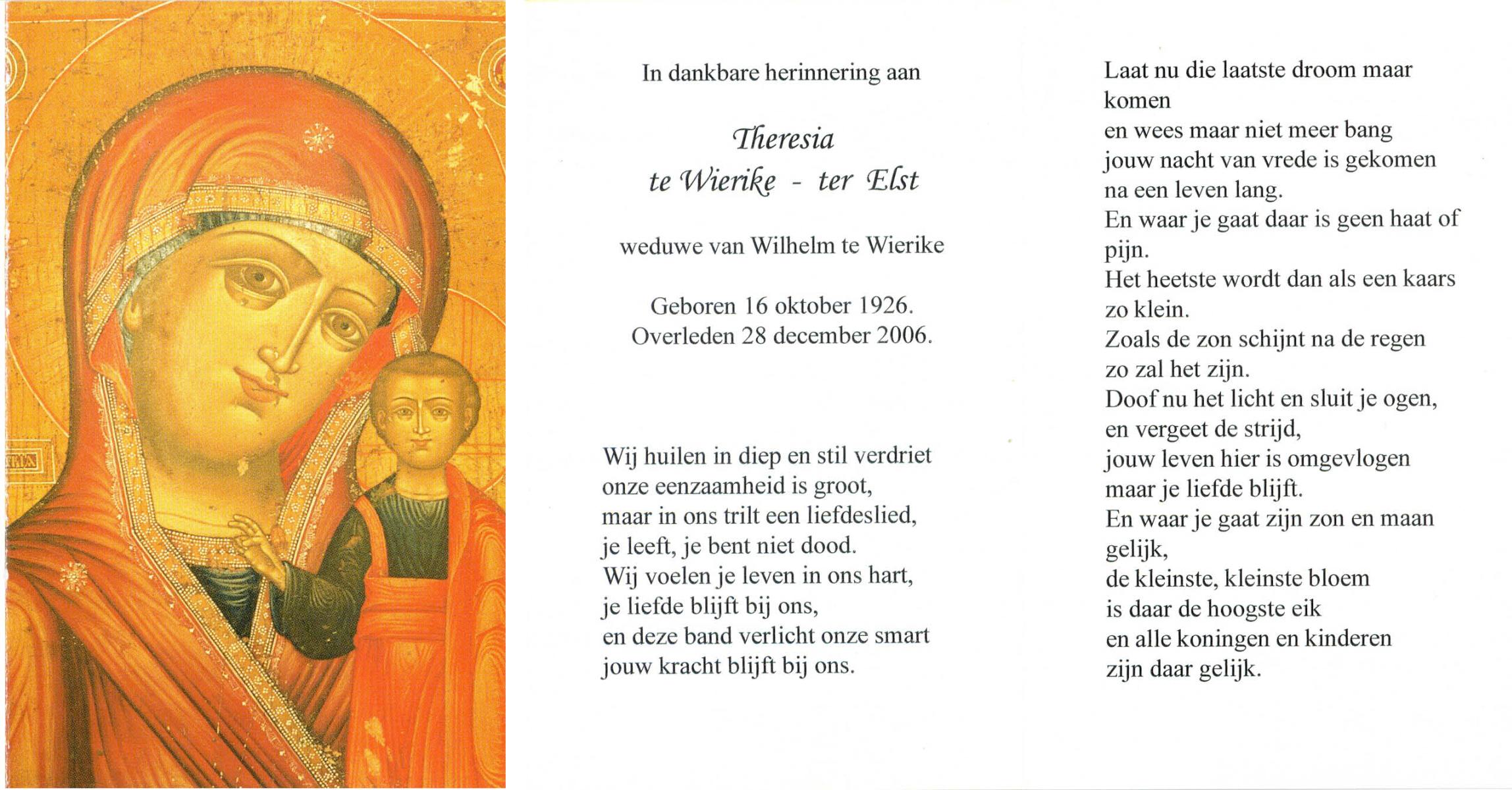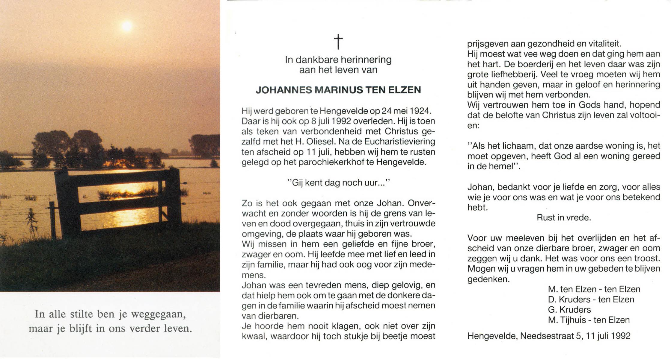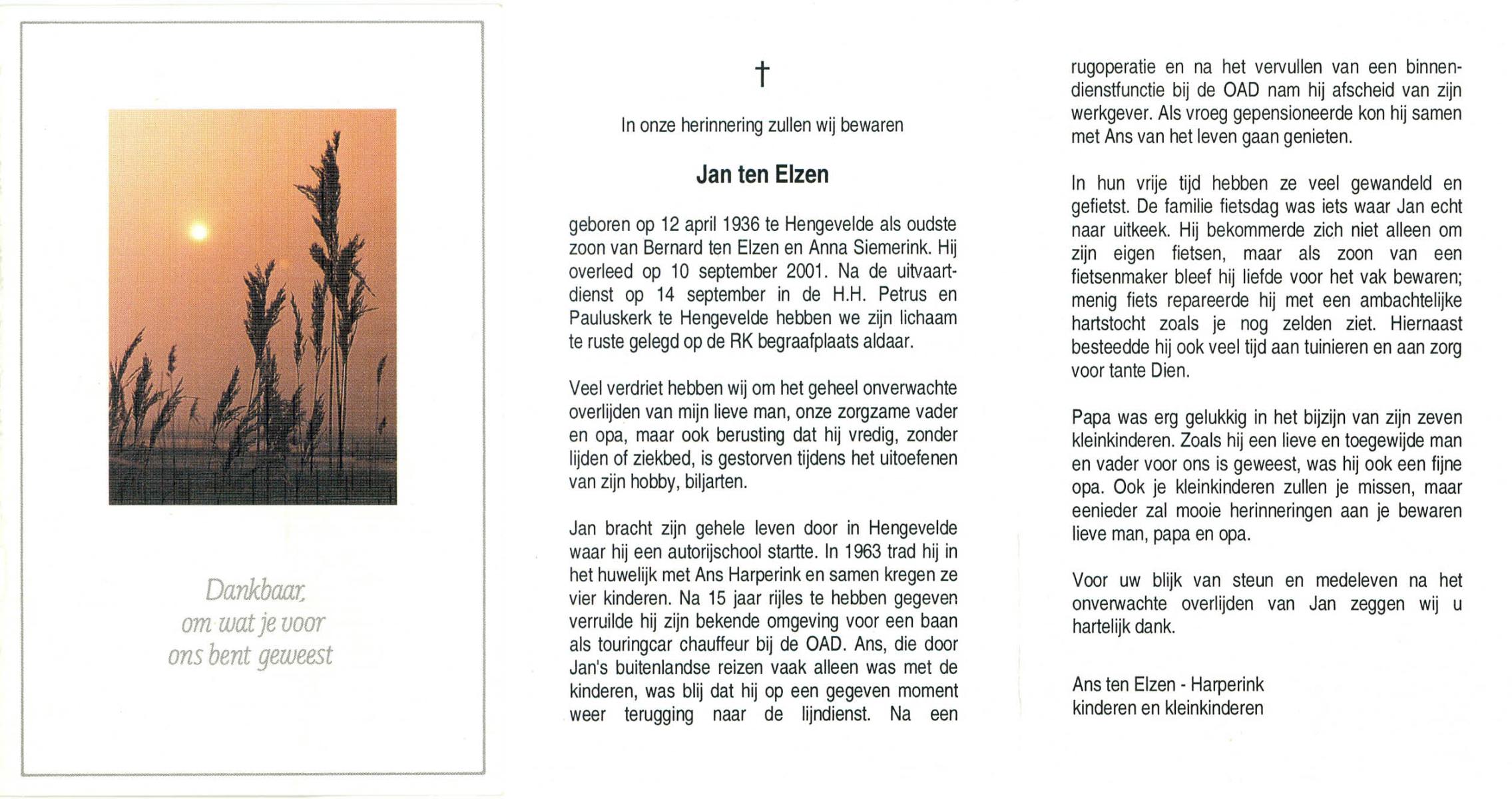 ELSEN, ten, Marietje, geboren op 6-8-1932 te Hengevelde, overleden op 20-12-2006 te Hengevelde op 74-jarige leeftijd, begraven op 27-12-2006 te Hengevelde.