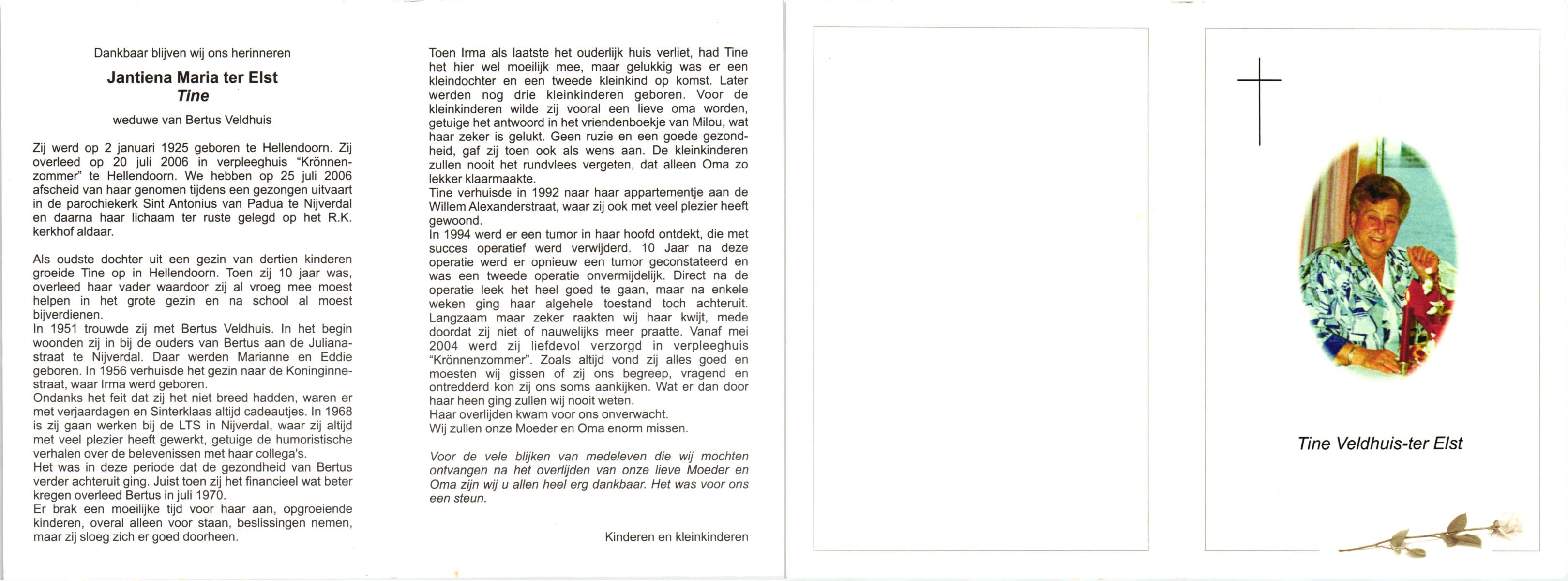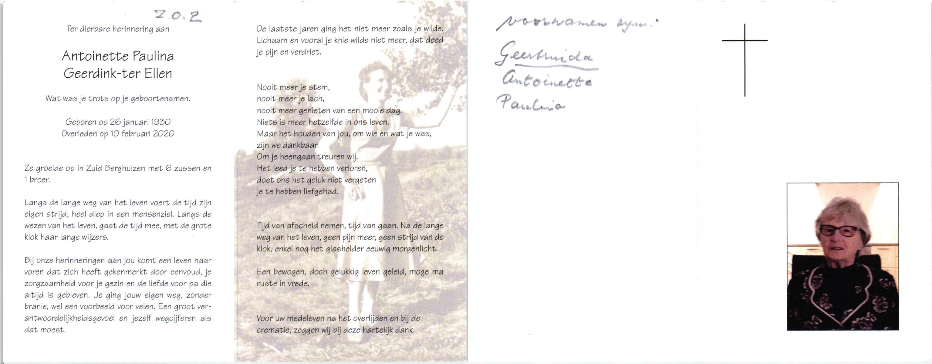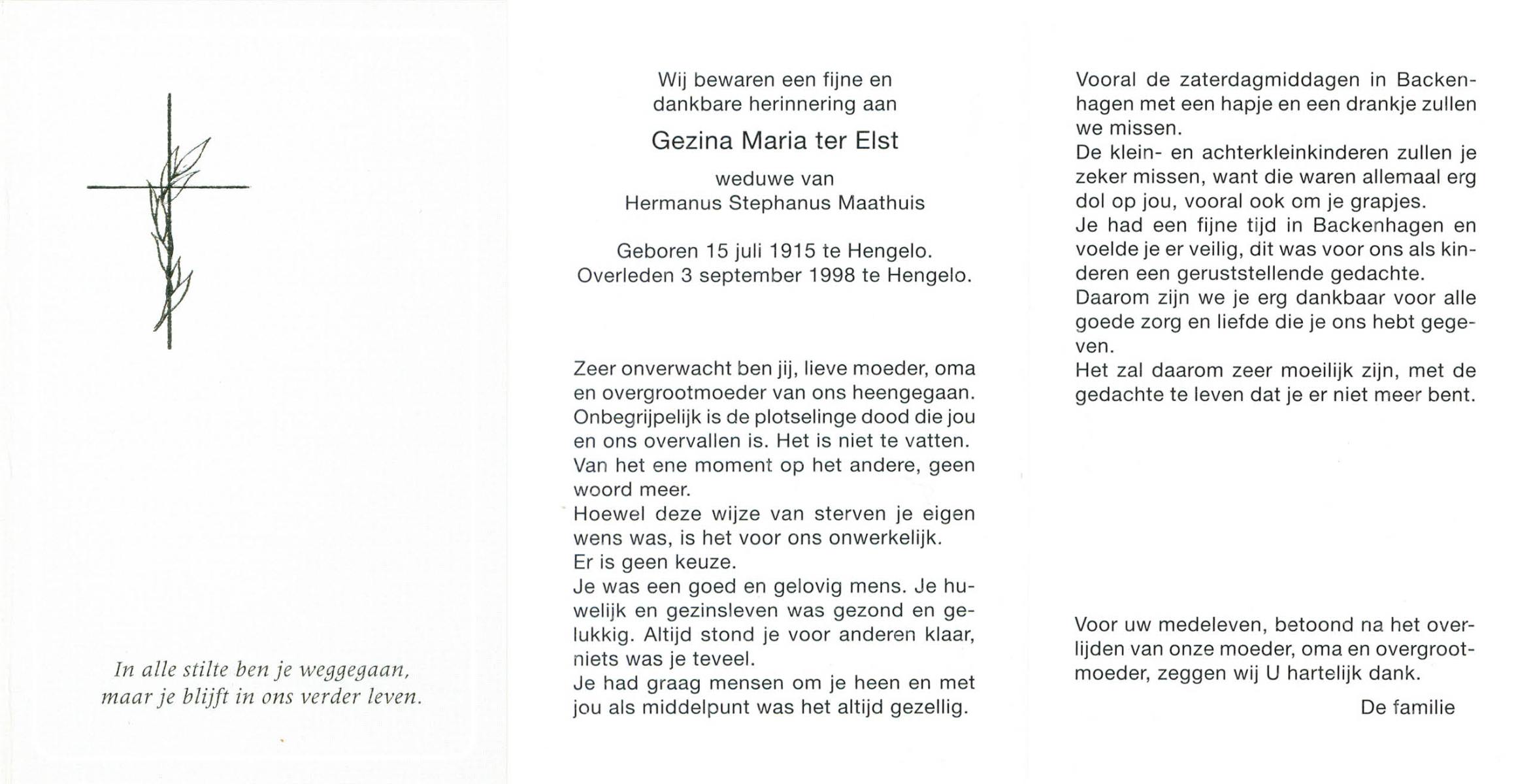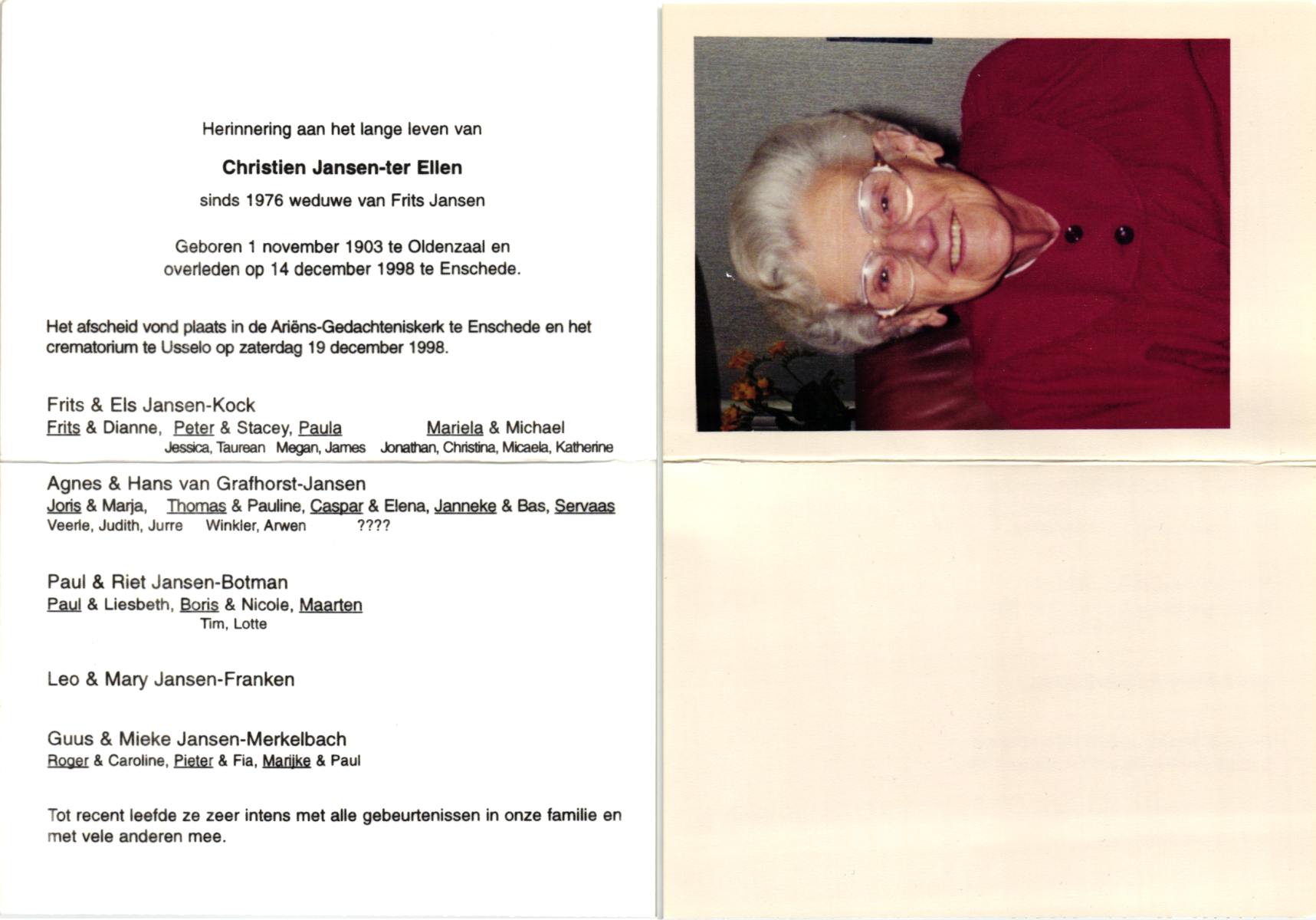 ELLEN, ter, Christien, geboren op 1-11-1903 te Oldenzaal, overleden op 14-12-1998 te Enschede op 95-jarige leeftijd, gecremeerd op 19-12-1998 te Usselo.