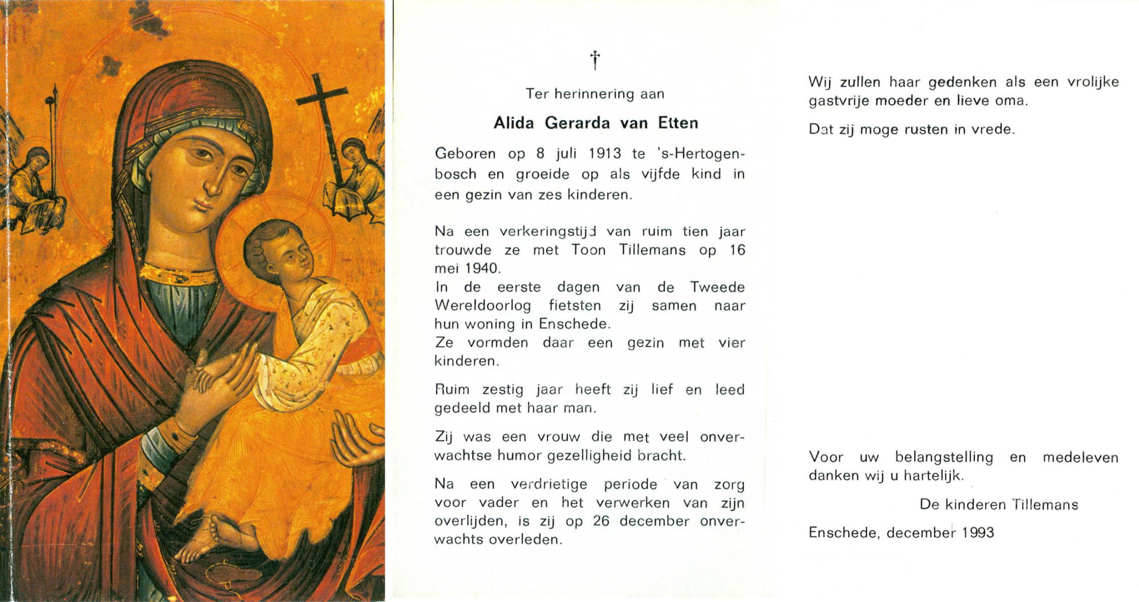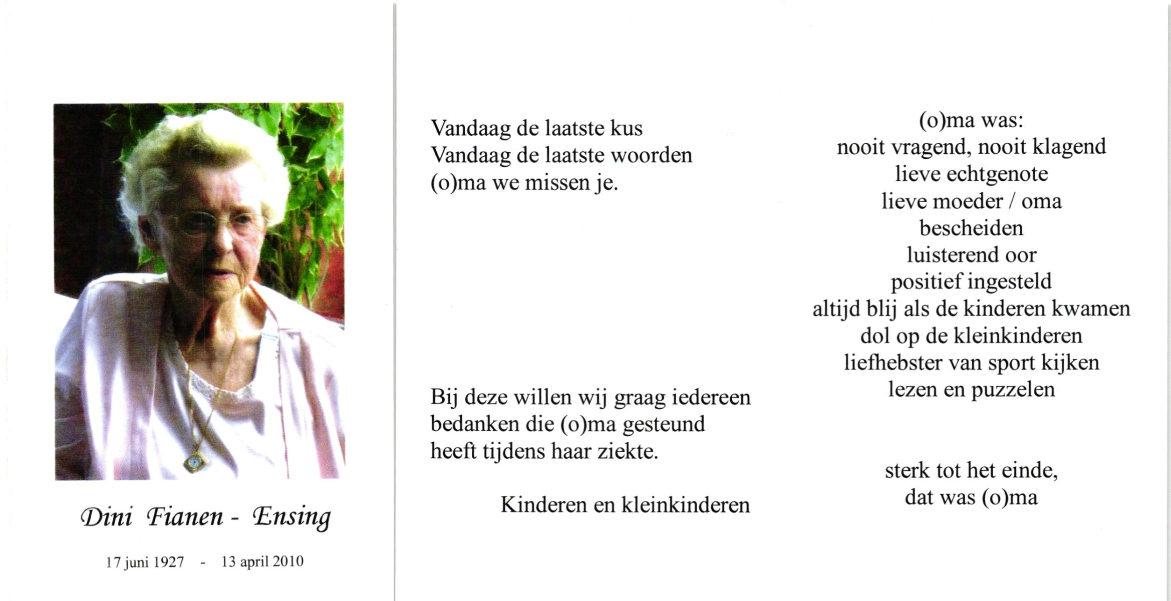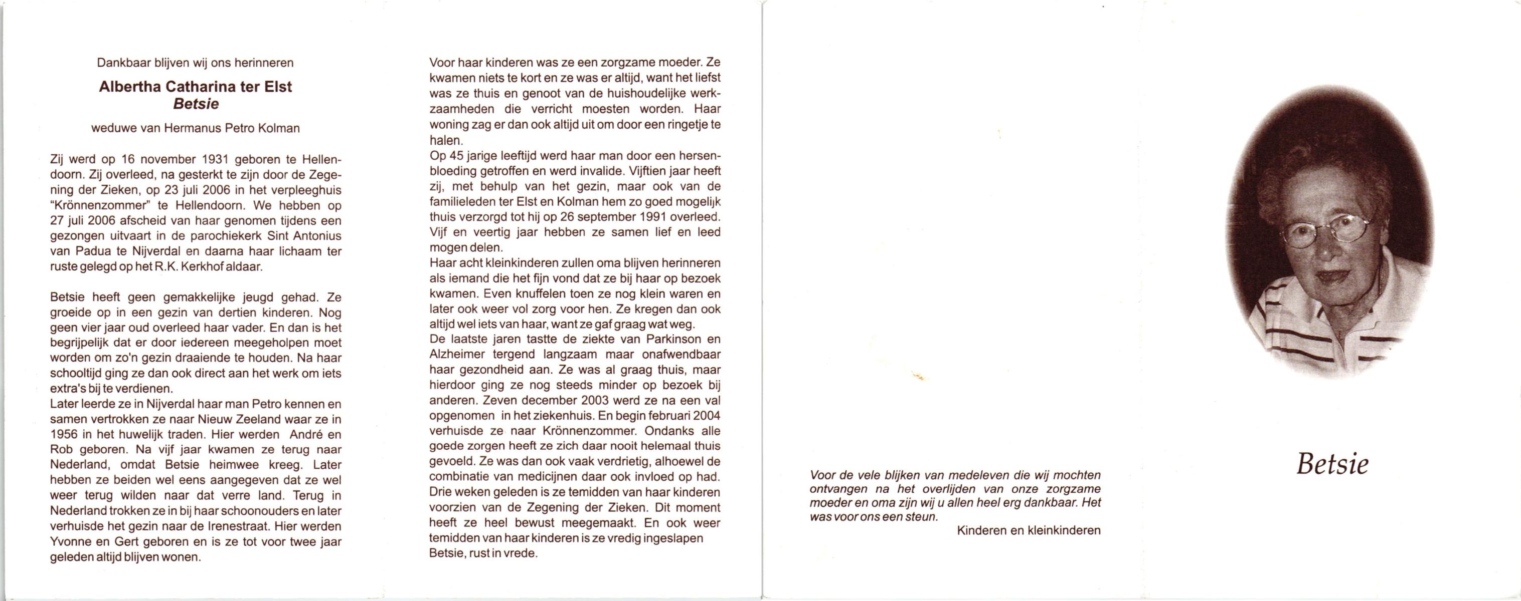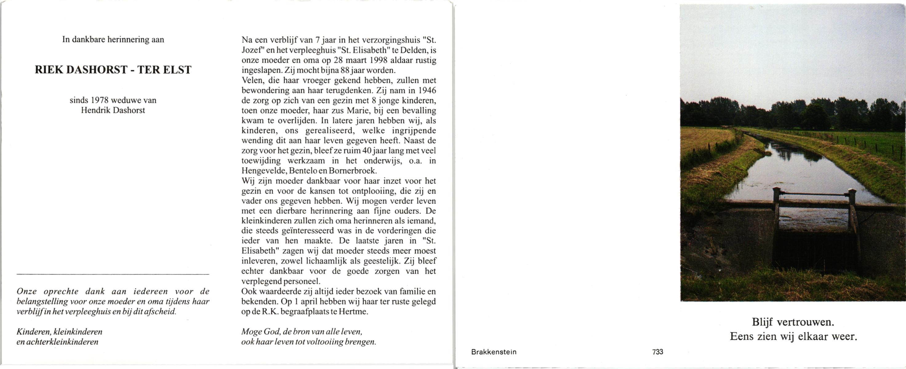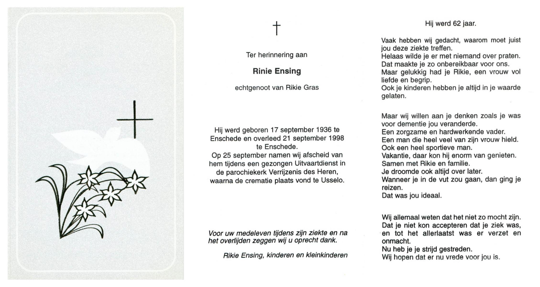 ELLEN, ter, Christien, geboren op 1-11-1903 te Oldenzaal, overleden op 14-12-1998 te Enschede op 95-jarige leeftijd, gecremeerd op 19-12-1998 te Usselo.