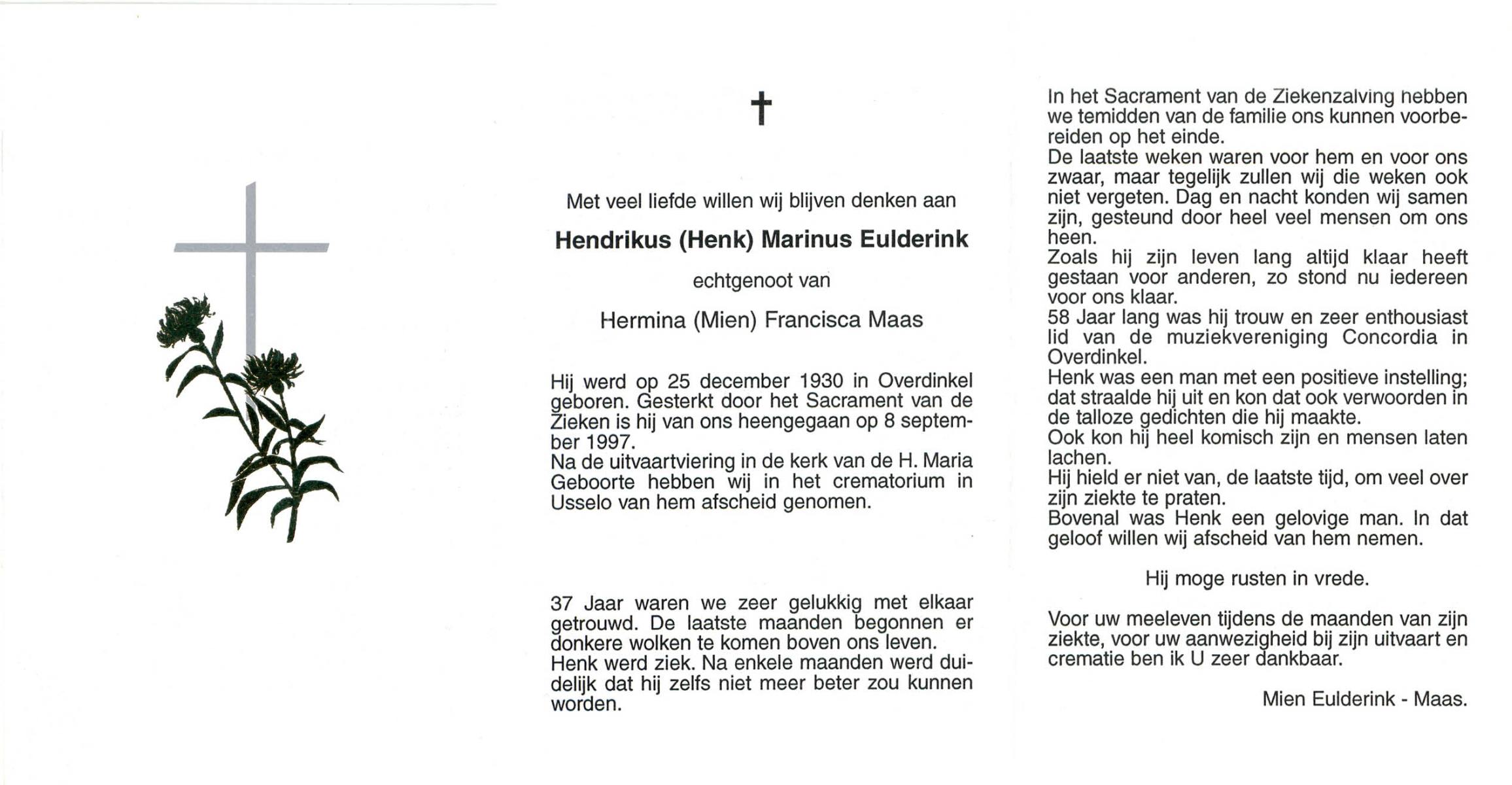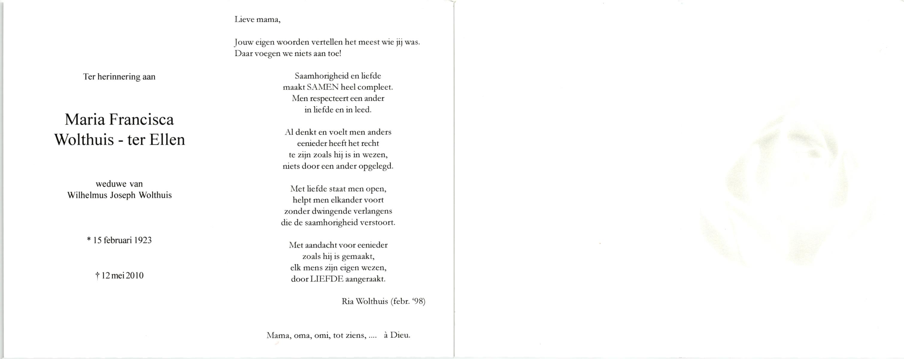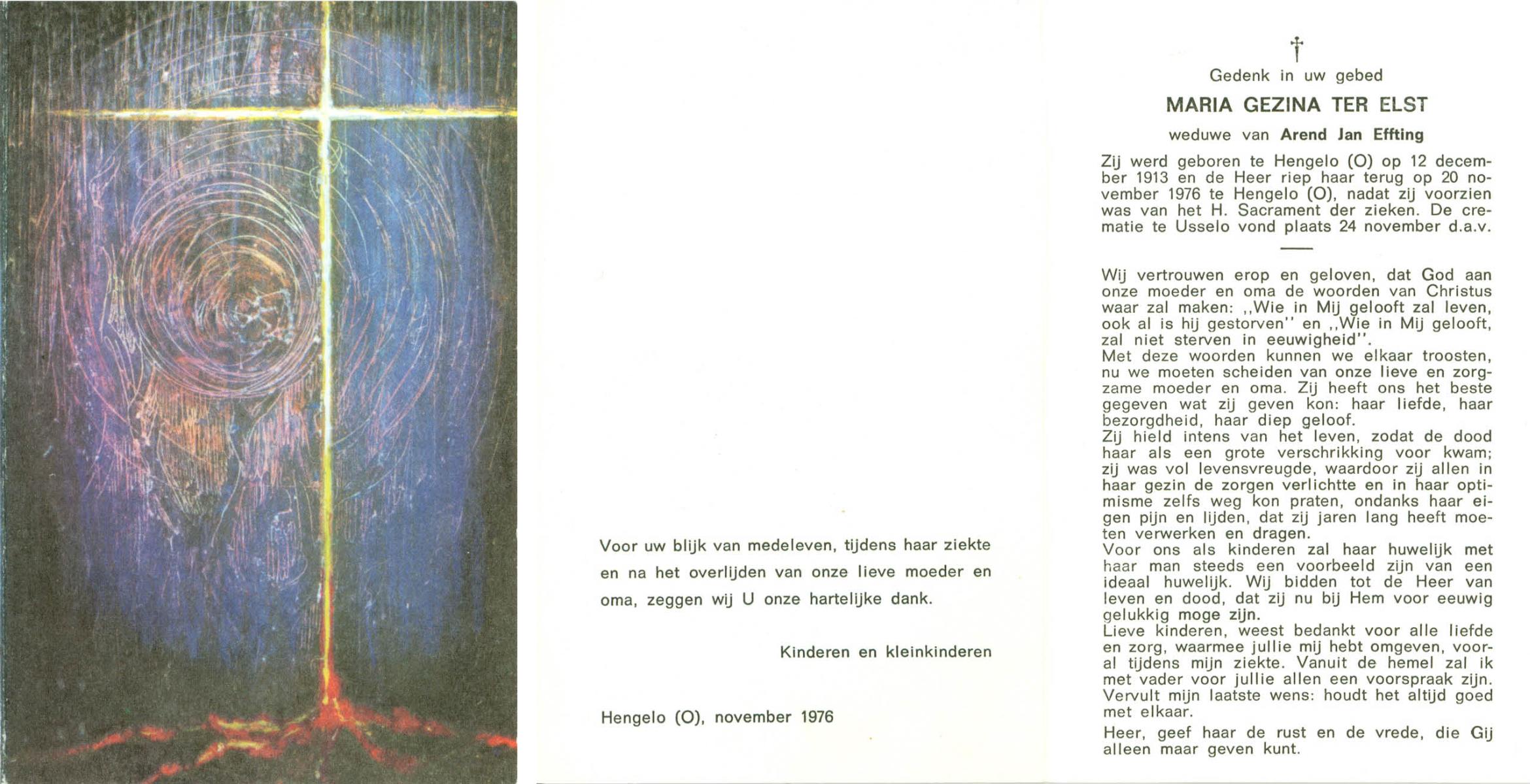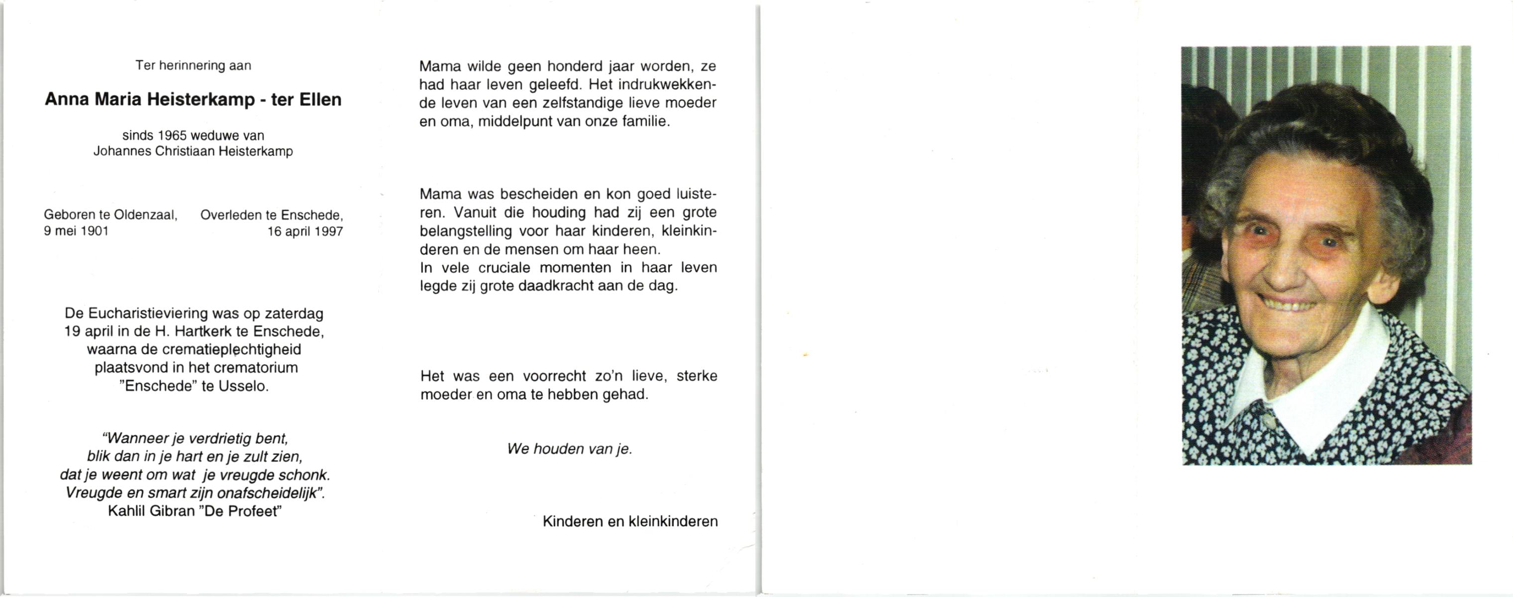 ELLEN, ter, Anna Maria, geboren op 9-5-1901 te Oldenzaal, overleden op 16-4-1997 te Enschede op 95-jarige leeftijd, gecremeerd op 19-4-1997 te Usselo.