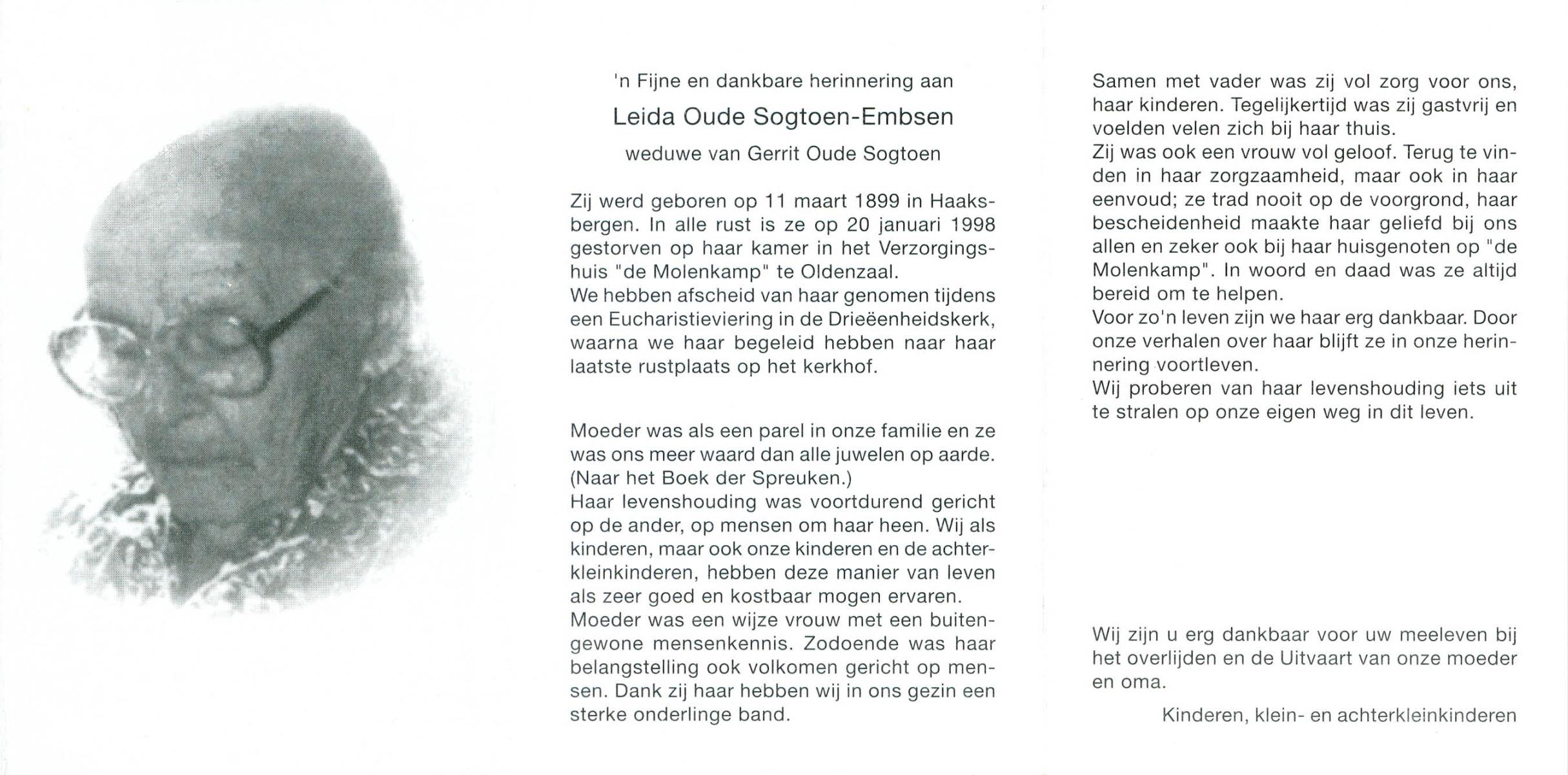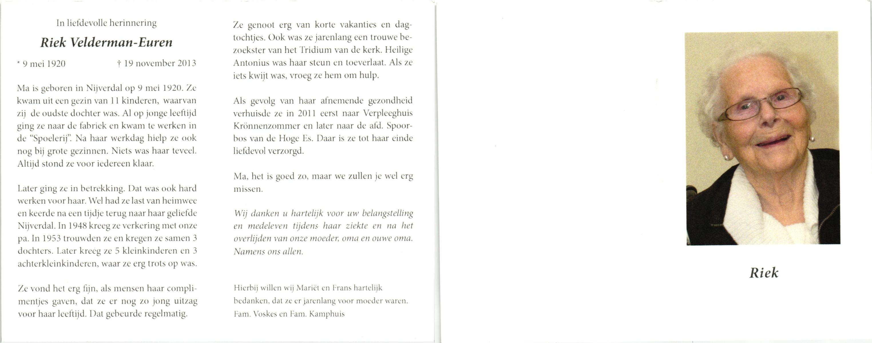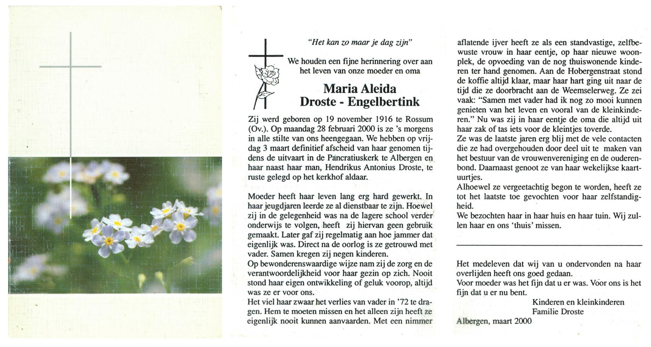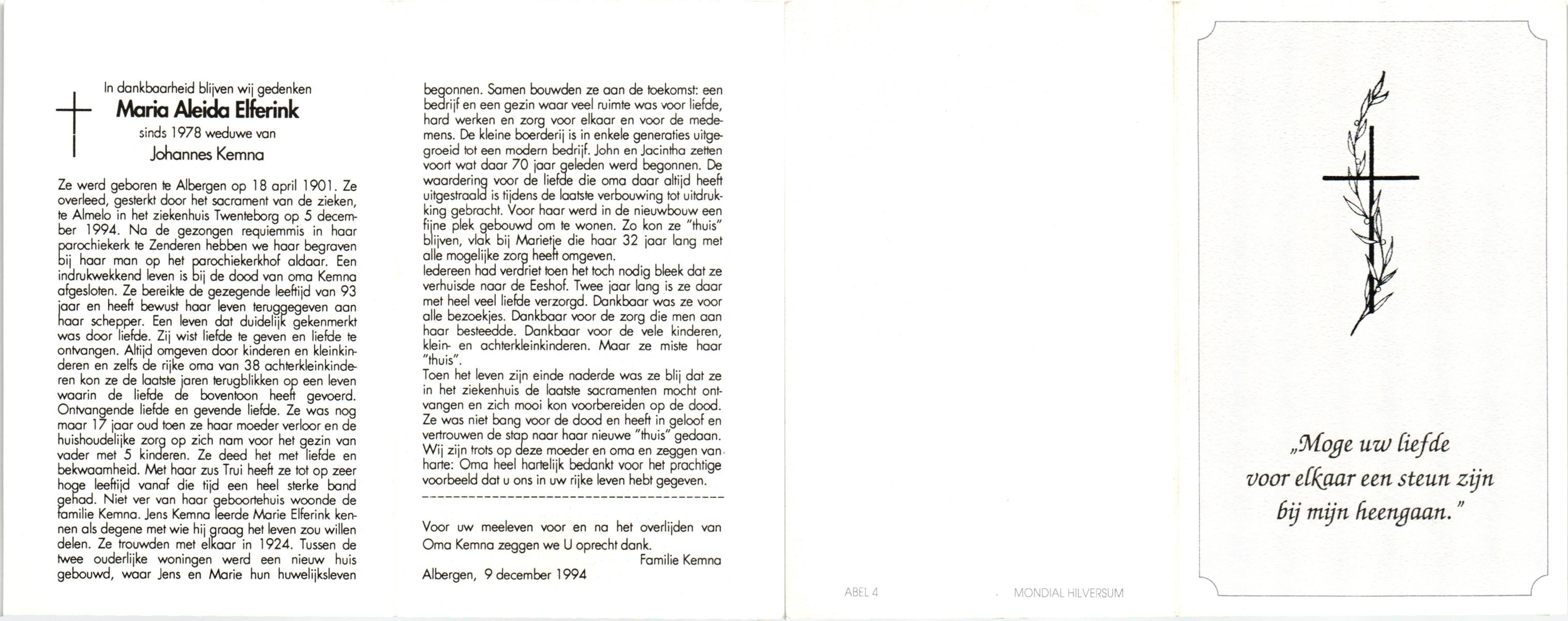ELFERINK, Maria Aleida, geboren op 18-4-1901 te Albergen, overleden op 5-12-1994 te Almelo op 93-jarige leeftijd, begraven te Zenderen.
