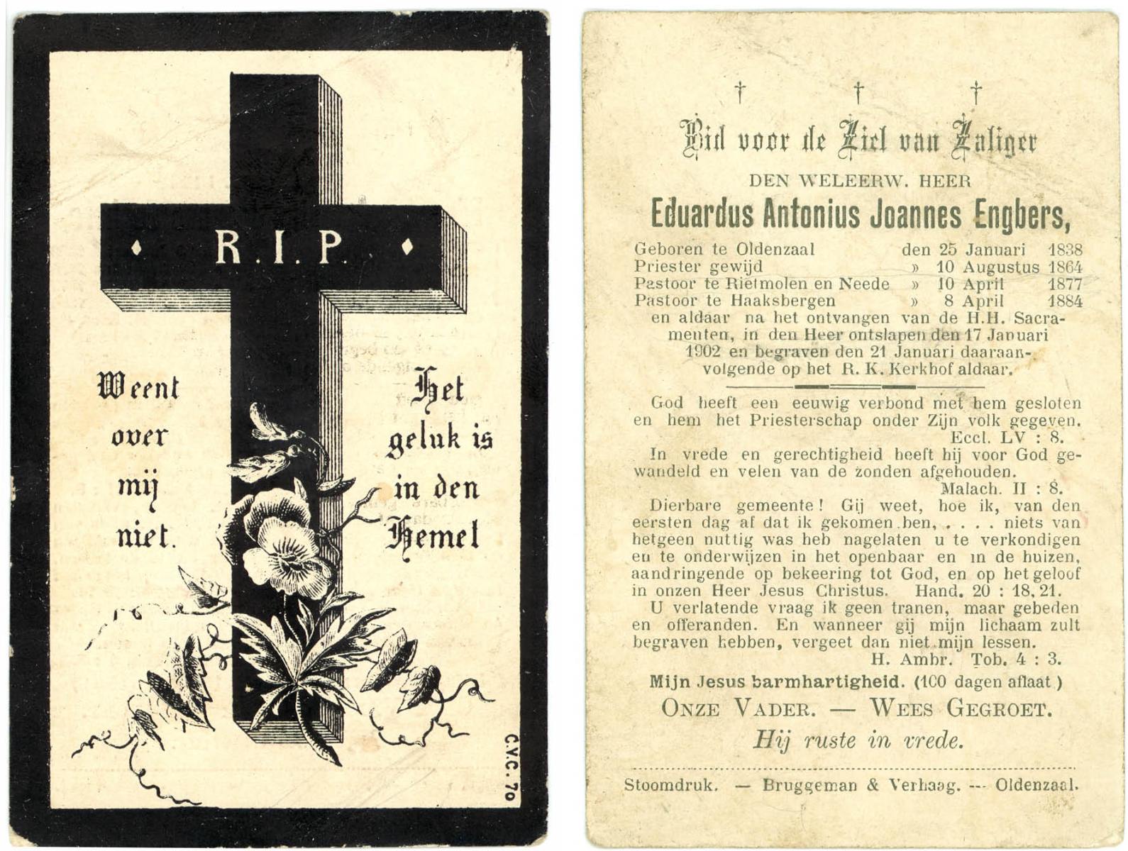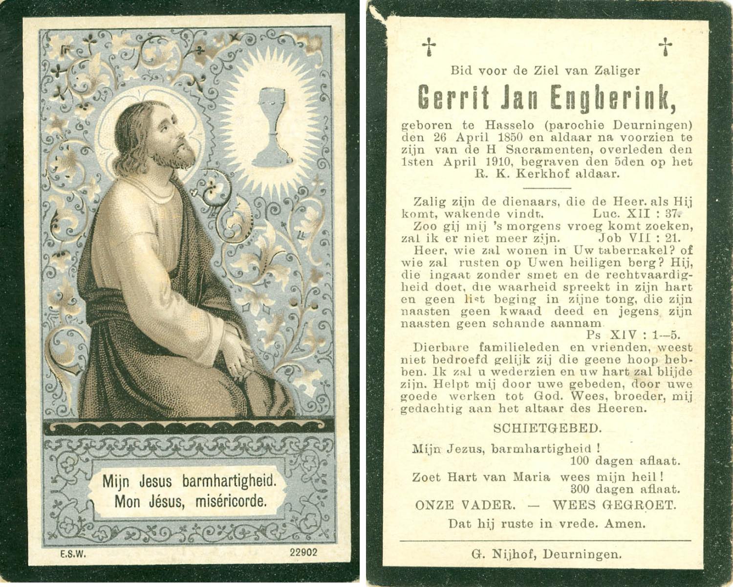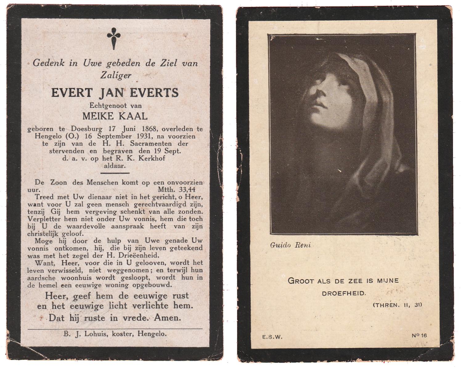EVERTS, Evert Jan, geboren op 17-06-1868 te Doesburg, overleden op 16-9-1931 te Hengelo (Ov.) op 63-jarige leeftijd, begraven op 19-9-1931 te Hengelo (O).