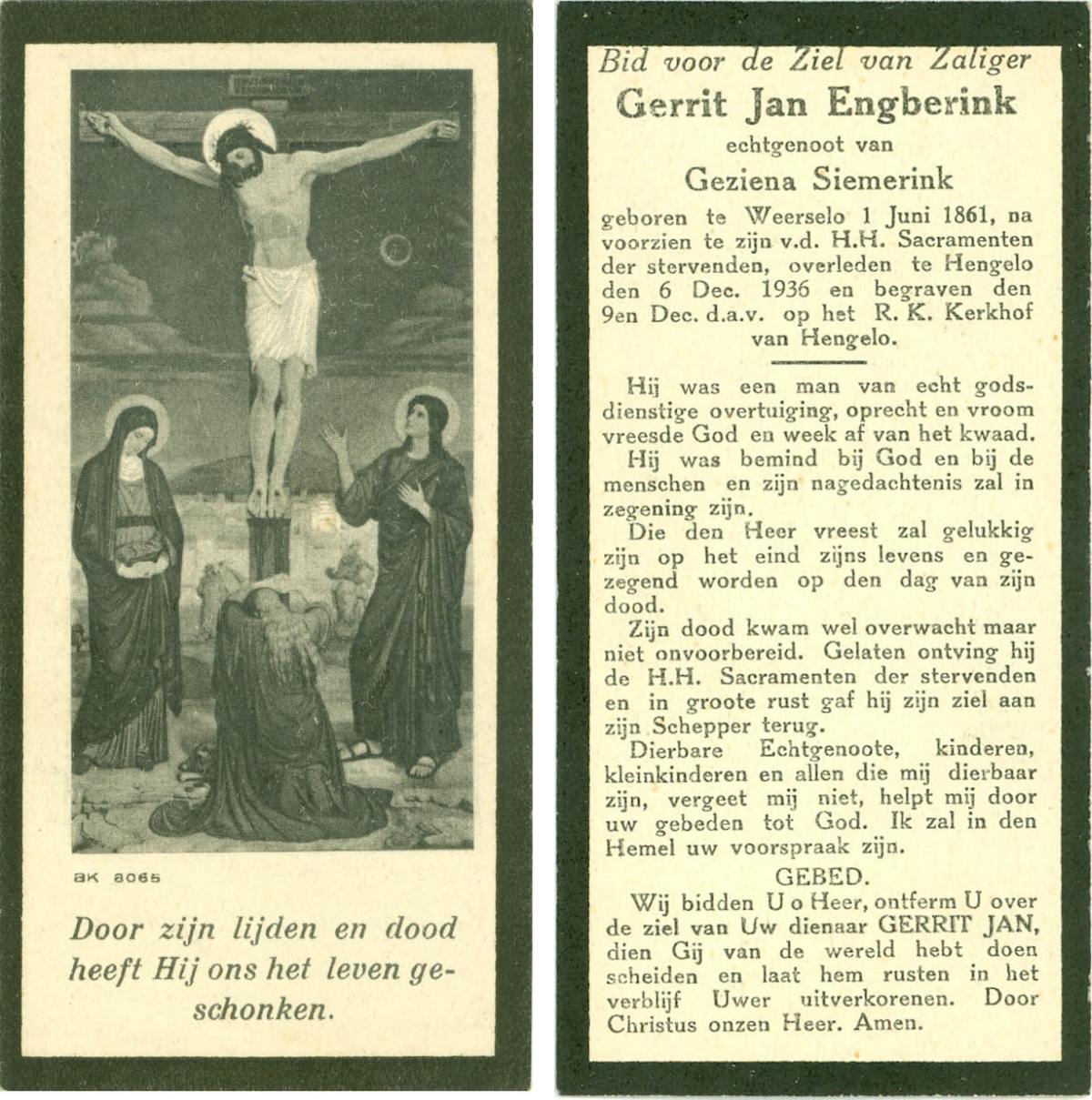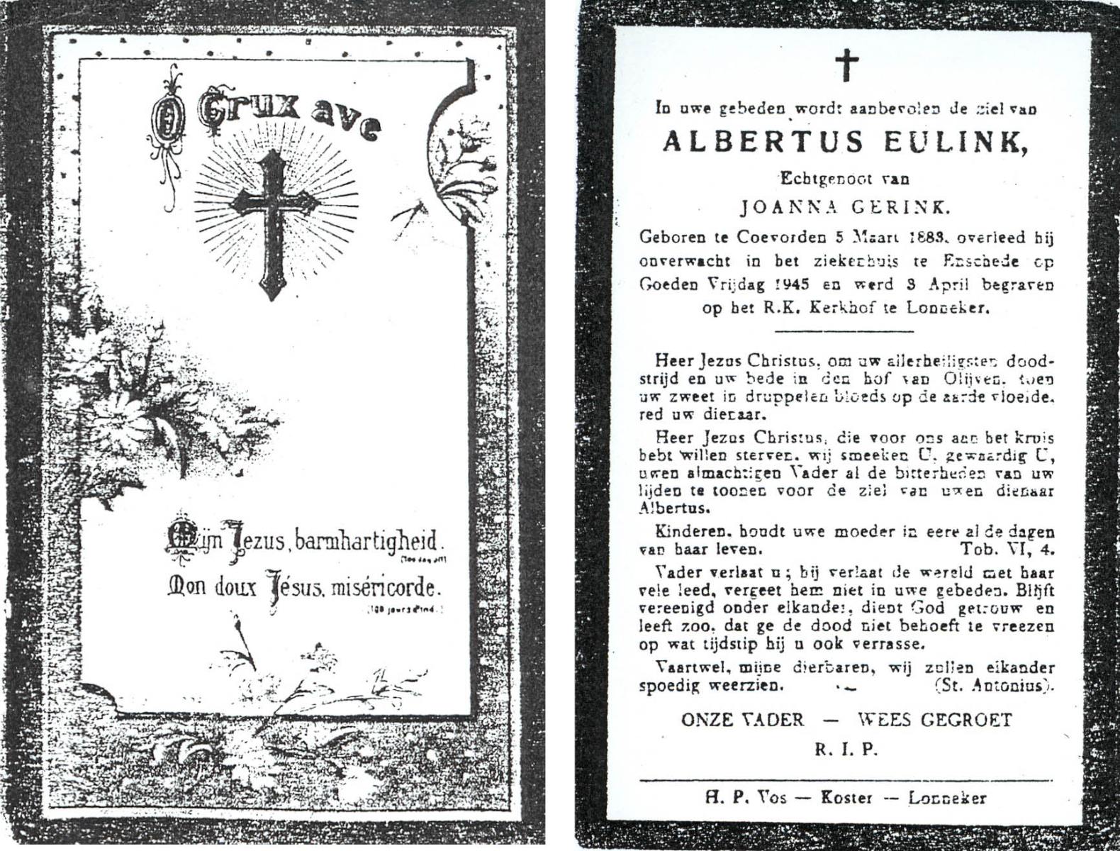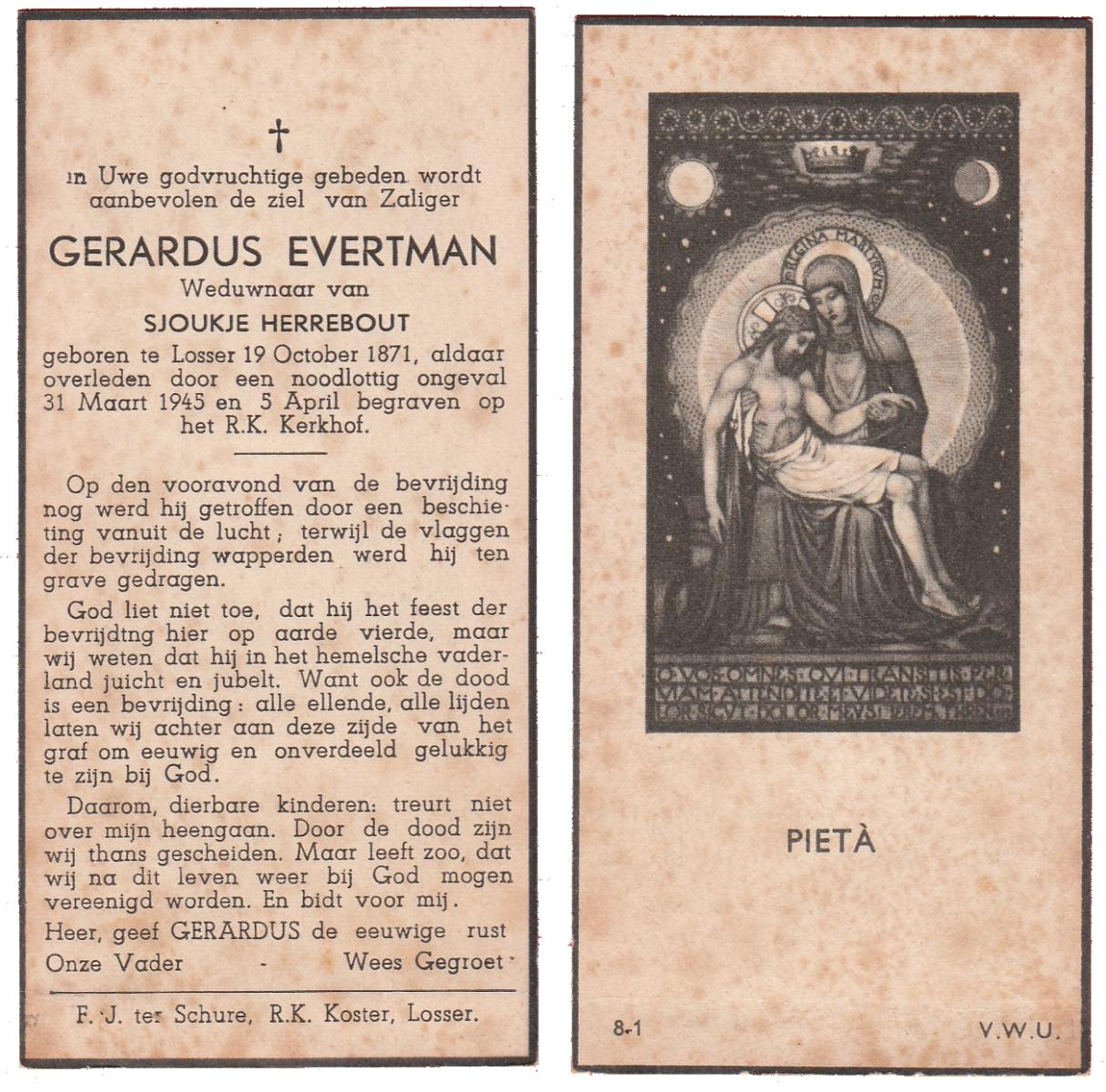 EVERTMAN, Gerardus, geboren op 19-10-1871 te Losser, overleden op 31-3-1945 op 73-jarige leeftijd, begraven op 5-4-1945 te Losser.