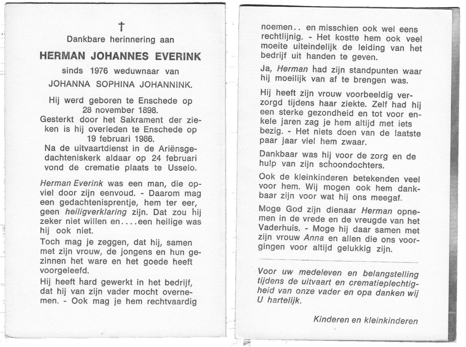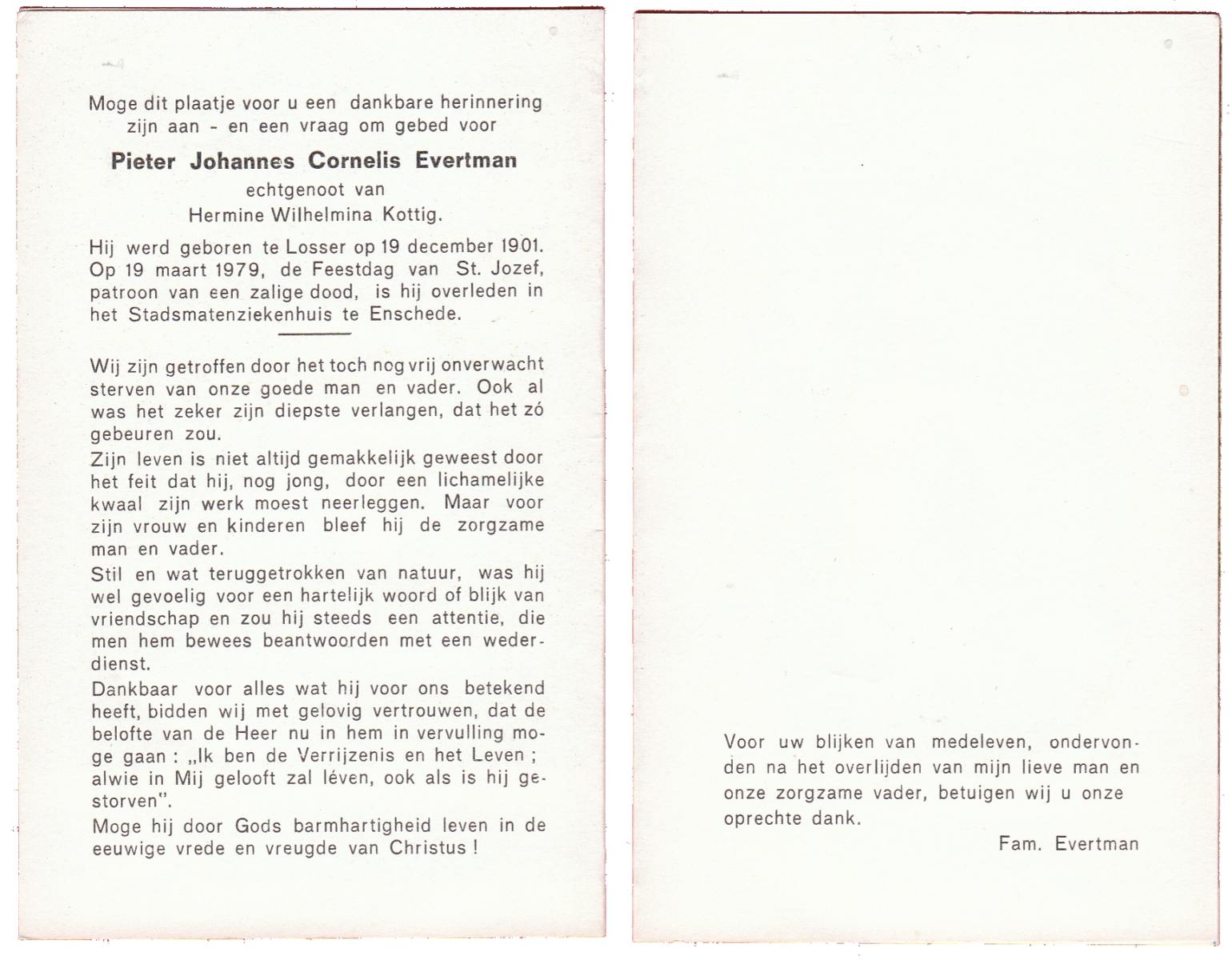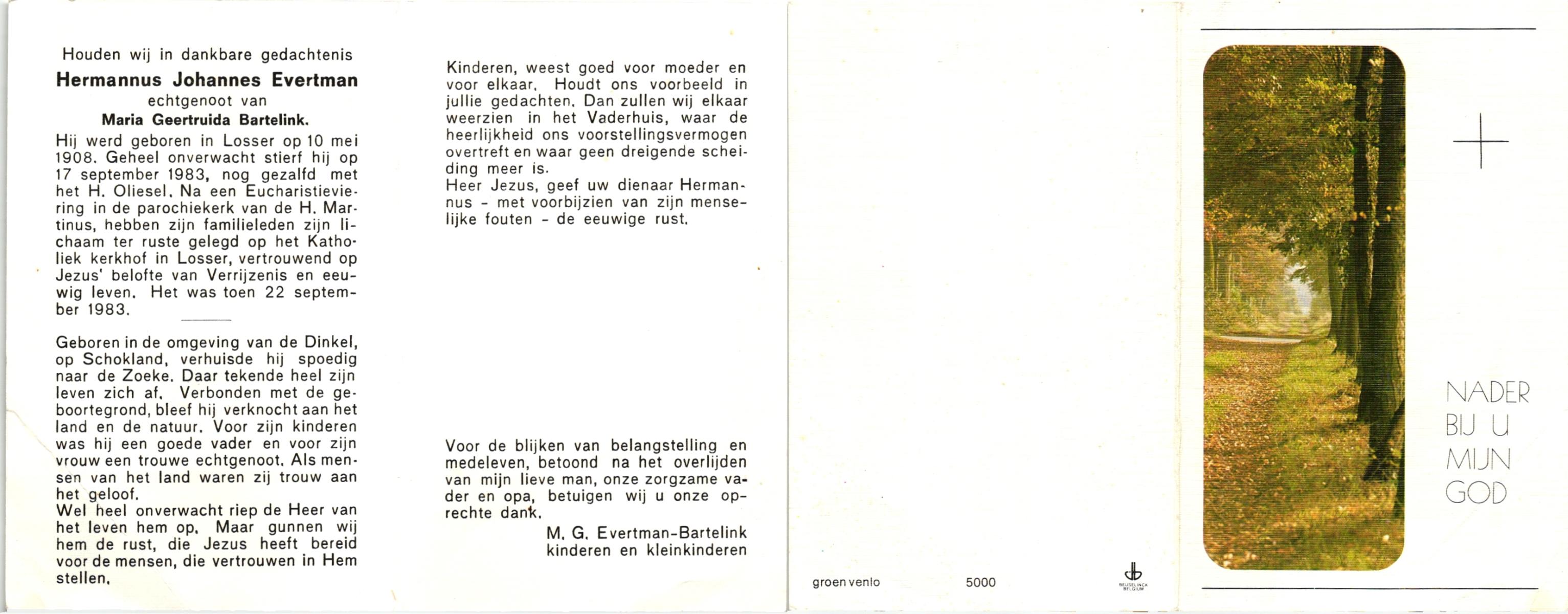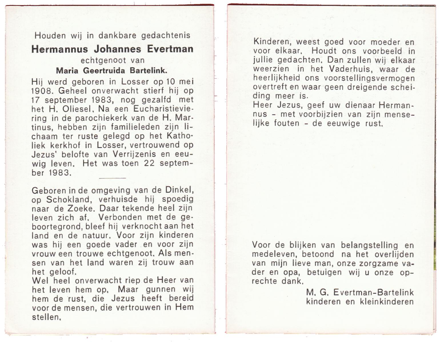 EVERTMAN, Hermannus Johannes, geboren op 10-5-1908 te Losser, overleden op 17-9-1983 op 75-jarige leeftijd, begraven op 22-9-1983 te Losser.