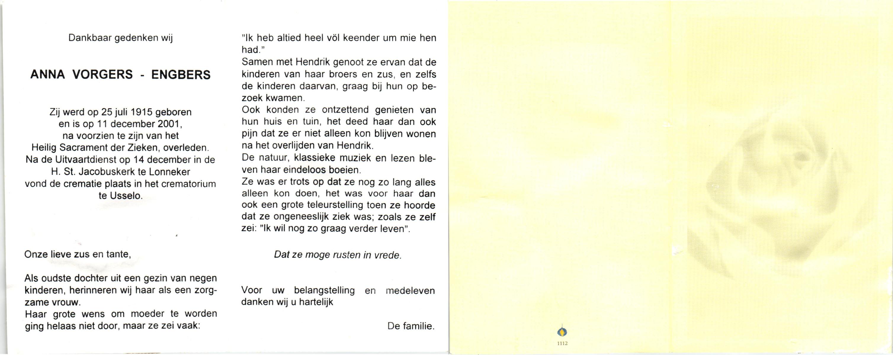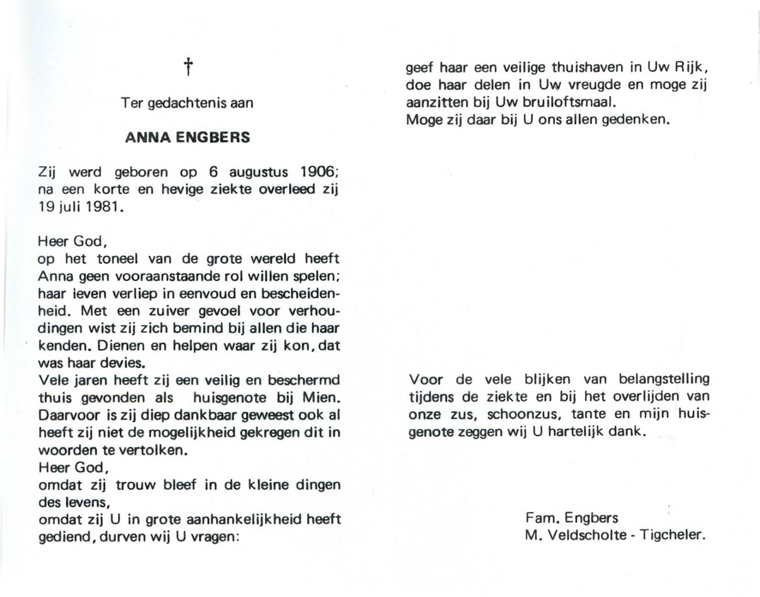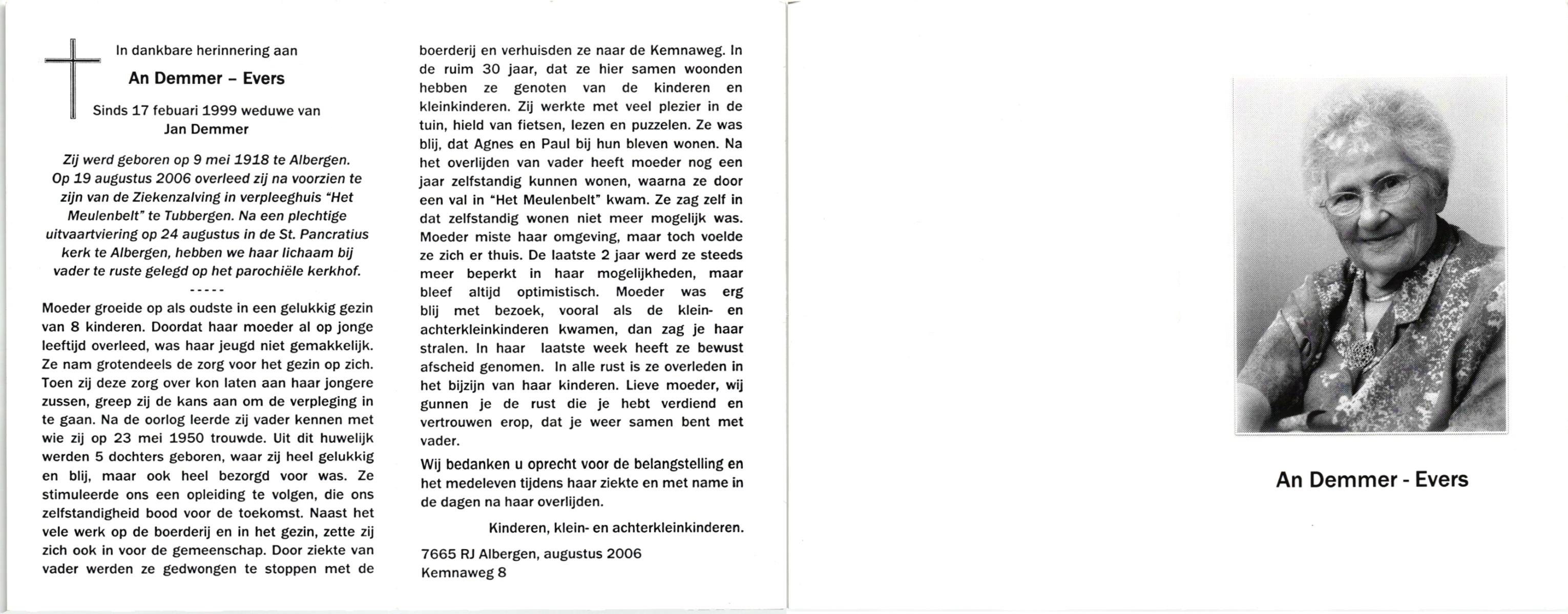 EVERS, , An, geboren op 9-5-1918 te Albergen, overleden op 19-8-2006 te Tubbergen op 88-jarige leeftijd, begraven op 24-8-2006 te Albergen.