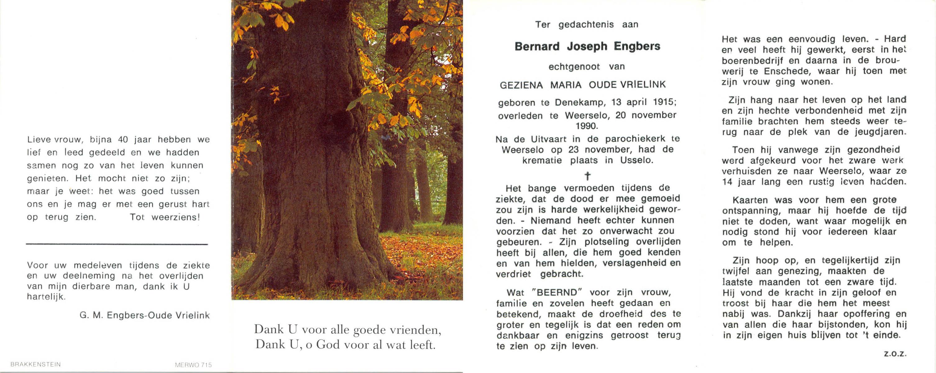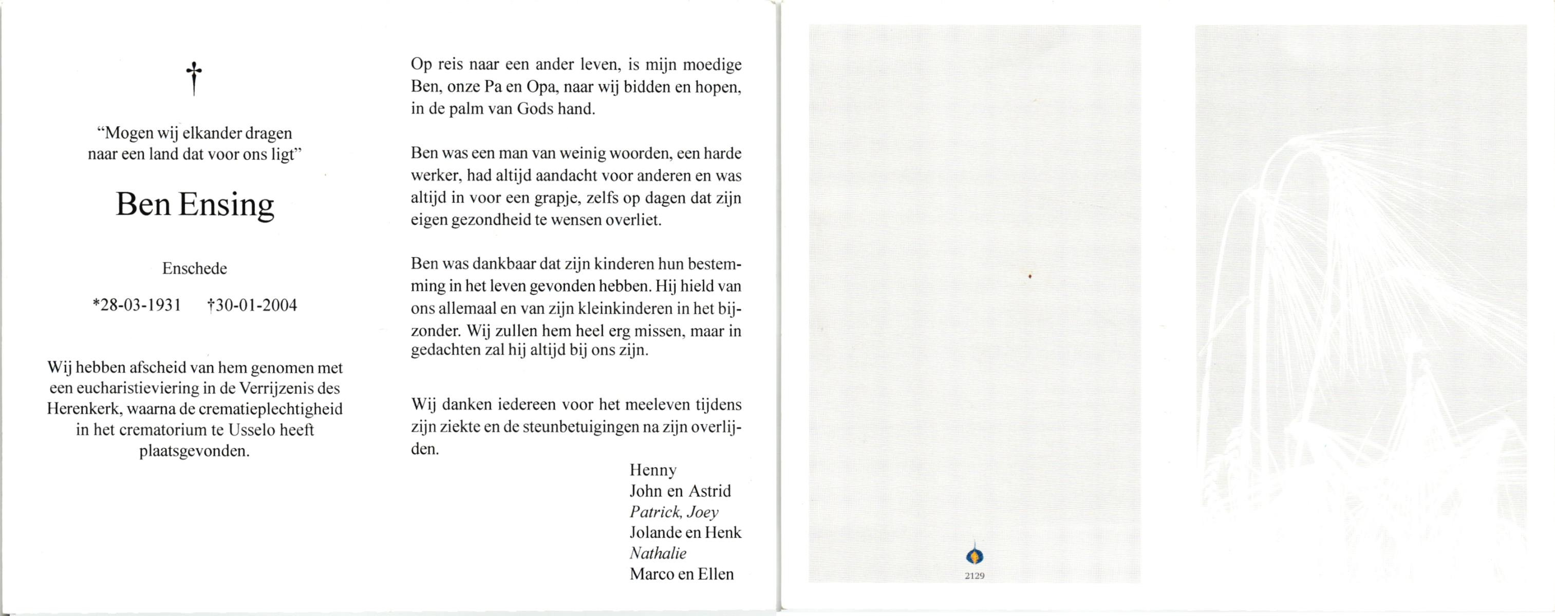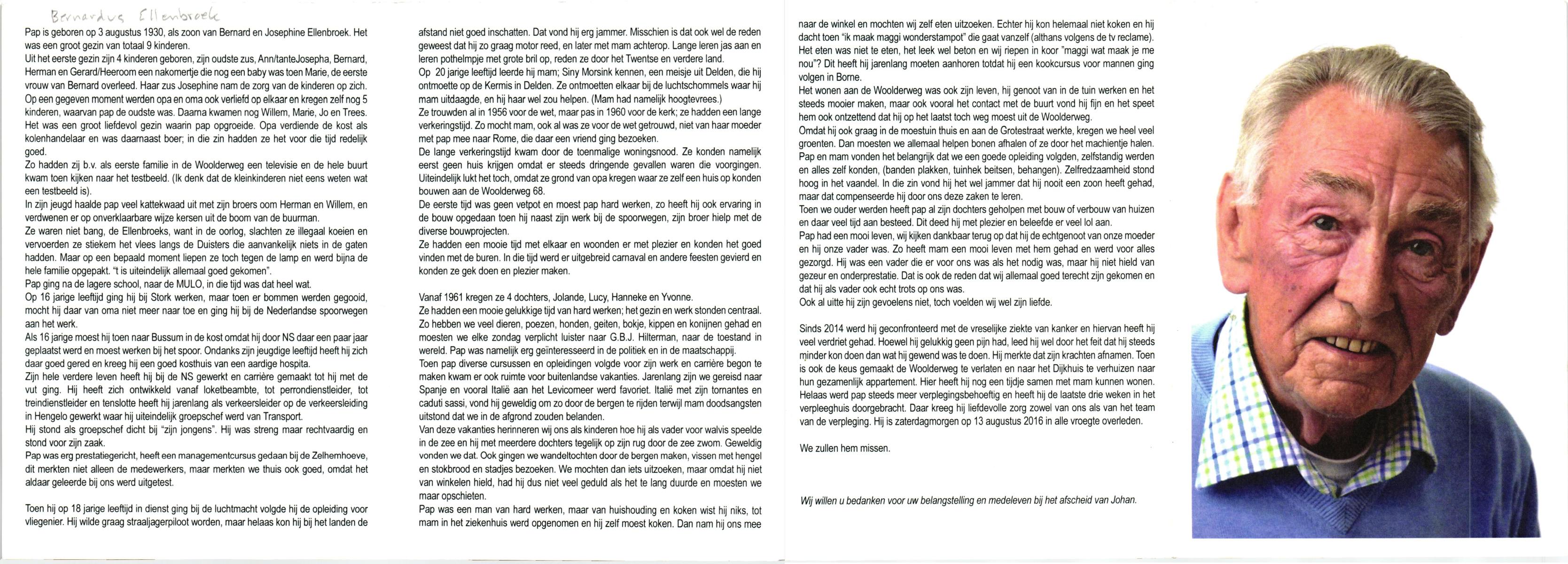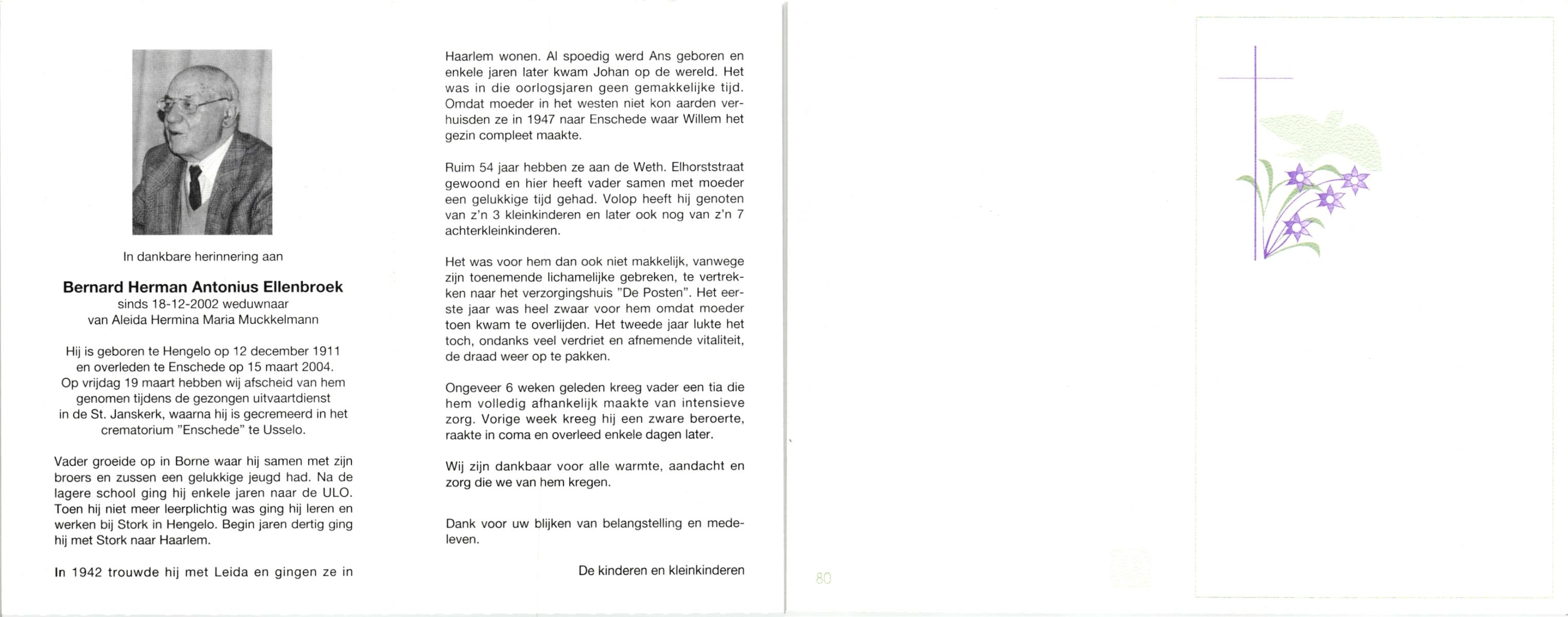 ELLENBROEK, , Bernard Herman Antonius, geboren op 12-12-1911 te Hengelo (O), overleden op 15-3-2004 te Enschede op 92-jarige leeftijd, gecremeerd op 19-3-2004 te Usselo.