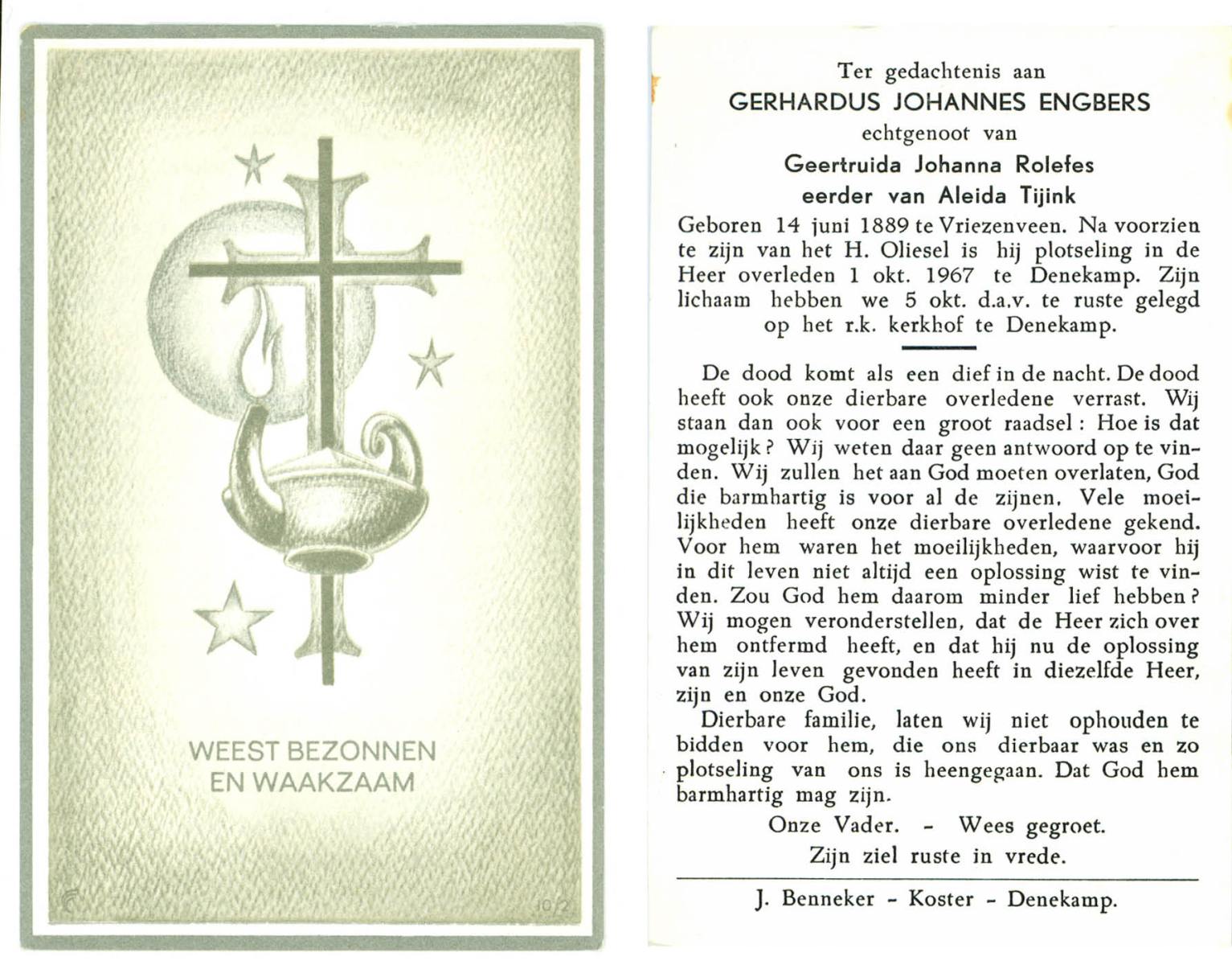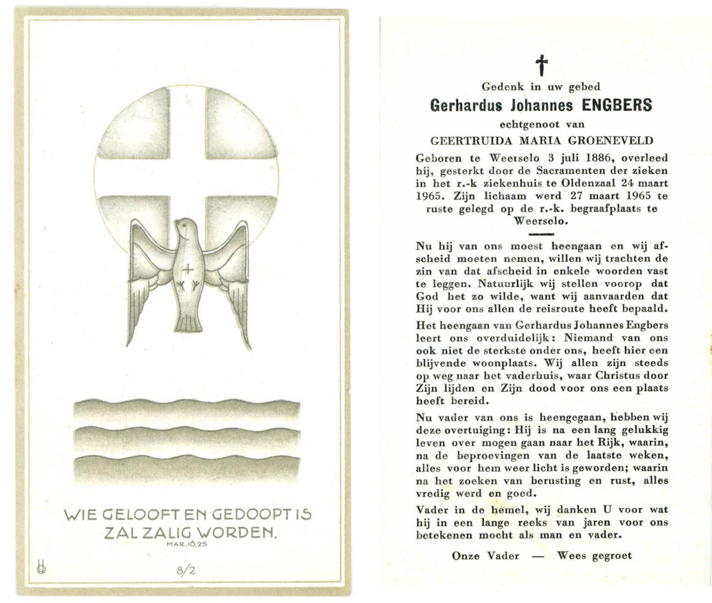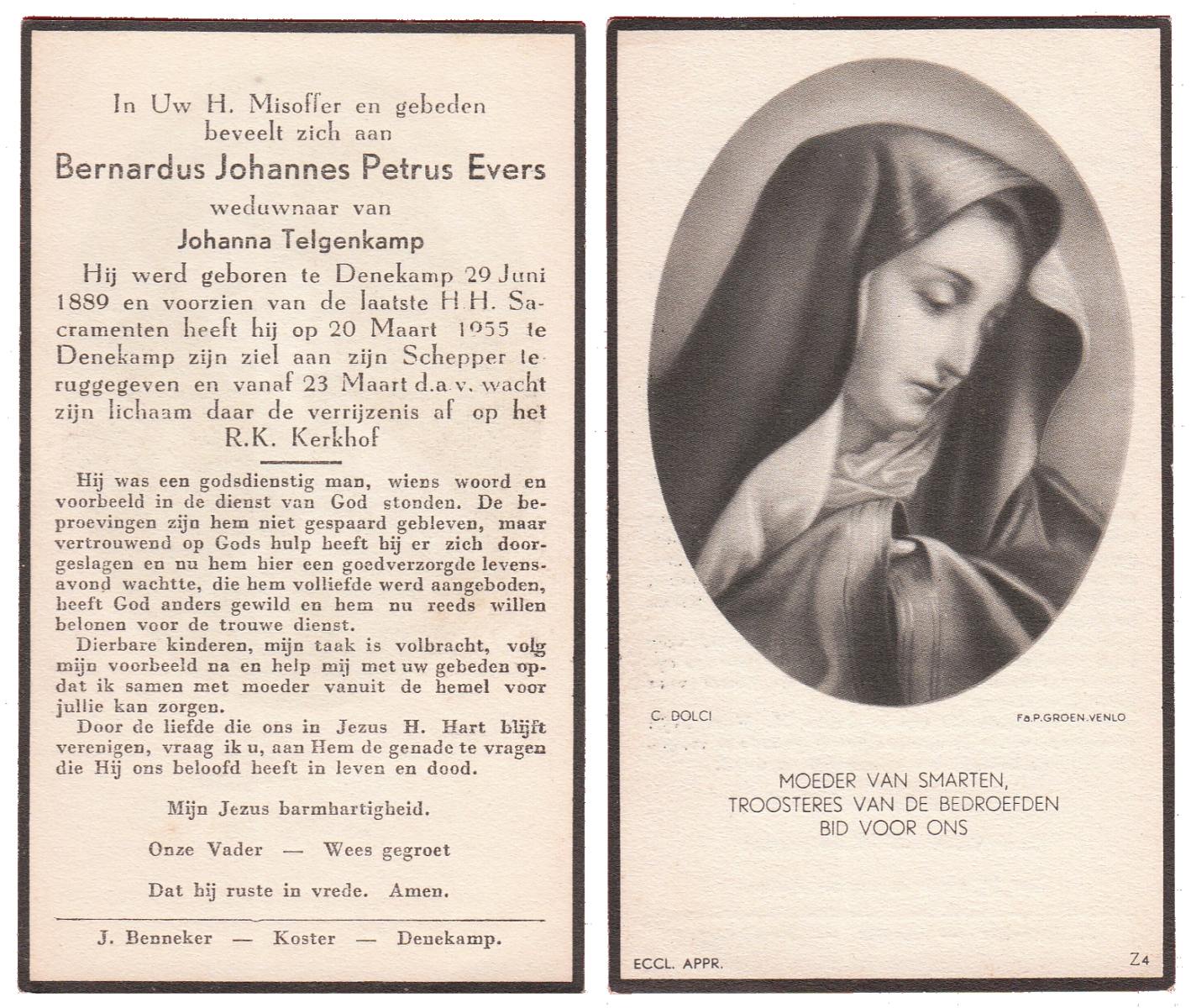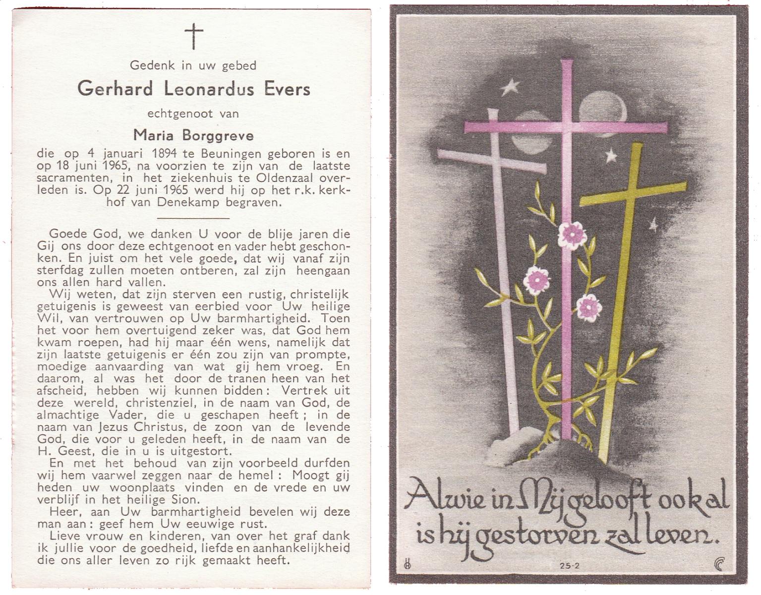 EVERS, Gerhard Leonardus, geboren op 04-01-1894 te Beuningen (Ov.), overleden op 18-6-1965 te Oldenzaal op 71-jarige leeftijd, begraven op 22-6-1965 te Denekamp.