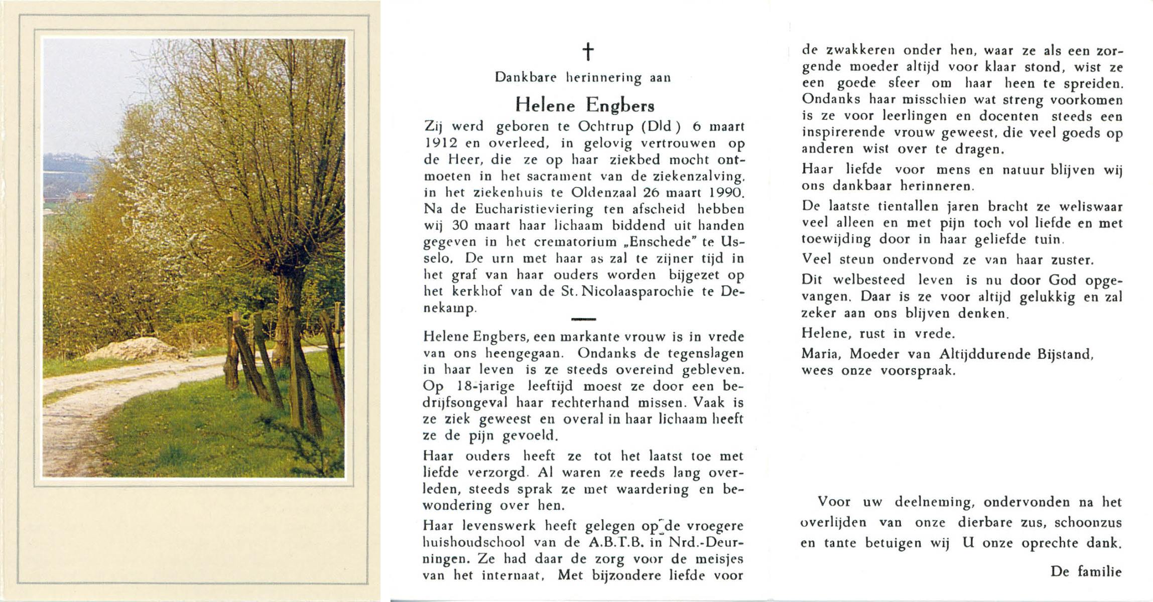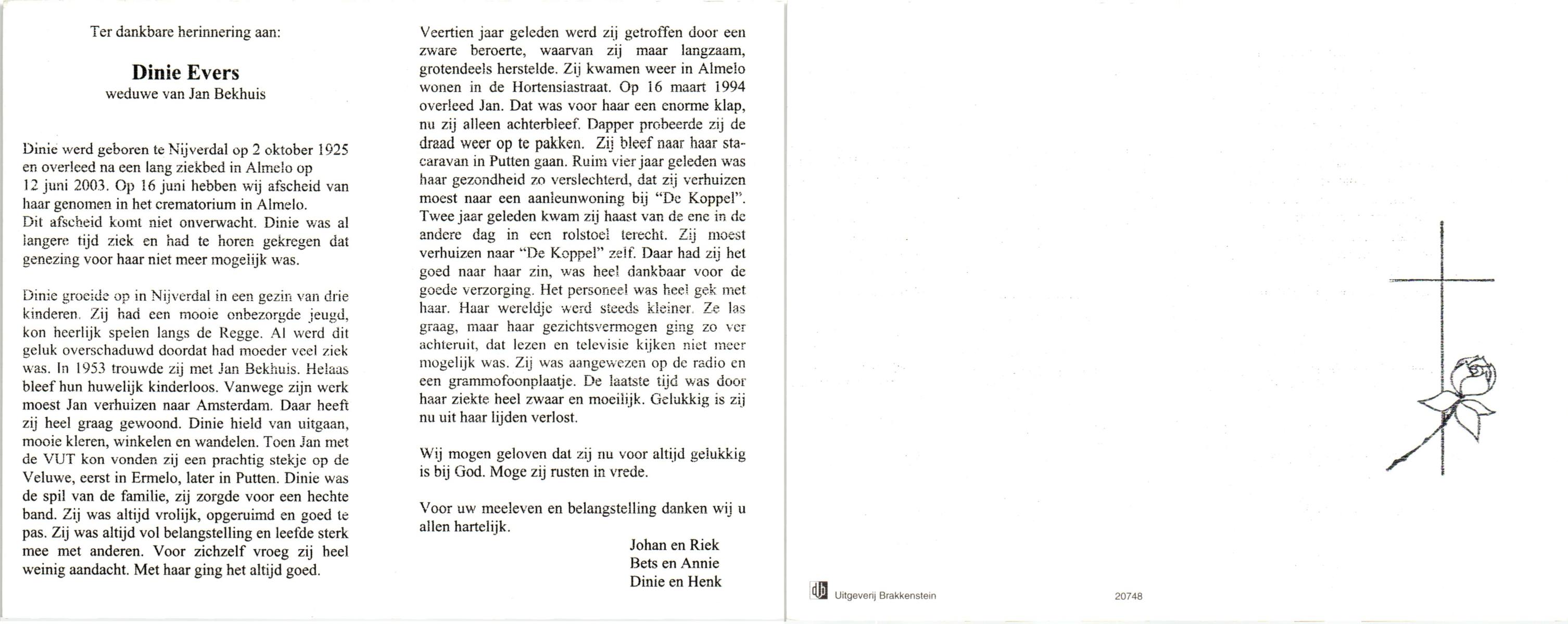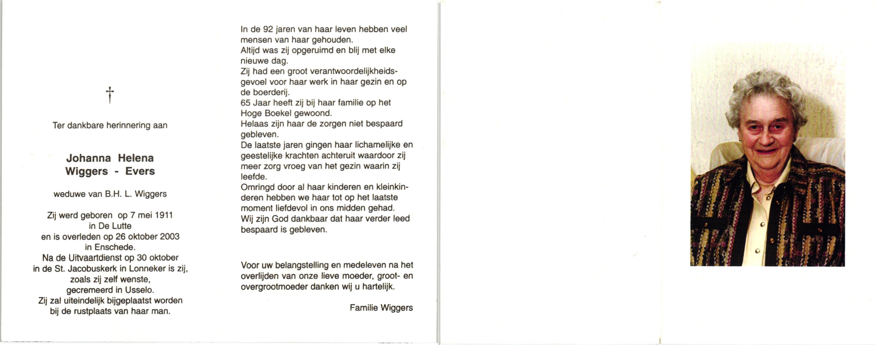 EVERS, , Johanna Helena, geboren op 7-5-1911 te De Lutte, overleden op 26-10-2003 te Enschede op 92-jarige leeftijd, gecremeerd op 30-10-2003 te Usselo.