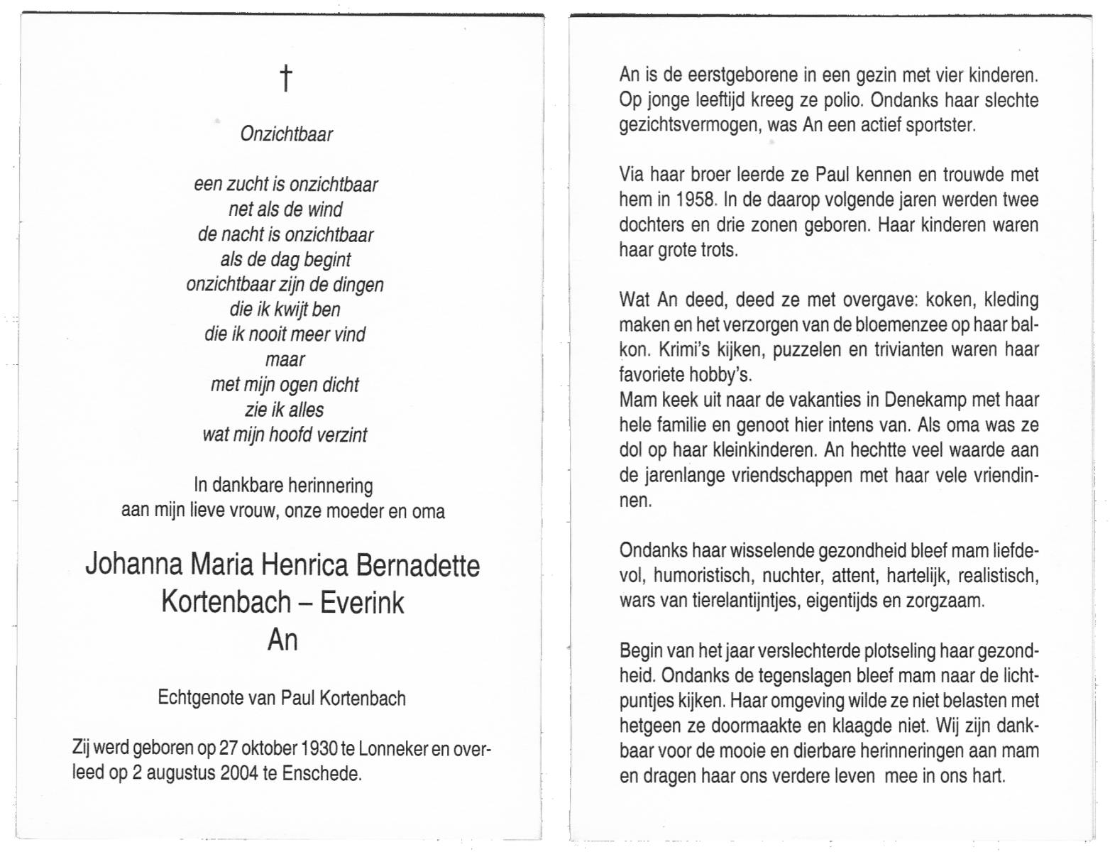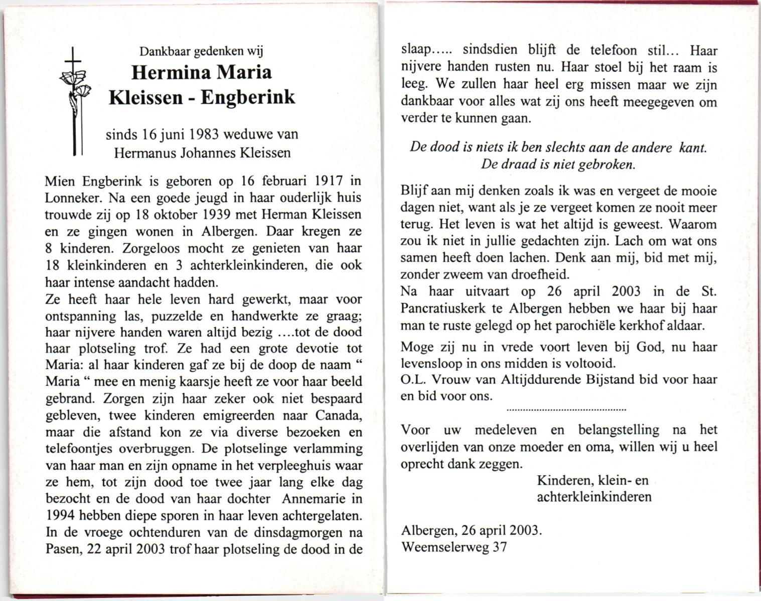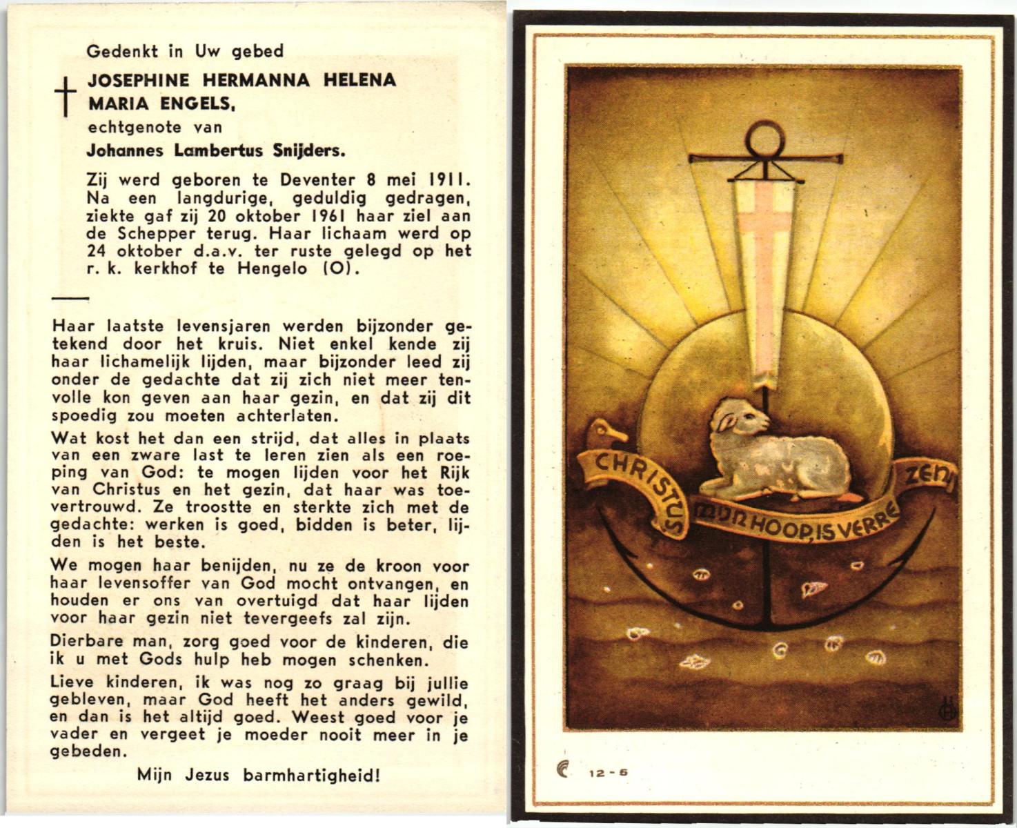 EVERS, , Johanna Helena, geboren op 7-5-1911 te De Lutte, overleden op 26-10-2003 te Enschede op 92-jarige leeftijd, gecremeerd op 30-10-2003 te Usselo.
