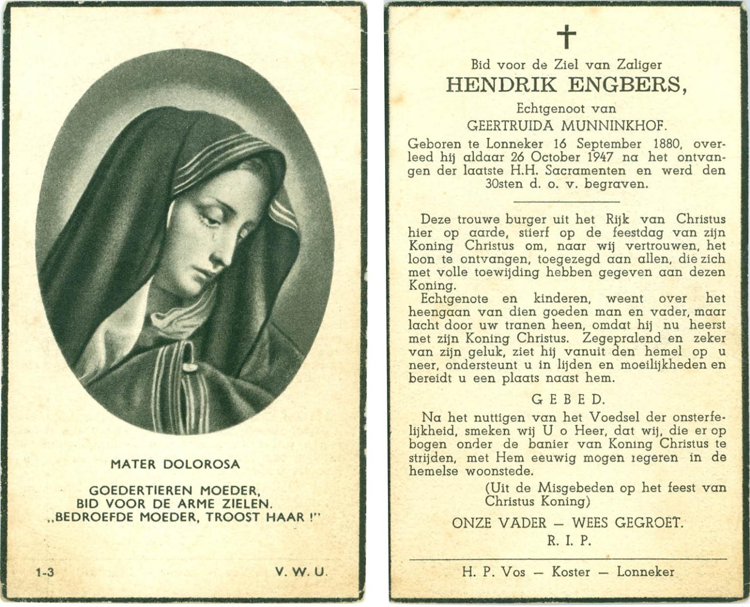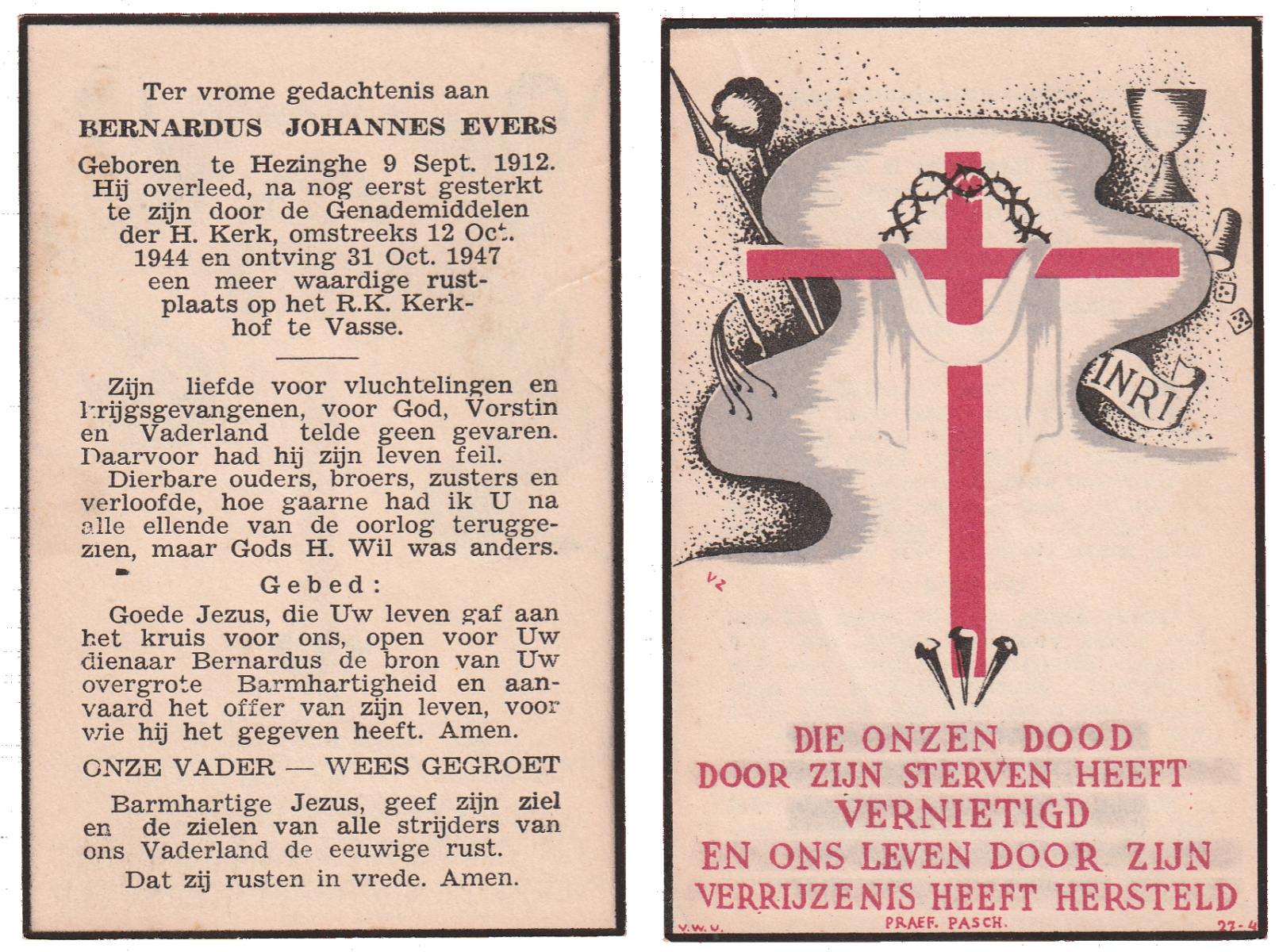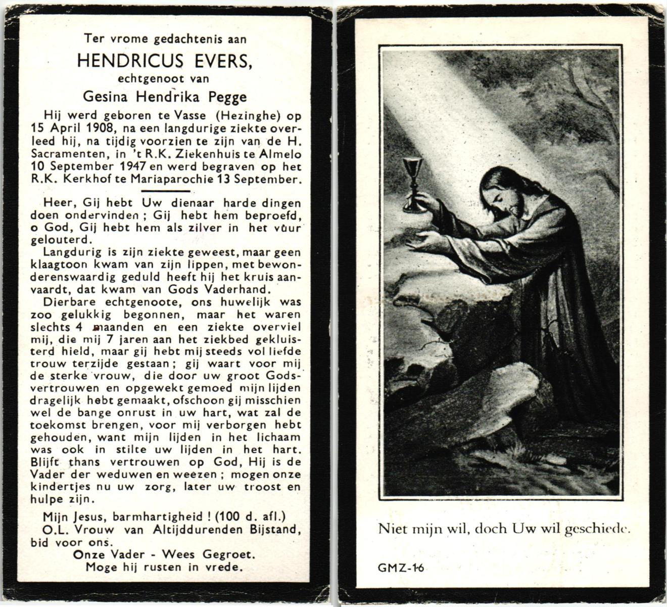 EVERS, Hendricus, geboren op 15-4-1908 te Hezinge, Vasse, overleden op 10-9-1947 te Almelo, ziekenhuis op 39-jarige leeftijd, begraven op 13-9-1947 te Mariaparochie.